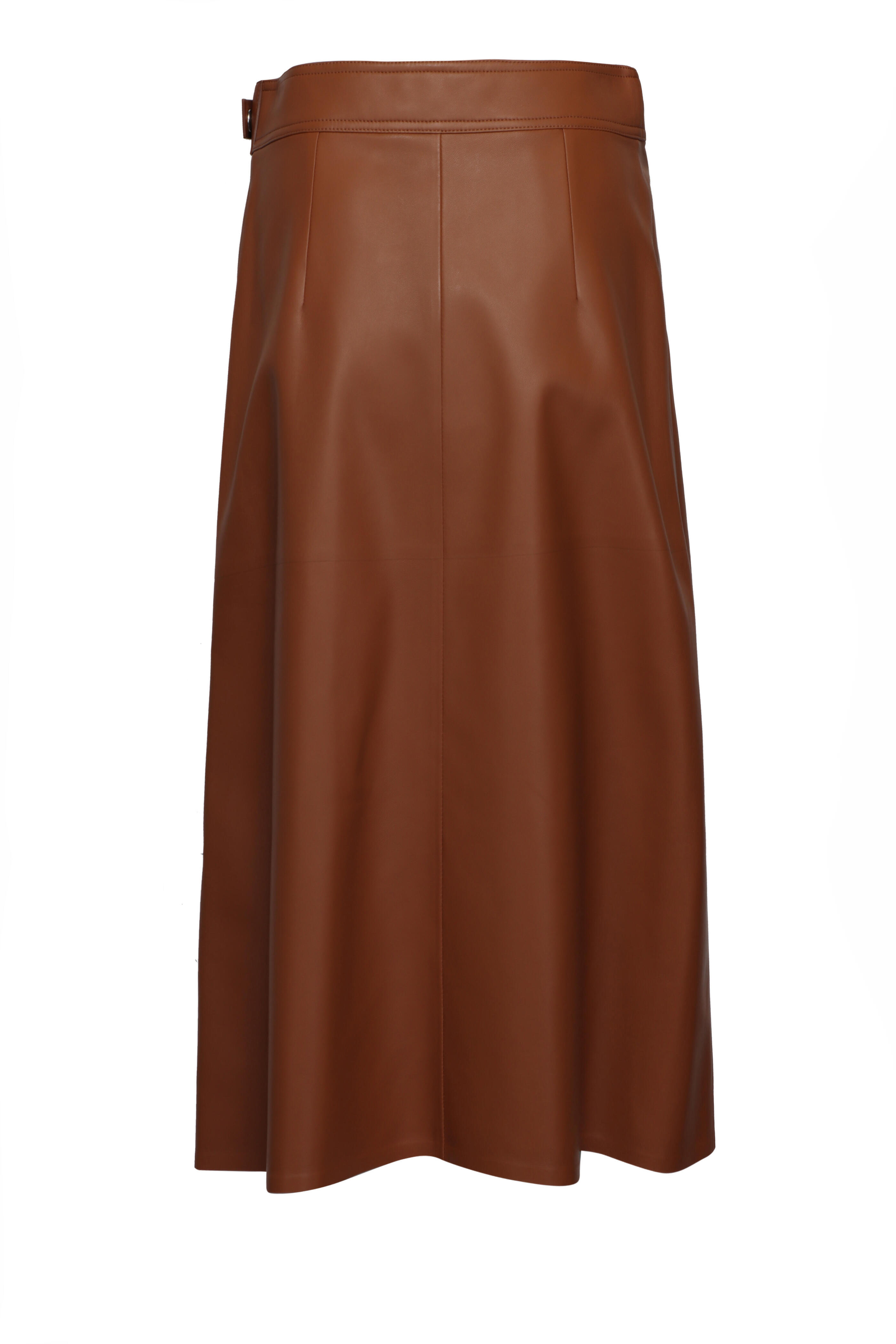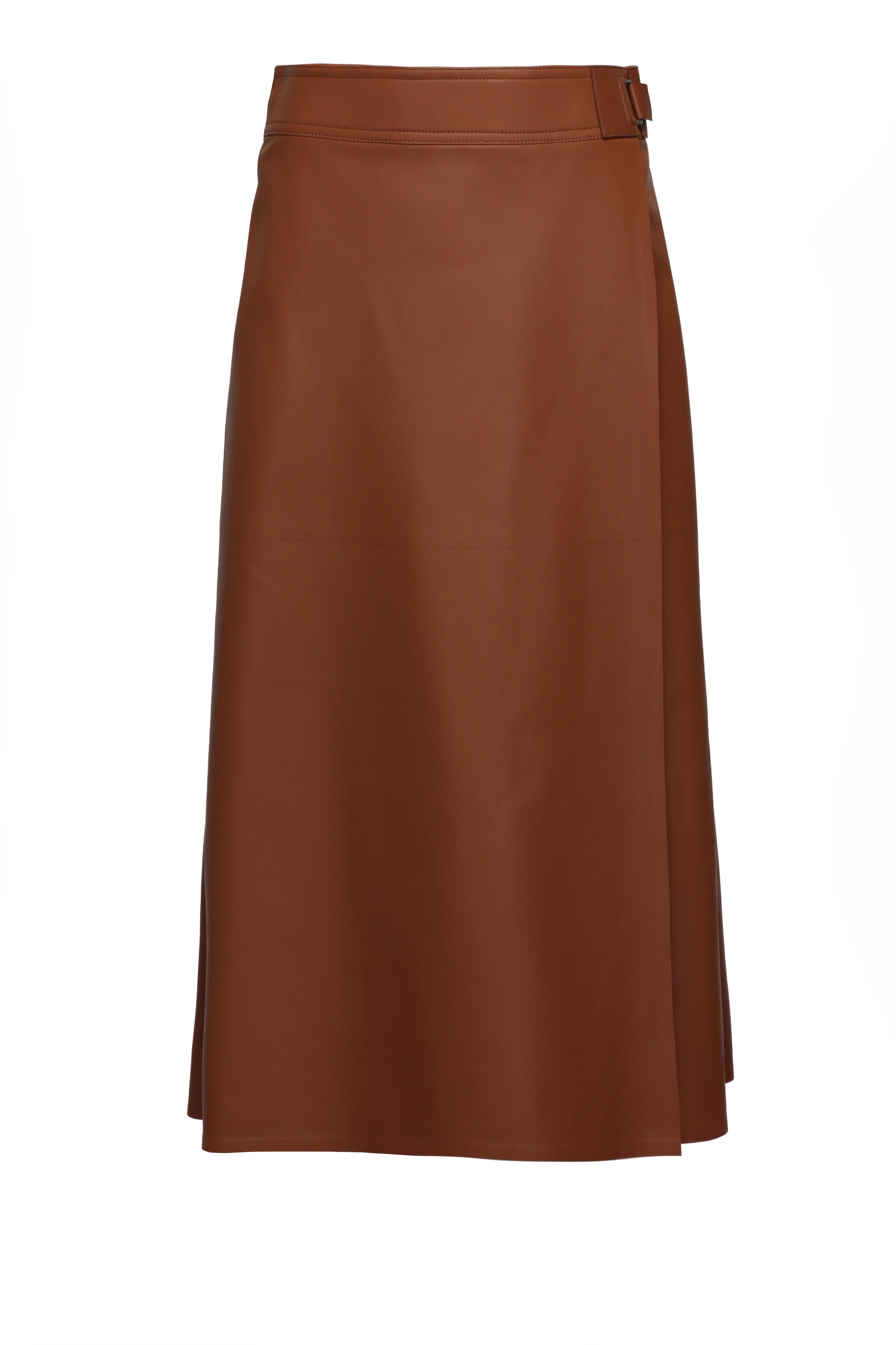 High rise. Banded waist. Wrap style; snap tab closure. Aline silhouette. Made in Italy. Length 26.5” (all sizes). Knee length. 100% leather. Dry clean with leather specialist.