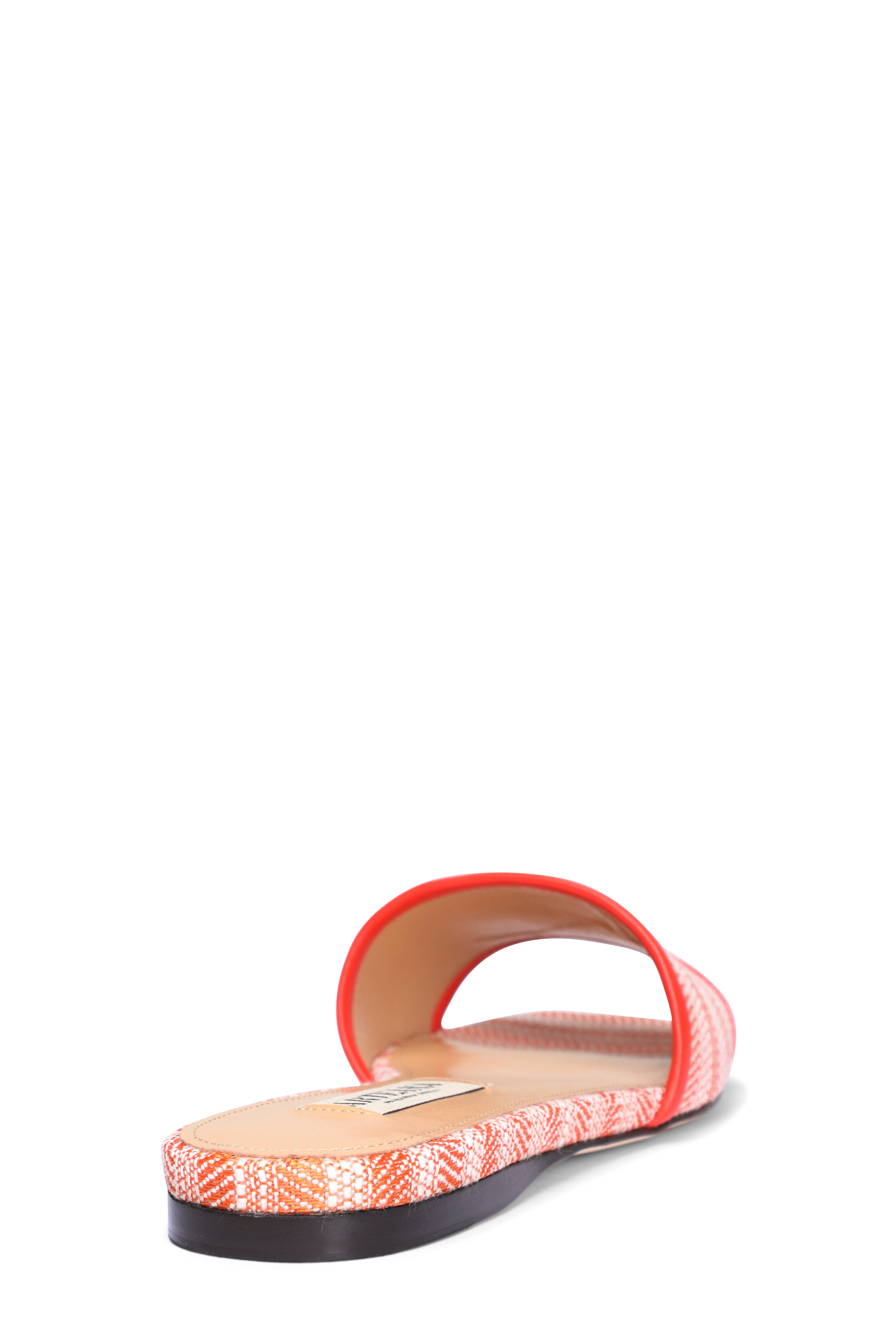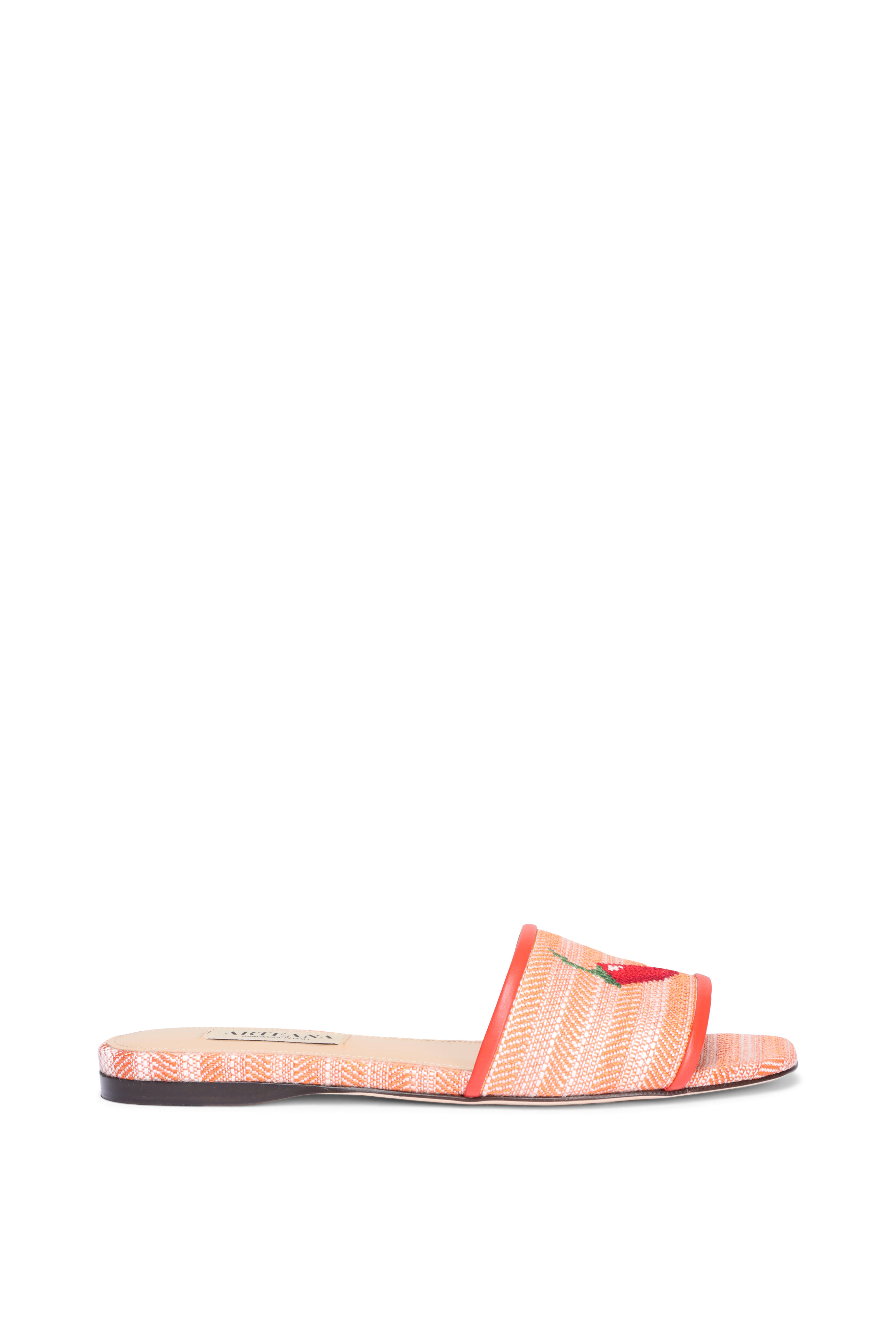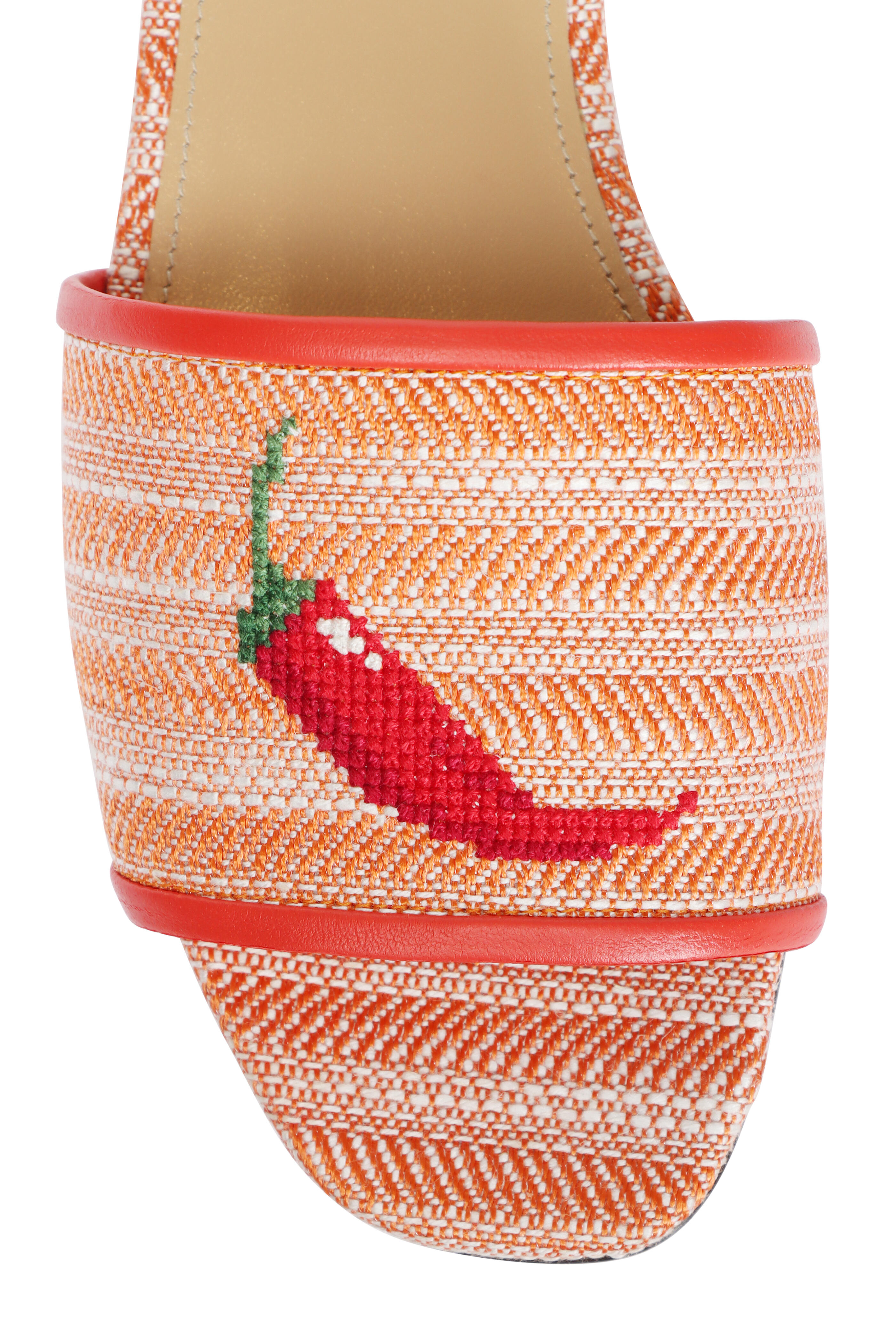 Textile and leather upper. Leather lining and sole. Open toe. Embroidered chili pepper design on vamp. Slip-on style. Made in Italy.
