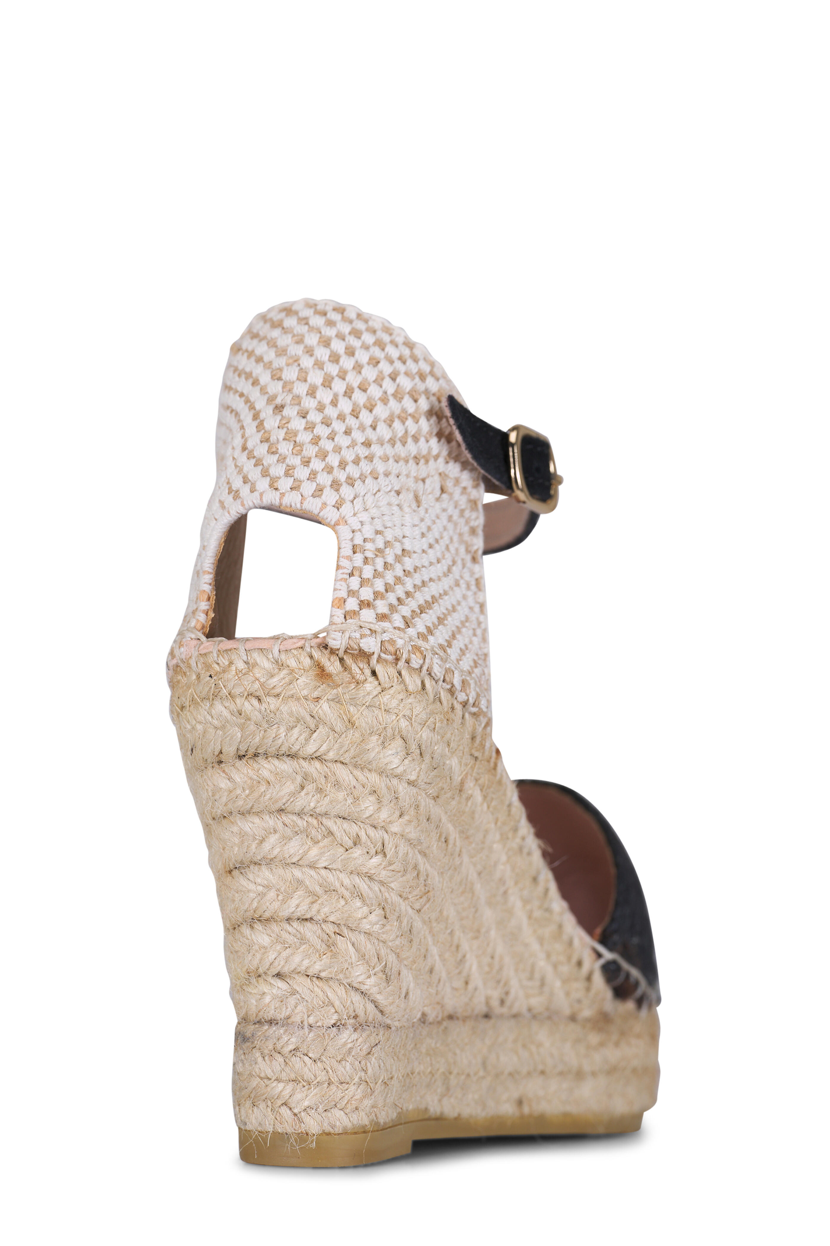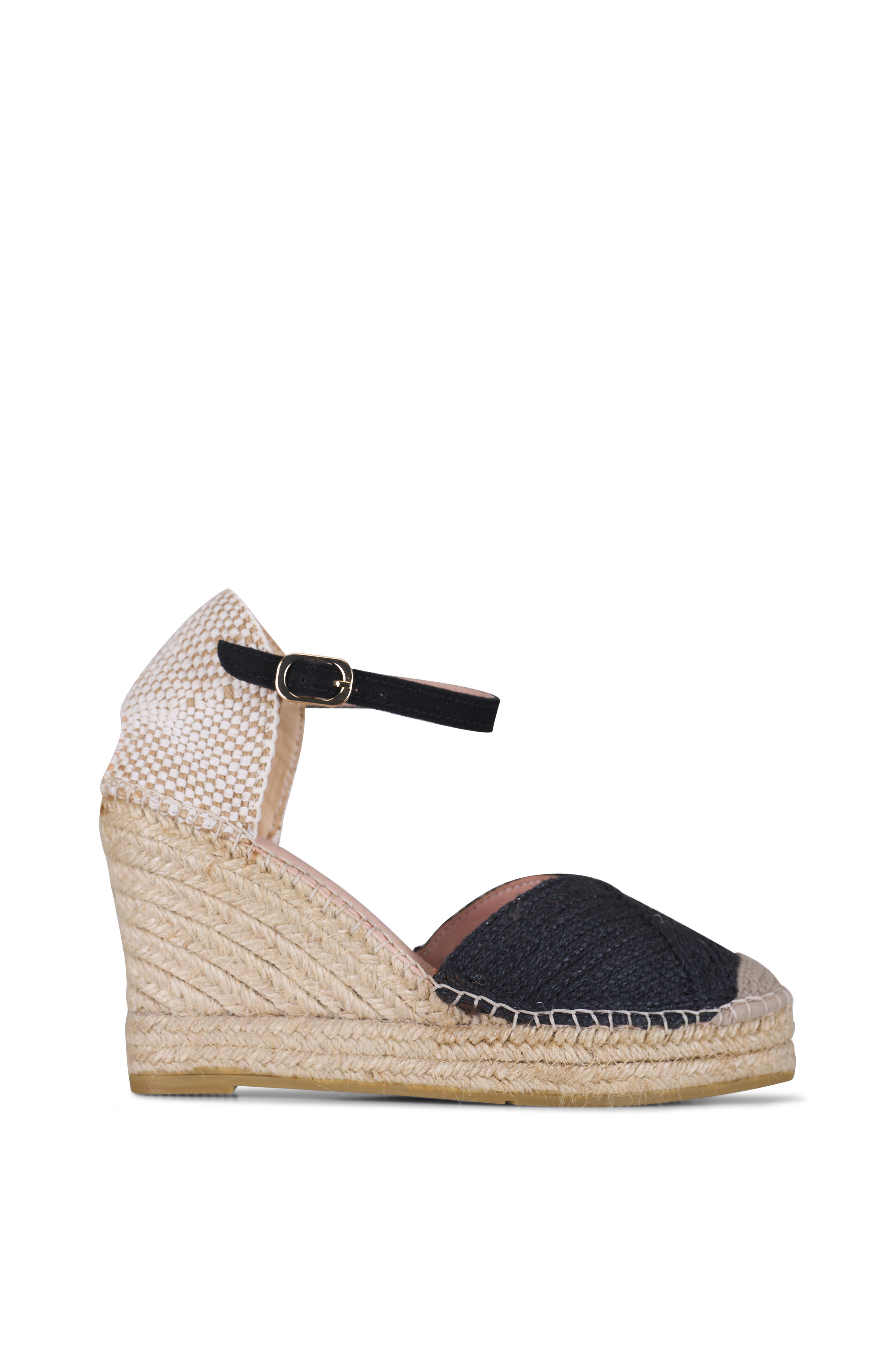 Braided raffia upper. Almond toe. Adjustable buckle ankle strap. Antibacterial microfiber lining. Jute wrapped platform. Pillow cushioning midsole. Rubber sole. Made in Spain. Heel: 3 1/4 Inch. Wedge: 1 1/4 Inch.