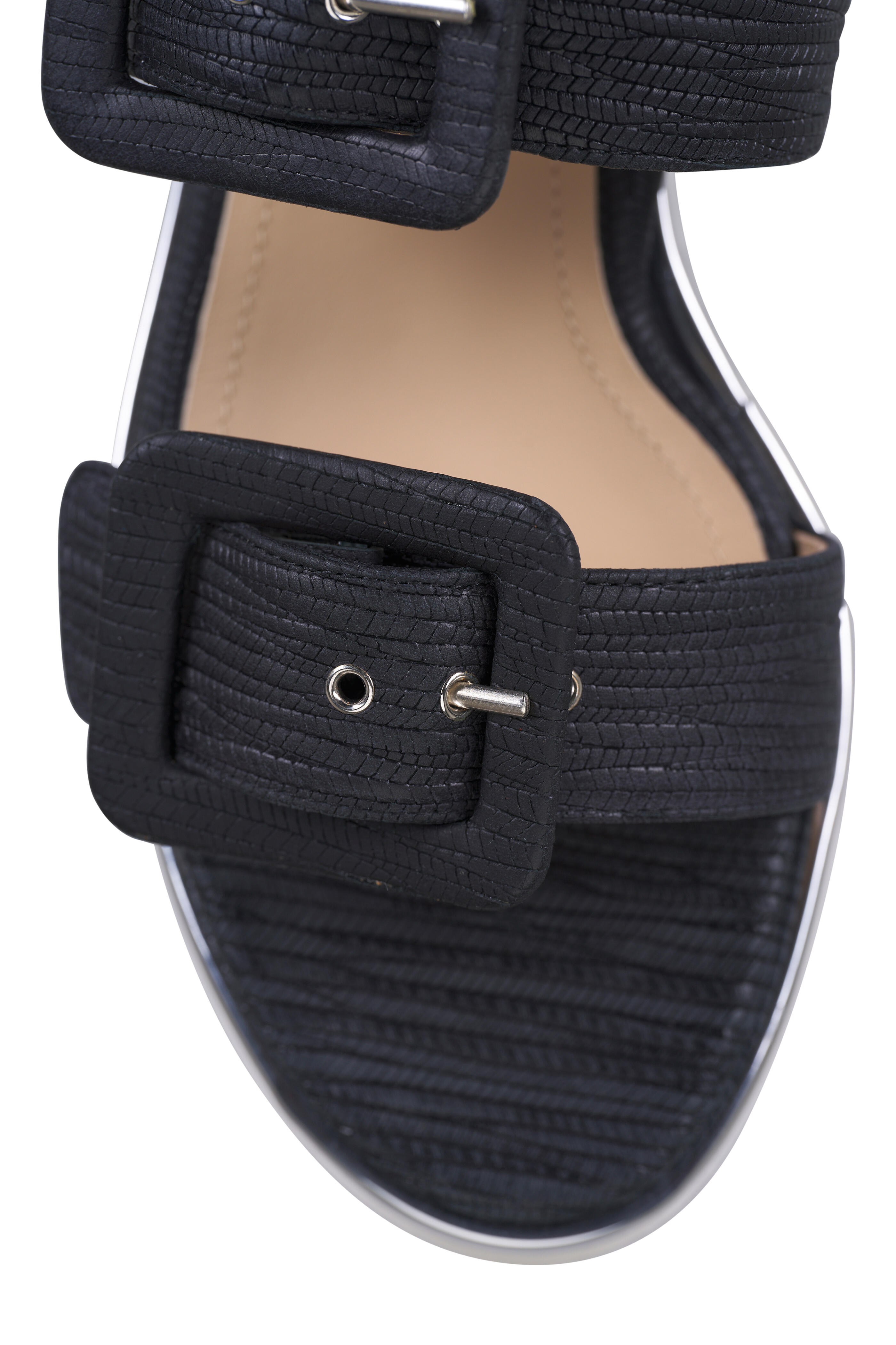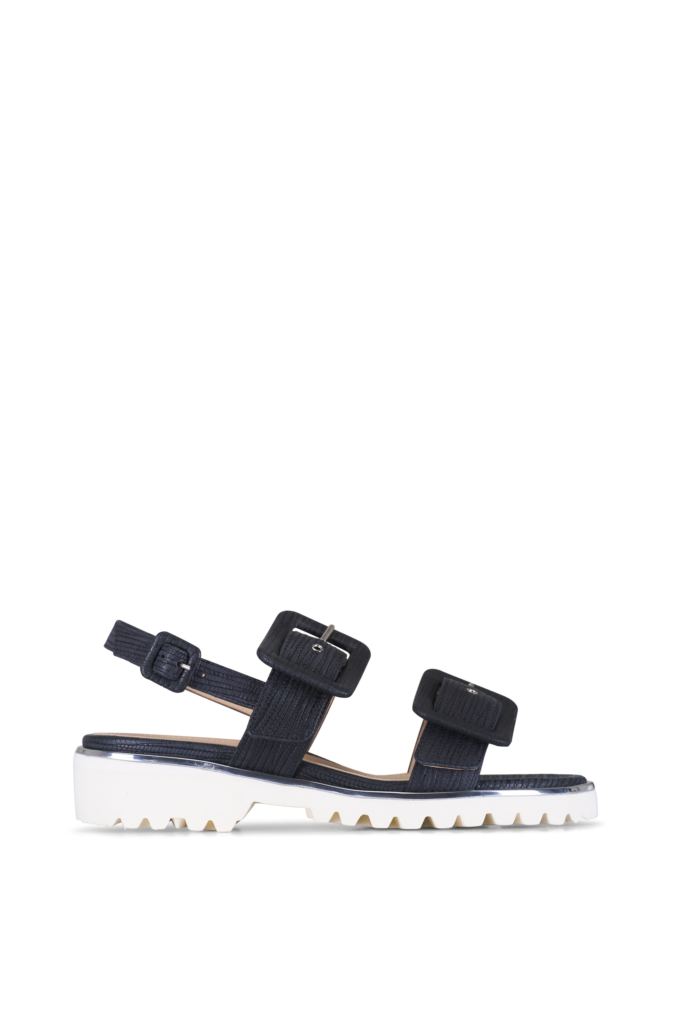 Embossed nubuck upper. Round, open toe. Double buckle strap vamp. Adjustable slingback strap. Leather lining. Rubber lug sole. Made in Italy.