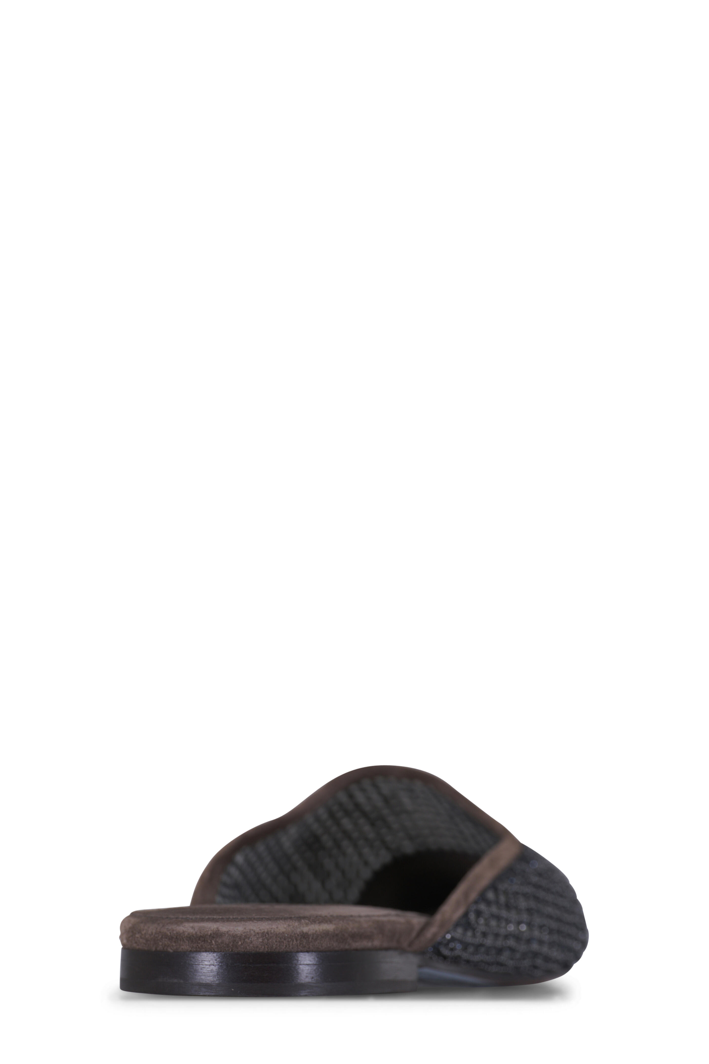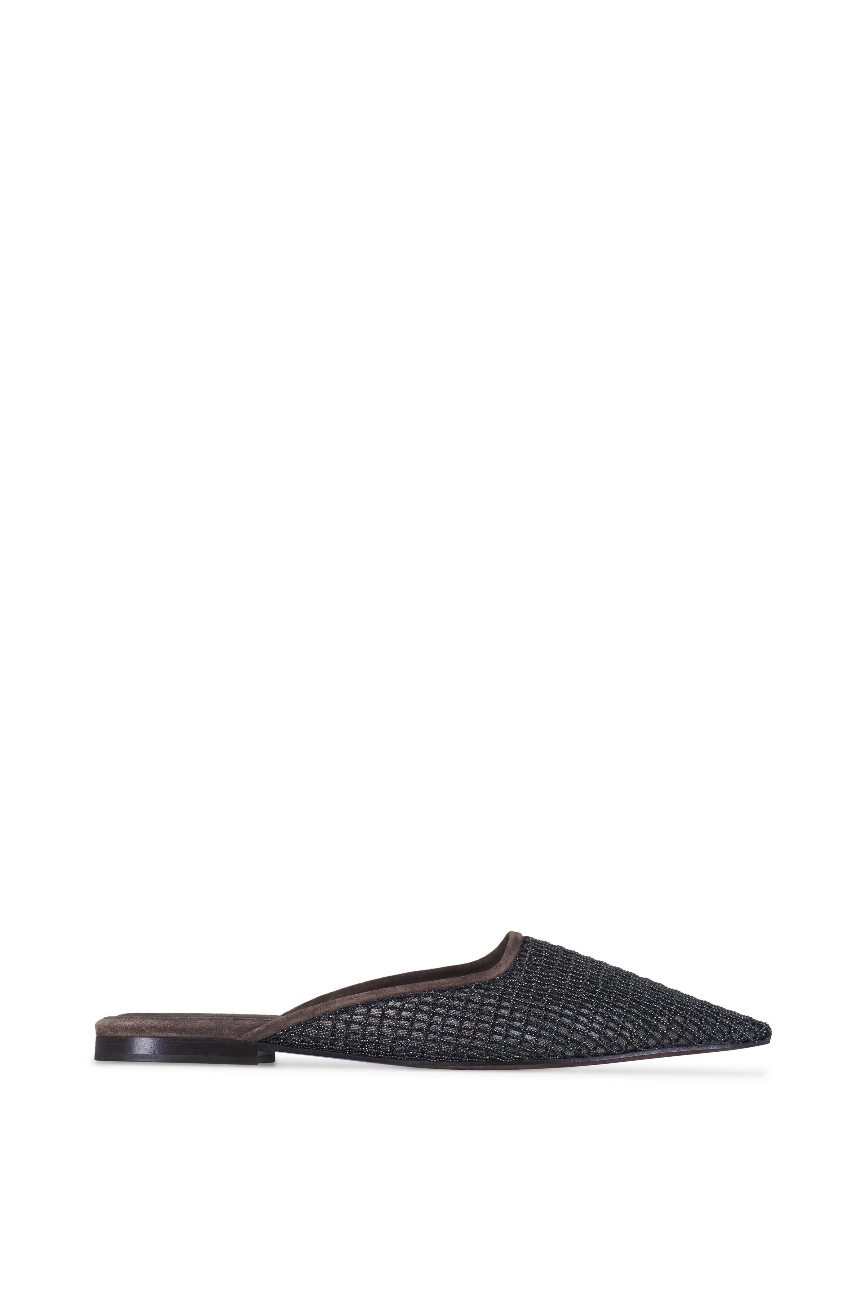 Embellished net suede upper. Squared, pointed toe. Slip on style. Unlined; suede insole. Leather sole; Non-slip TPU rubber at heel and toe. Made in Italy.
