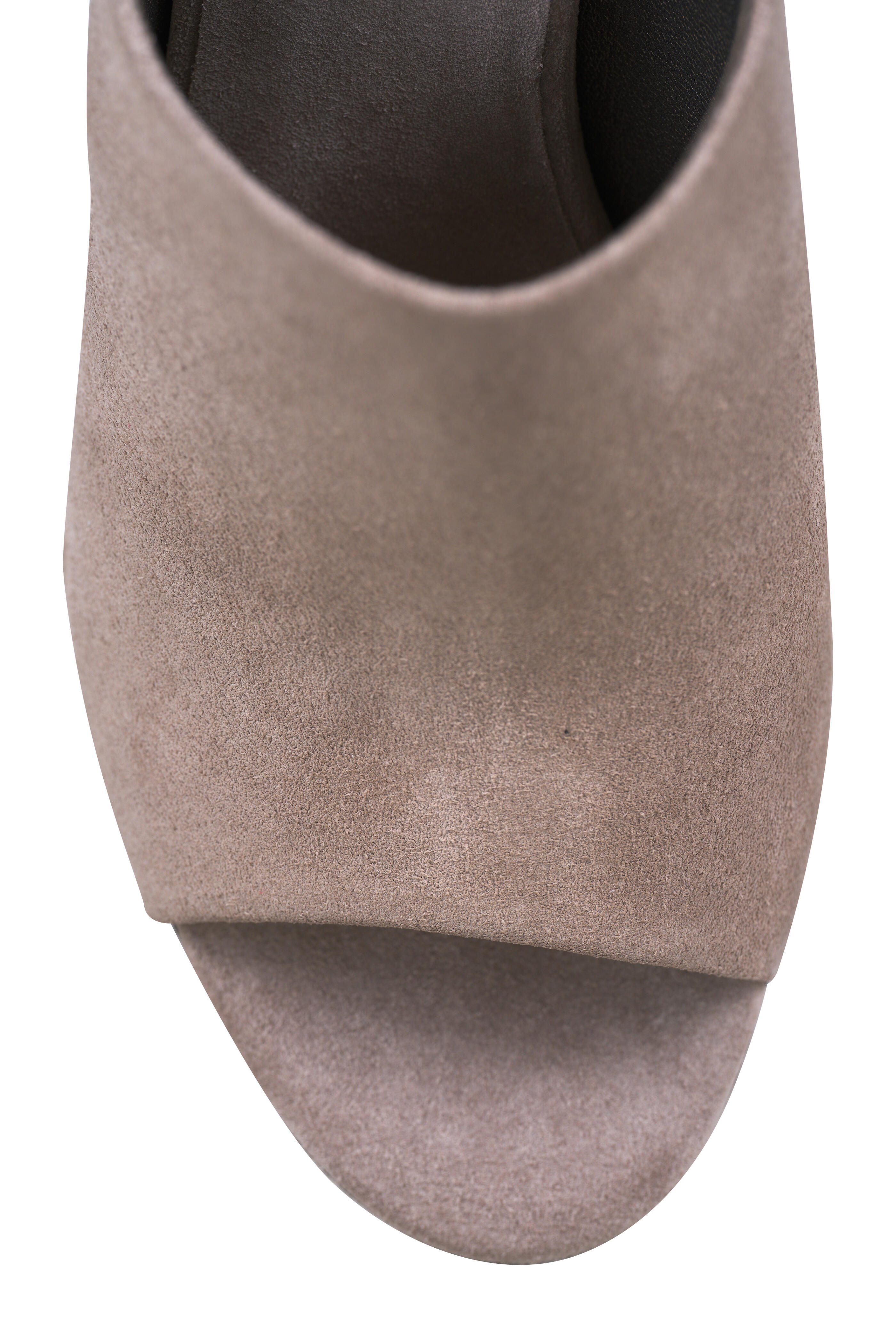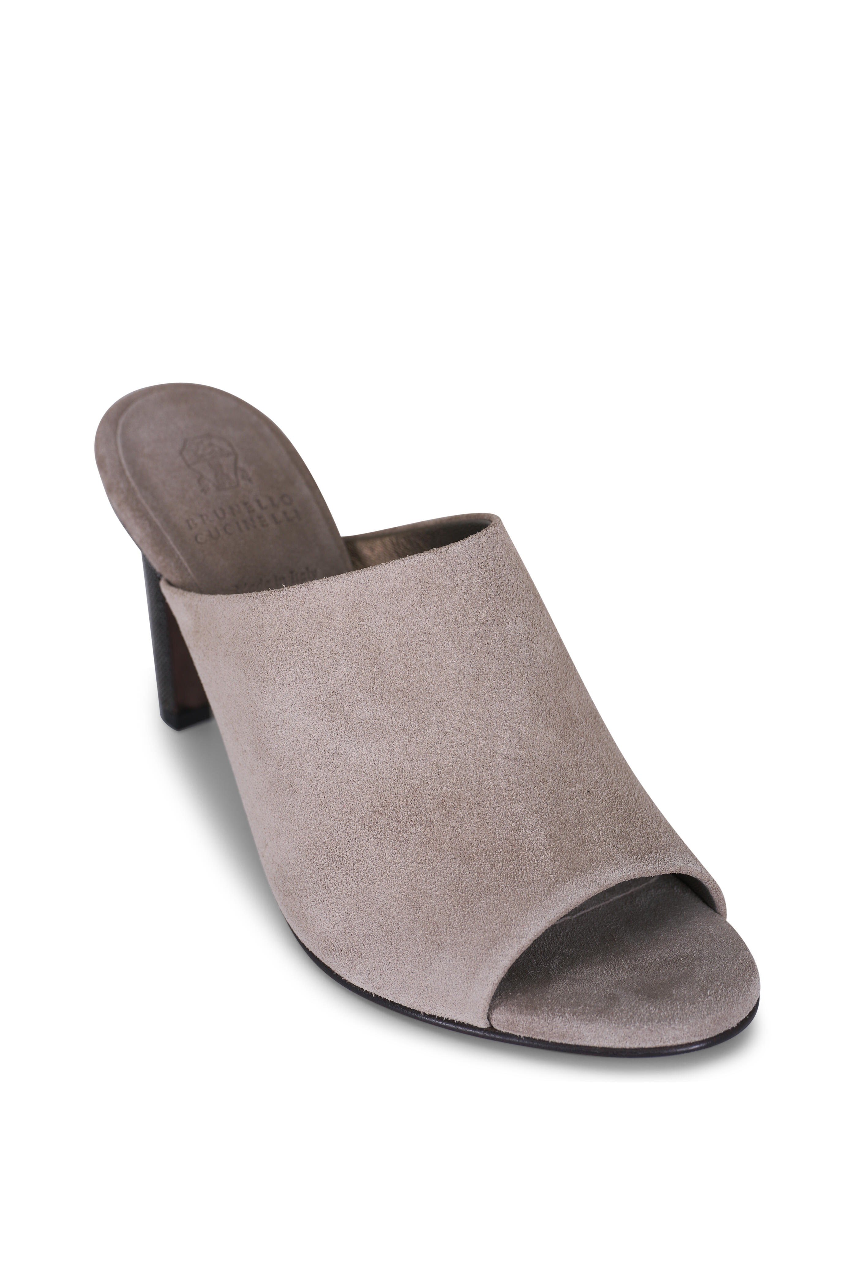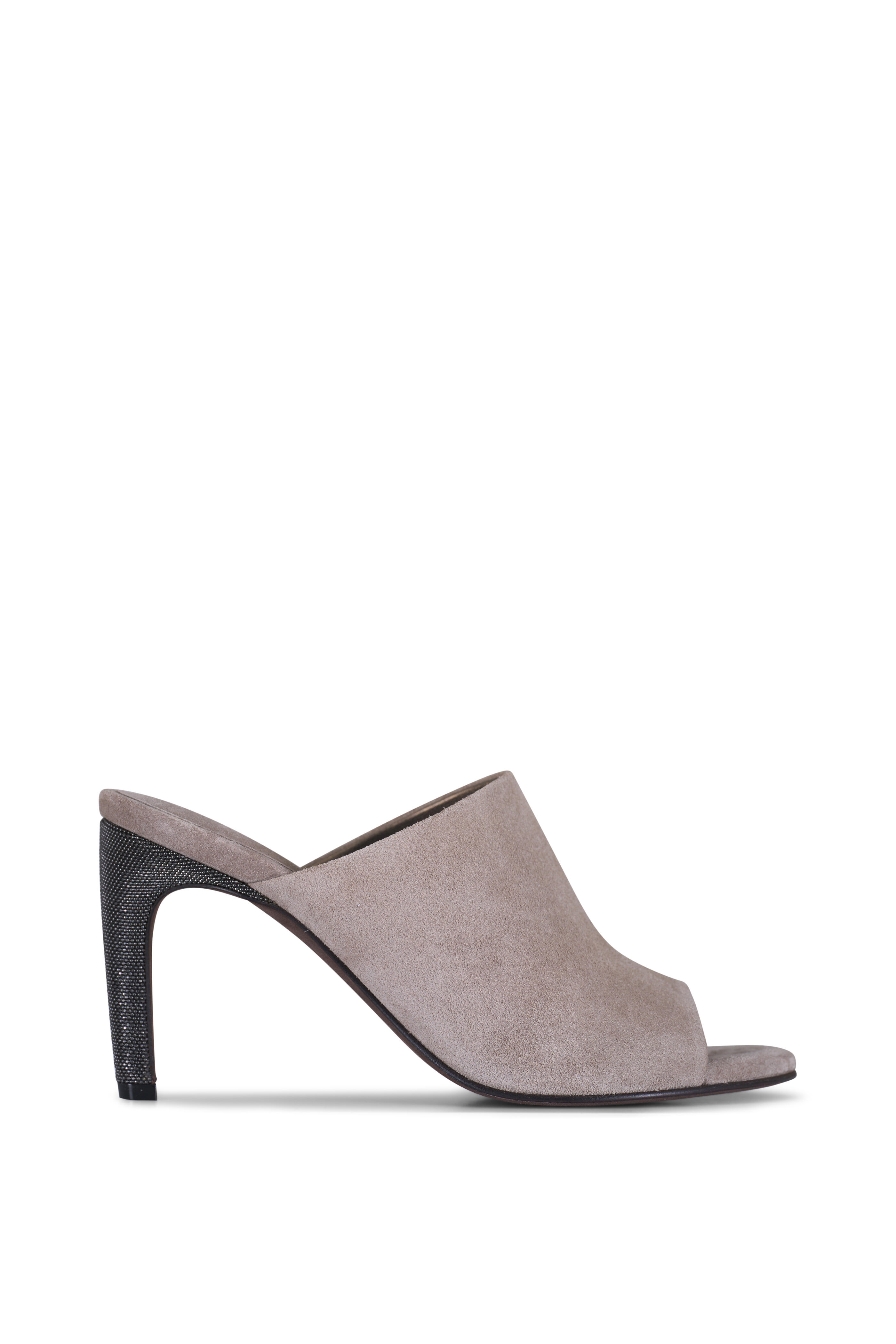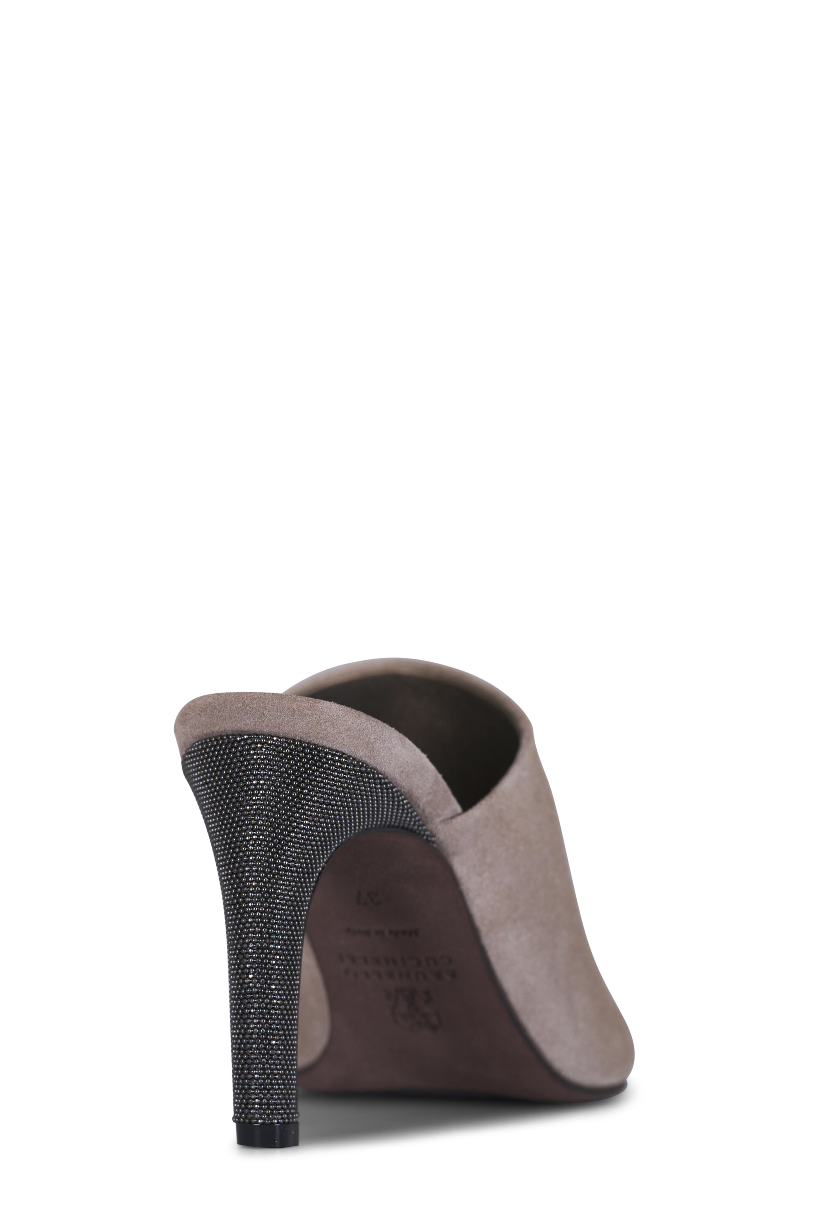 Calf suede upper. Open toe. Slip on style. Monili covered heel. Leather lining and insole. Leather sole. Made in Italy. Heel measurement: 80mm.