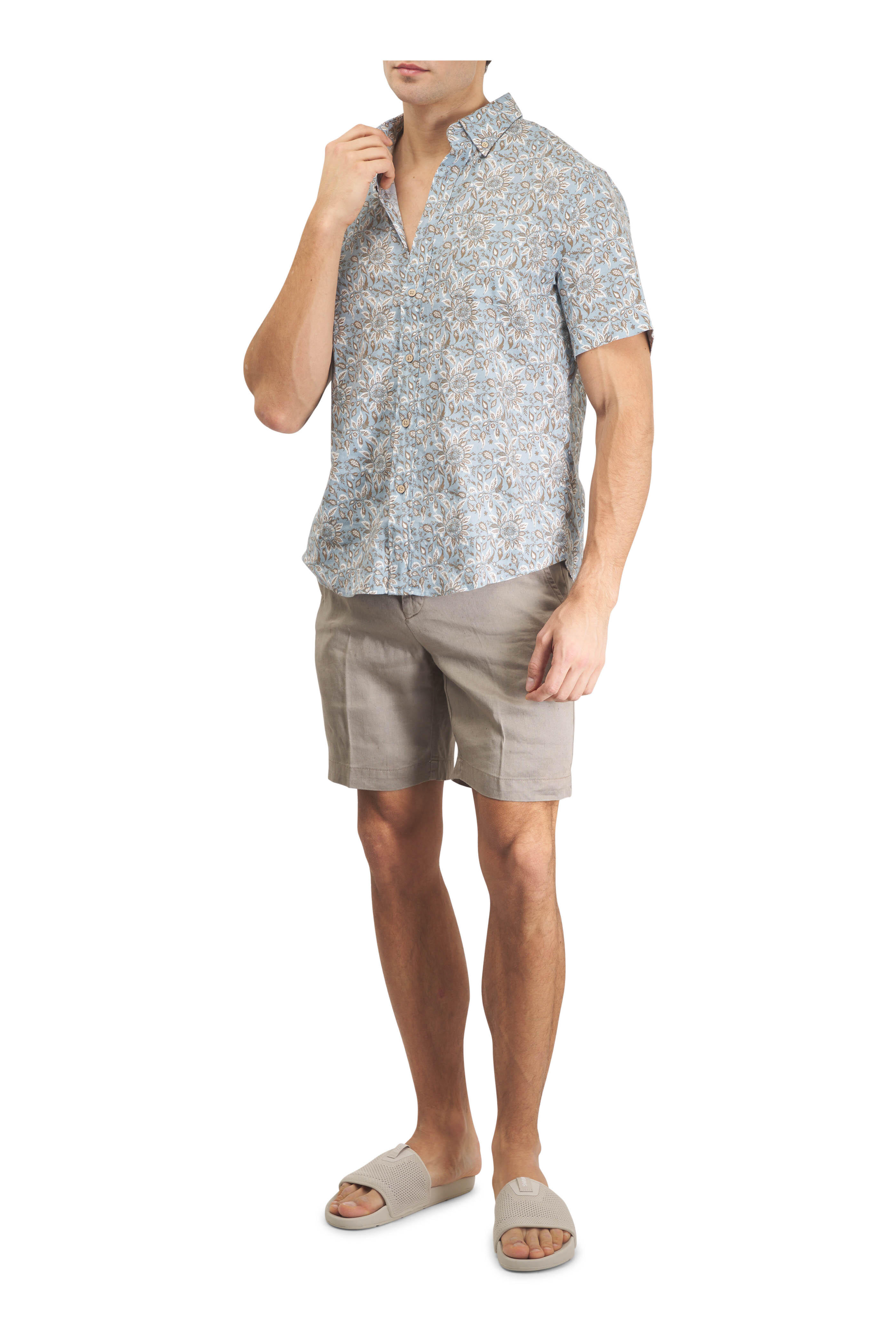 Button-down collar. Front button placket. Chest patch pocket. Double pleated back. Shirttail hem. Imported. Approximately 28 ½" shoulder to hem. Relaxed fit. 57% linen, 41% linen, 2% elastane. Machine wash.