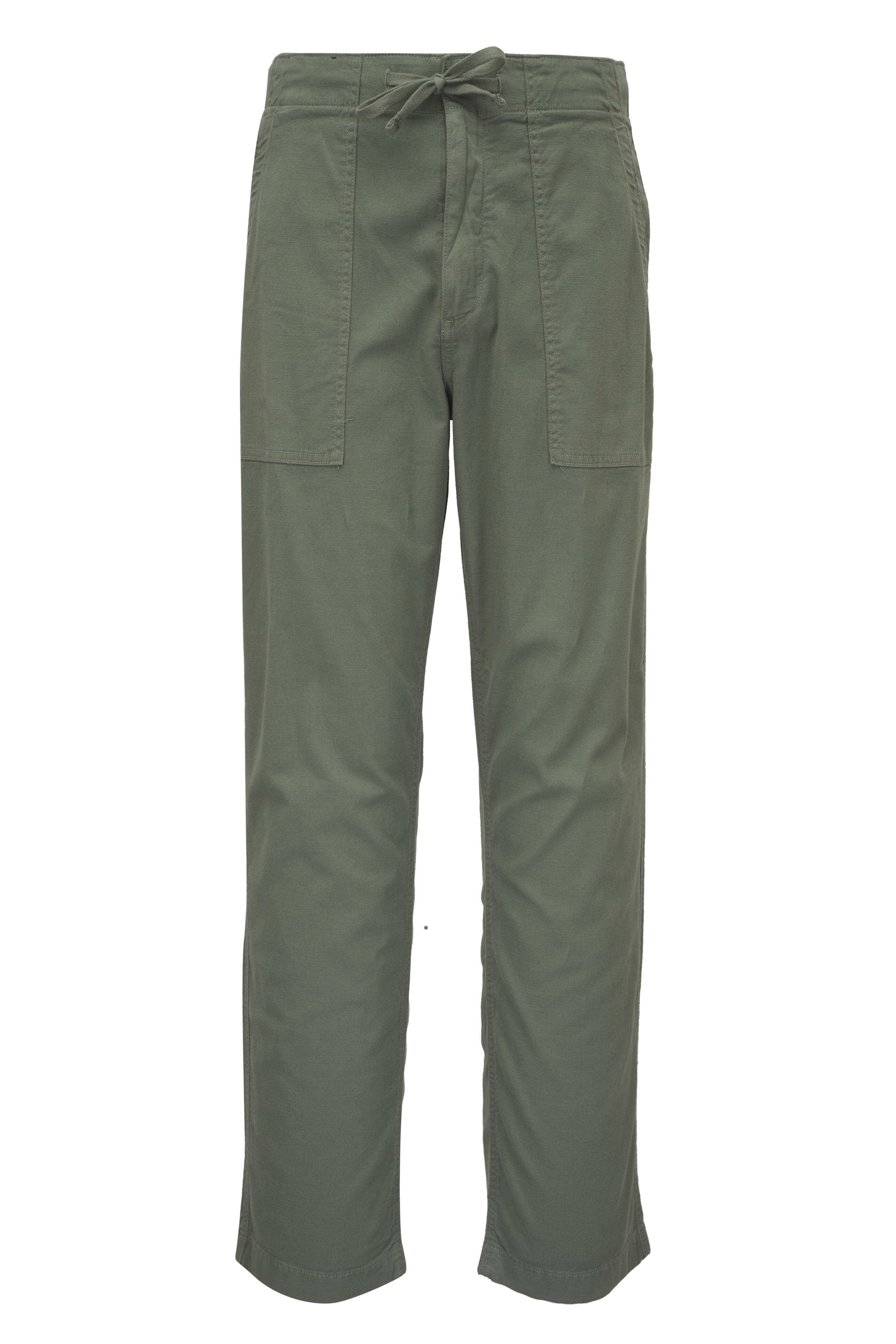 Zip fly; button closure. Drawstring waist. Four pocket styling. Imported. 32" inseam. Slim and straight, sitting just below the natural waist. 98% organic cotton, 2% spandex. Machine wash.
