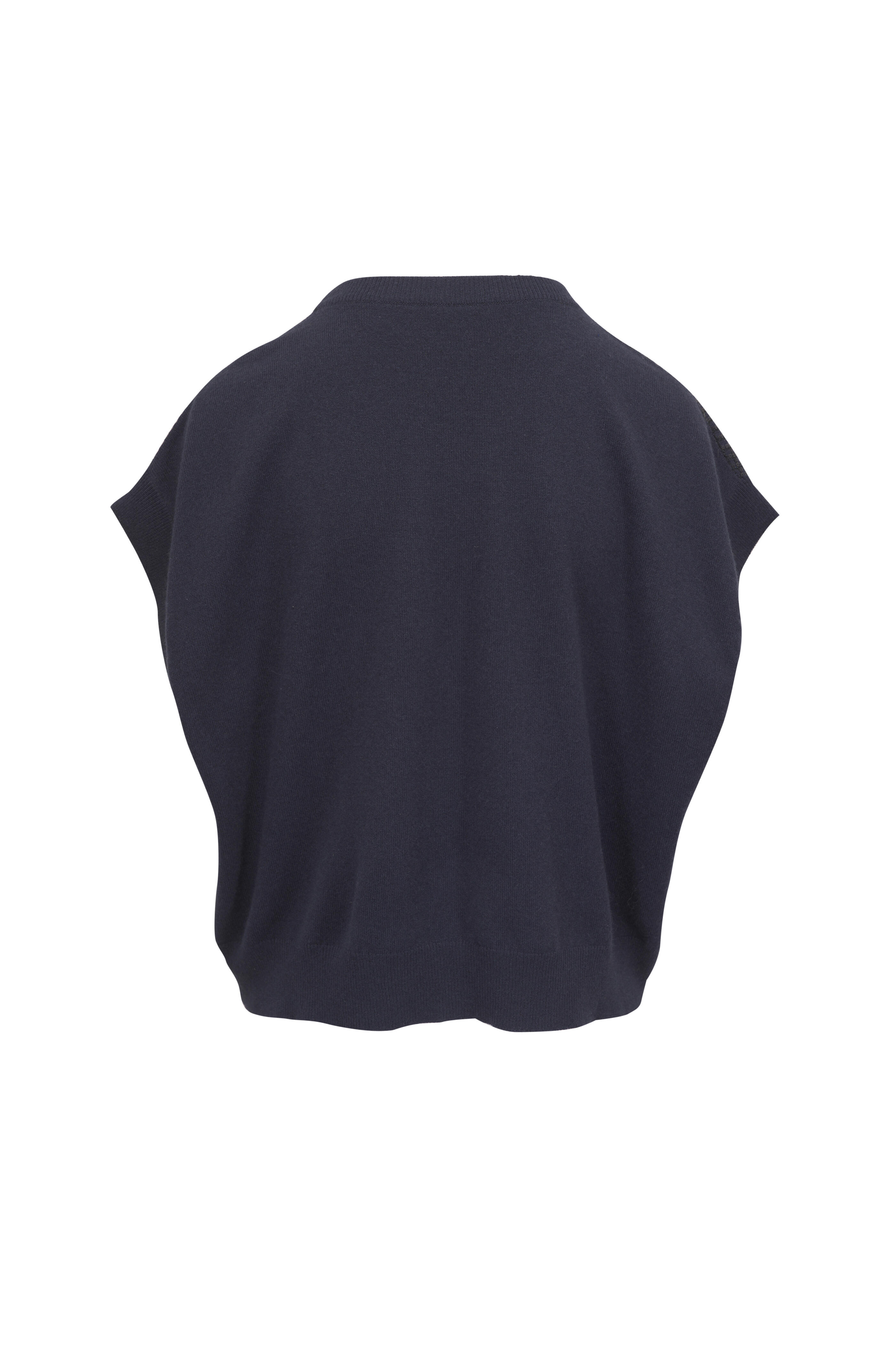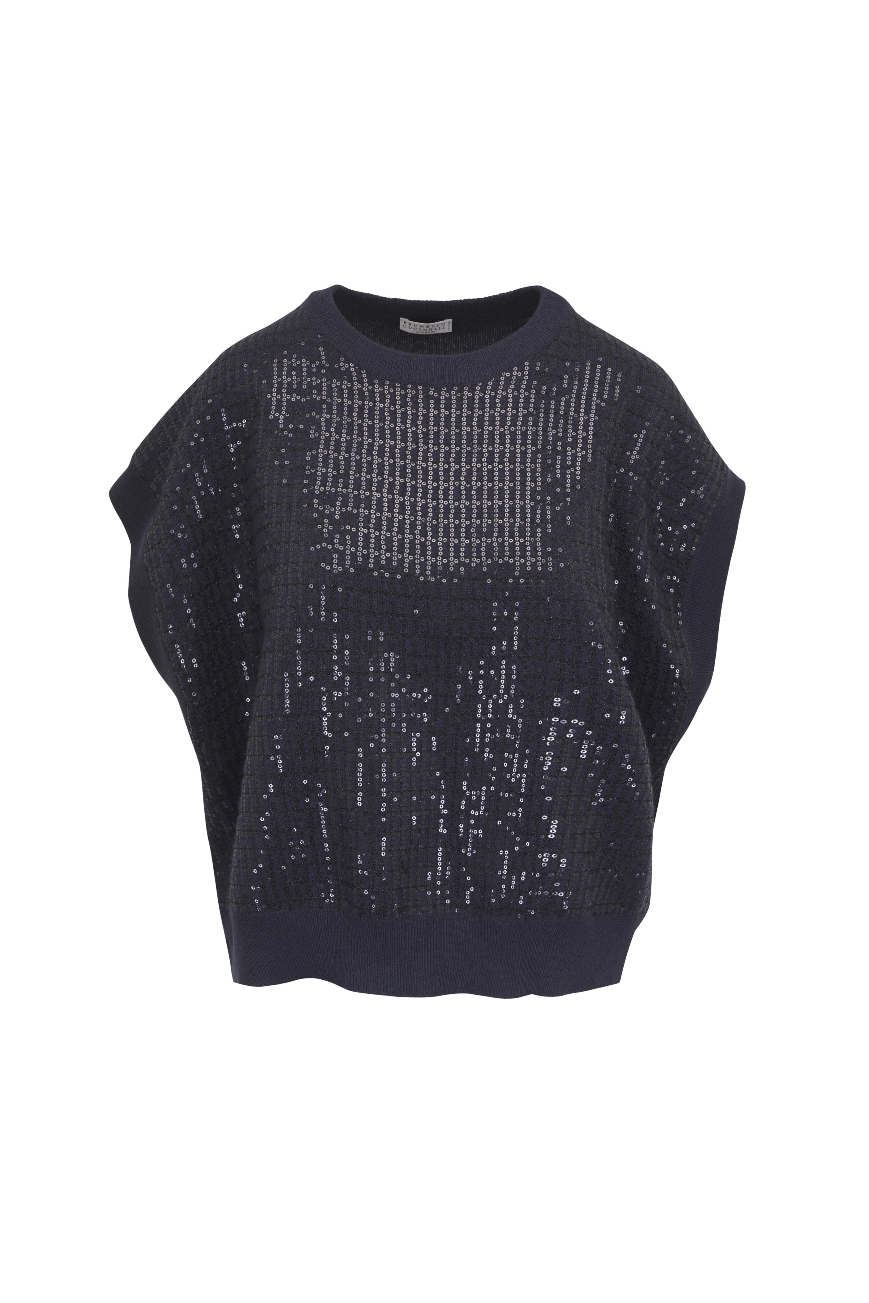 Crew neckline. Palliette front. Cap sleeves. Ribbed trims. Made in Italy. 60% virgin wool, 30% cashmere, 10% silk. Dry clean.