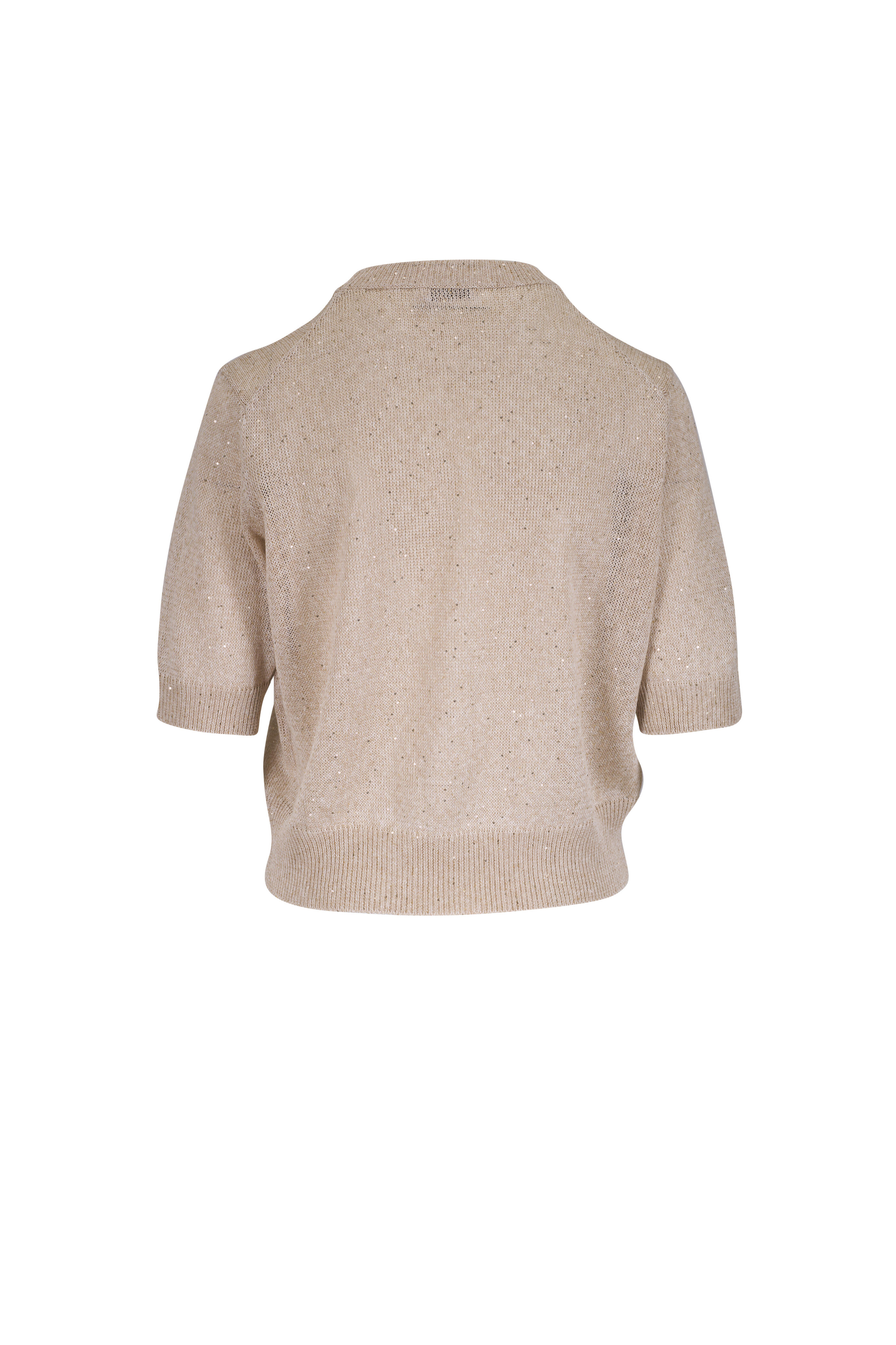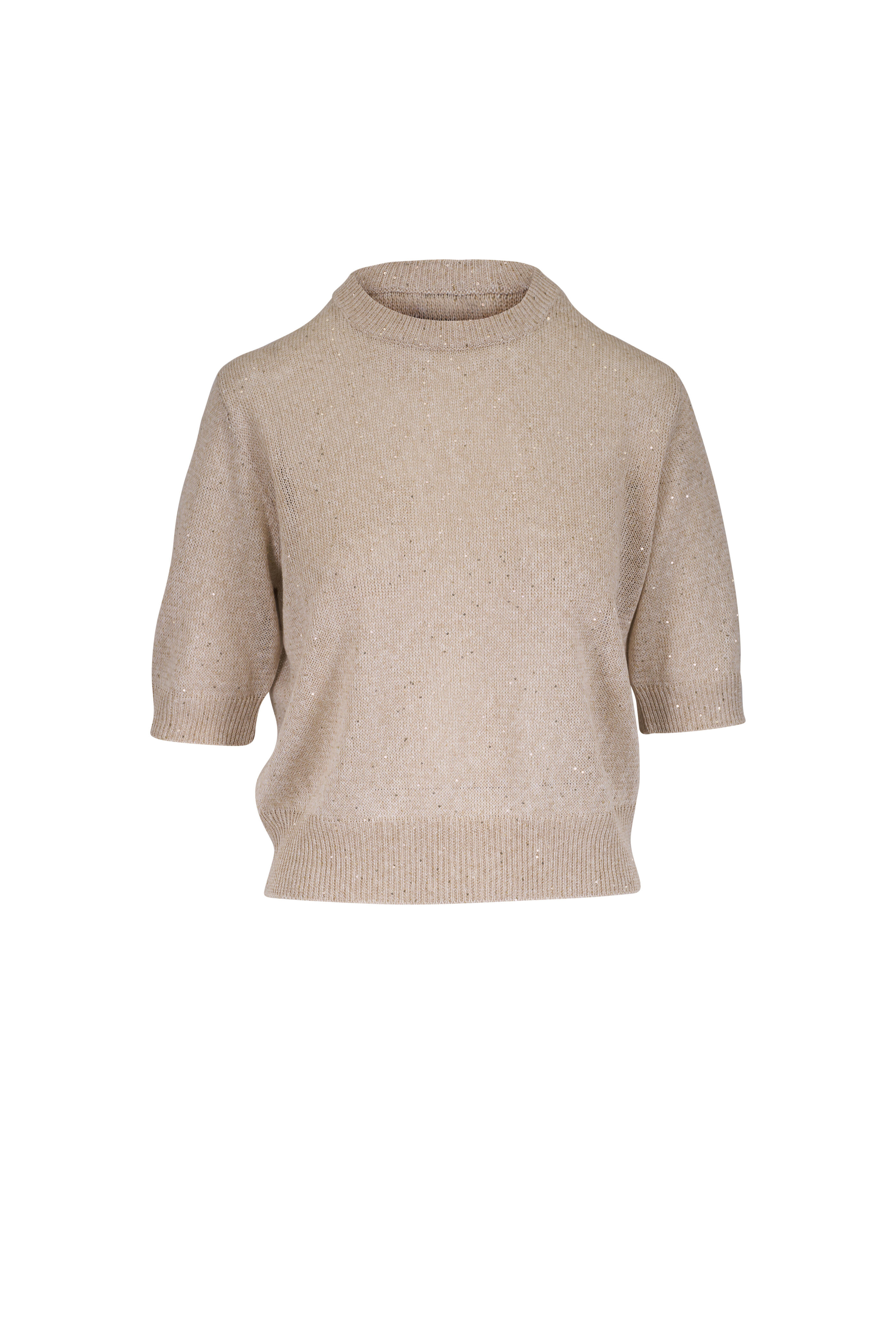 Beige Linen & Cotton Pailette Short Sleeve Sweater