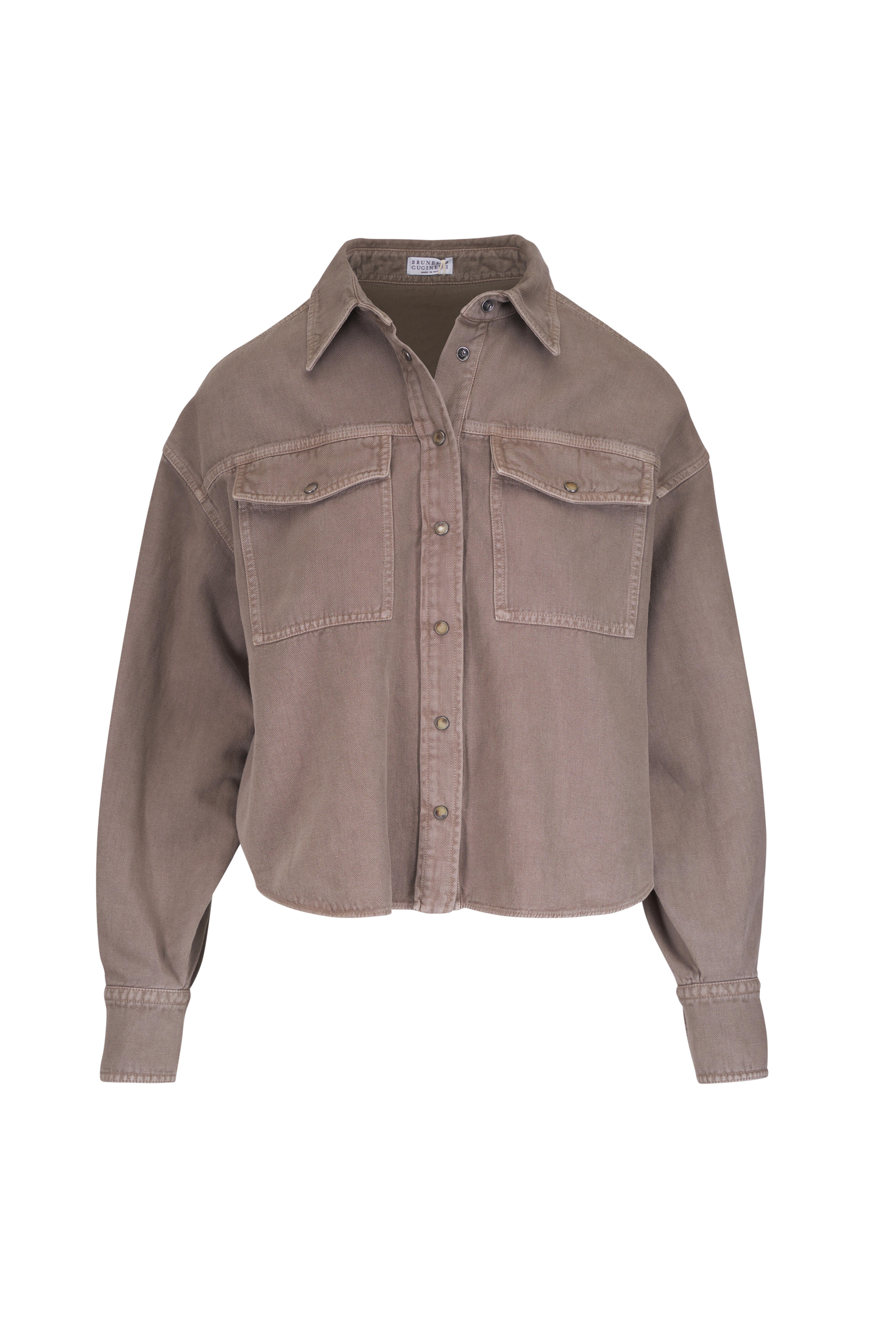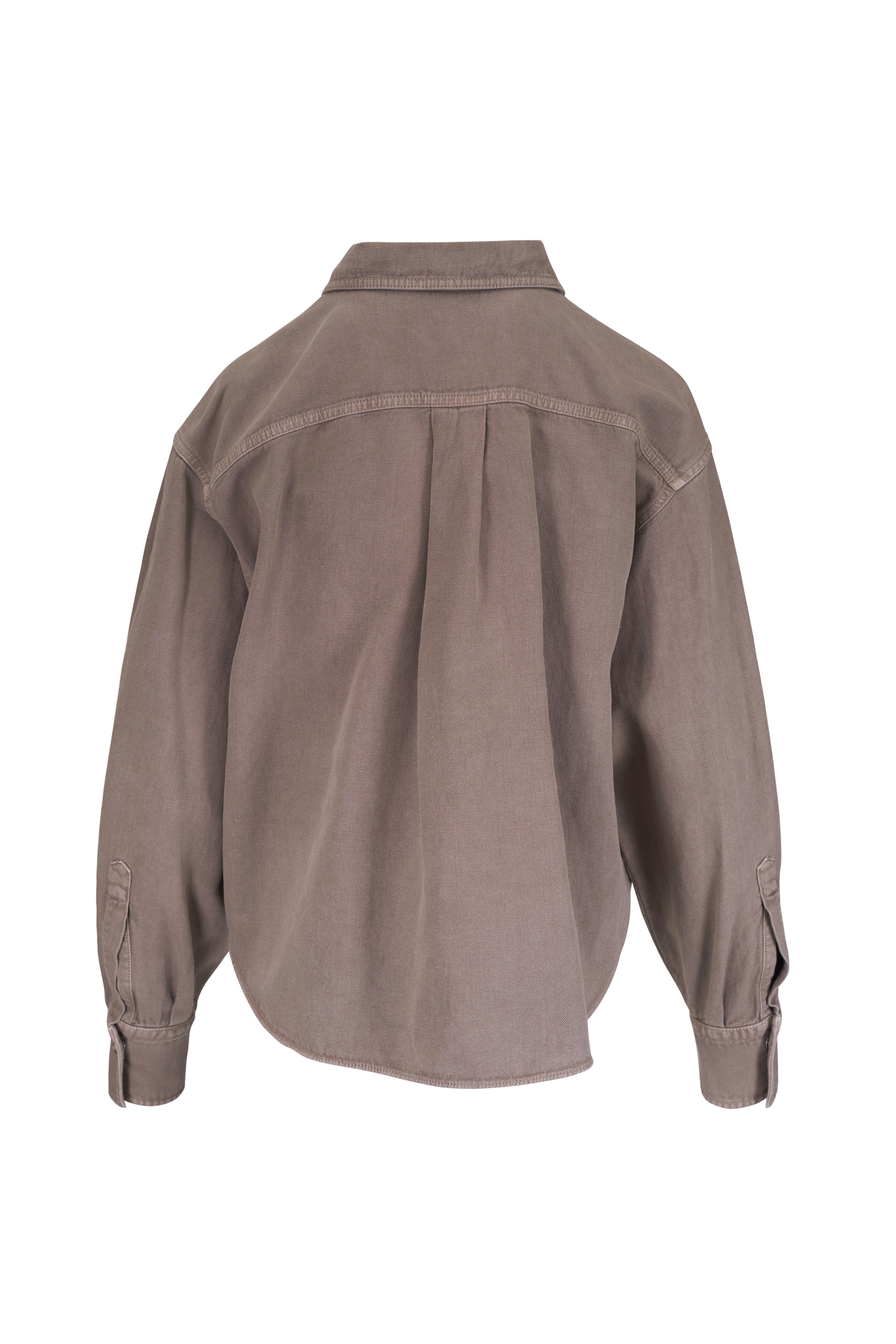 Spread collar. Front snap button placket. Chest snap button patch pockets. Single snap button square cuffs. Made in Italy. Approximately 22" shoulder to hem (measurements taken from size S). 60% cotton, 40% linen. Dry clean.