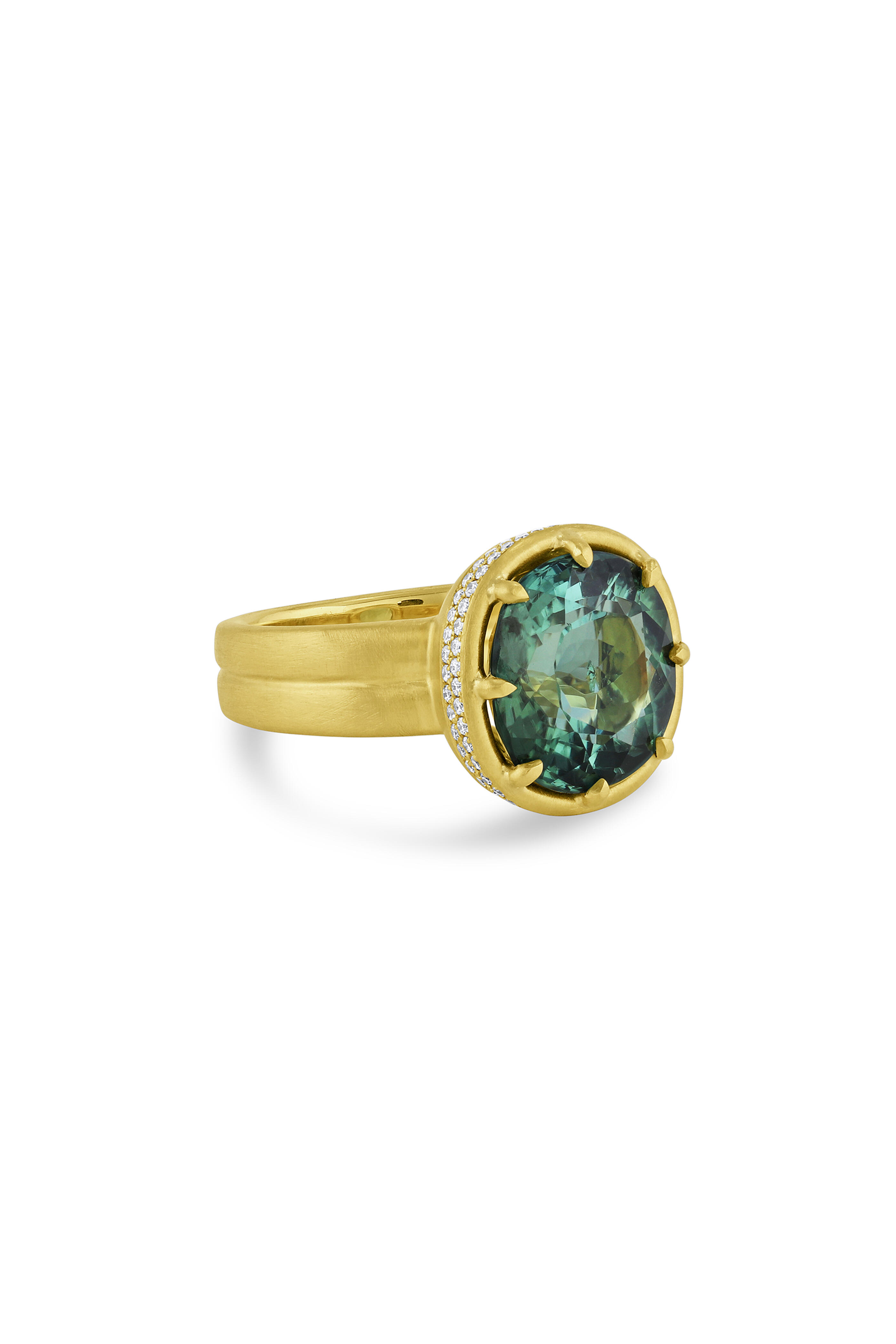 18k Yellow Gold. Satin Finish. 7.80 ct Green Tourmaline. 0.38 ct Diamond. Size 7.5.