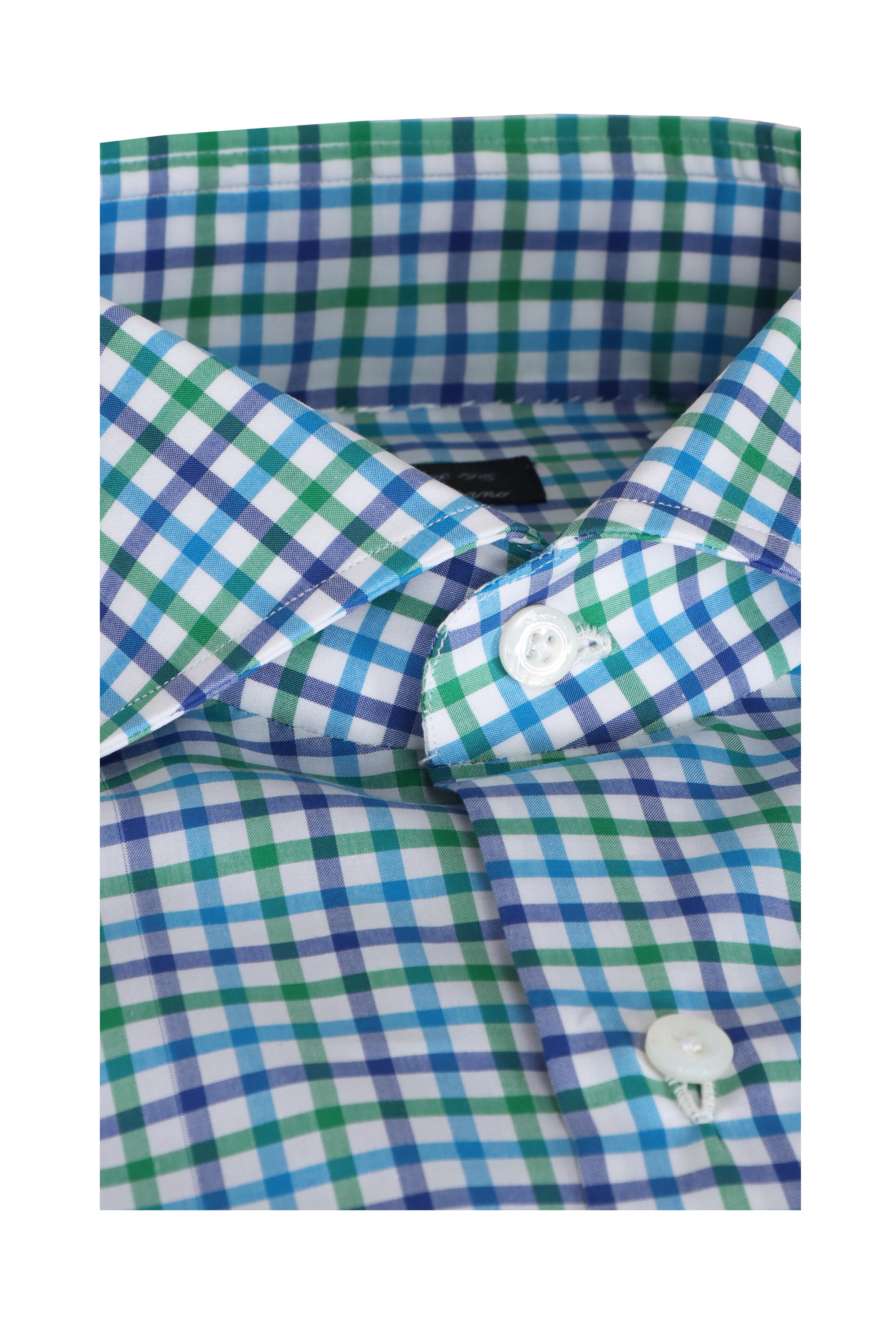 Spread collar. French front button placket. Single button adjustable barrel cuffs. Imported. 100% cotton. Dry clean.