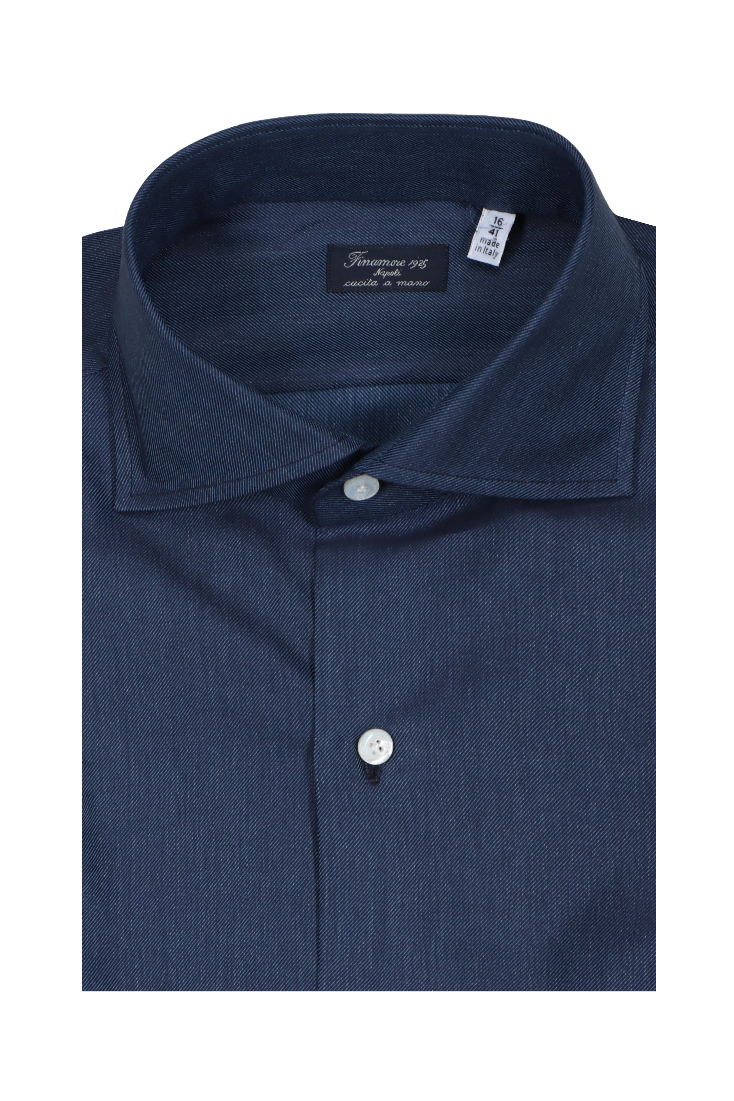 Spread collar. French front button placket. Single button barrel cuffs. Made in Italy. 100% cotton. Dry clean.