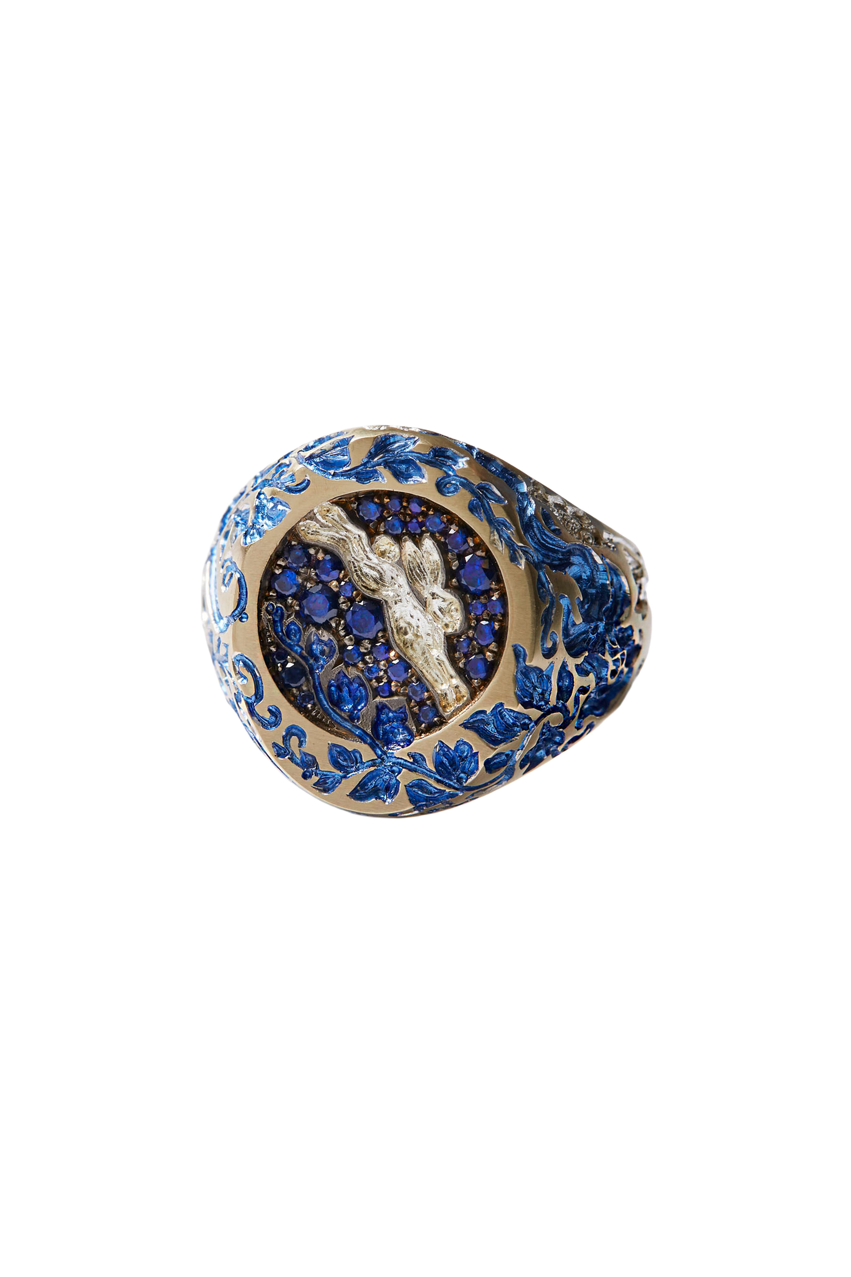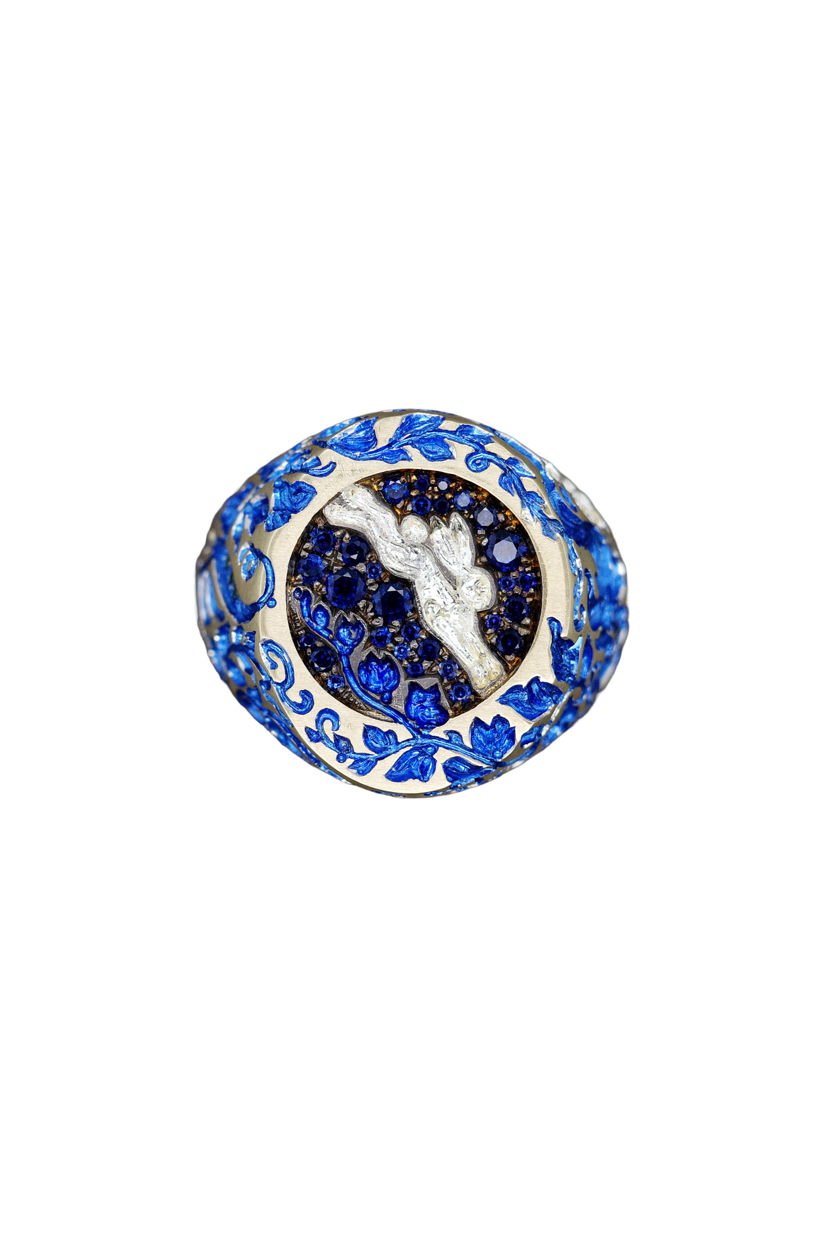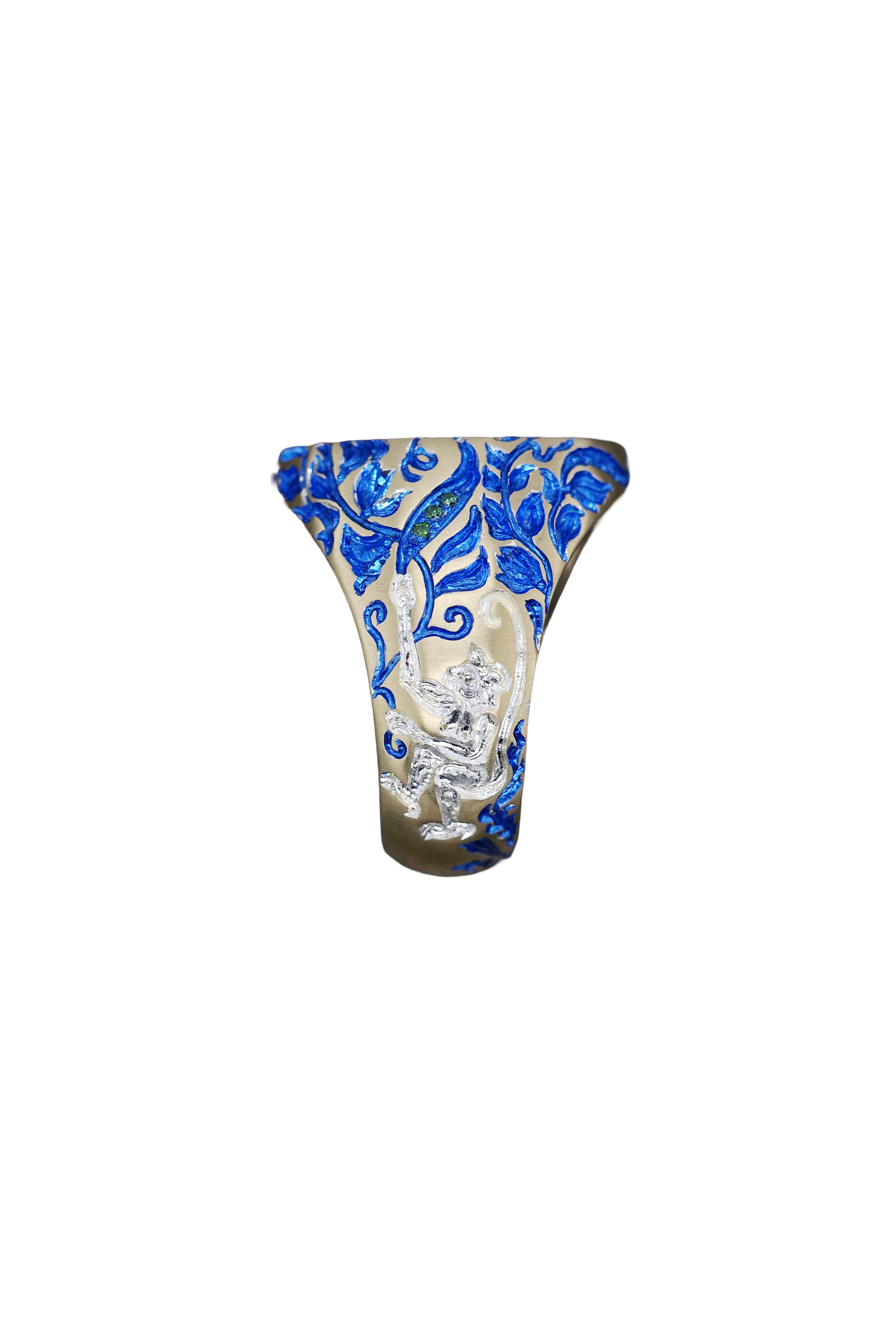 9k gold. Diamond. Blue sapphire. Tsavorite. Blue carved detailing of leaves and flowers. Elements gracefully climbing on each side. Signet style. Handmade in London. Rings size 7.5.