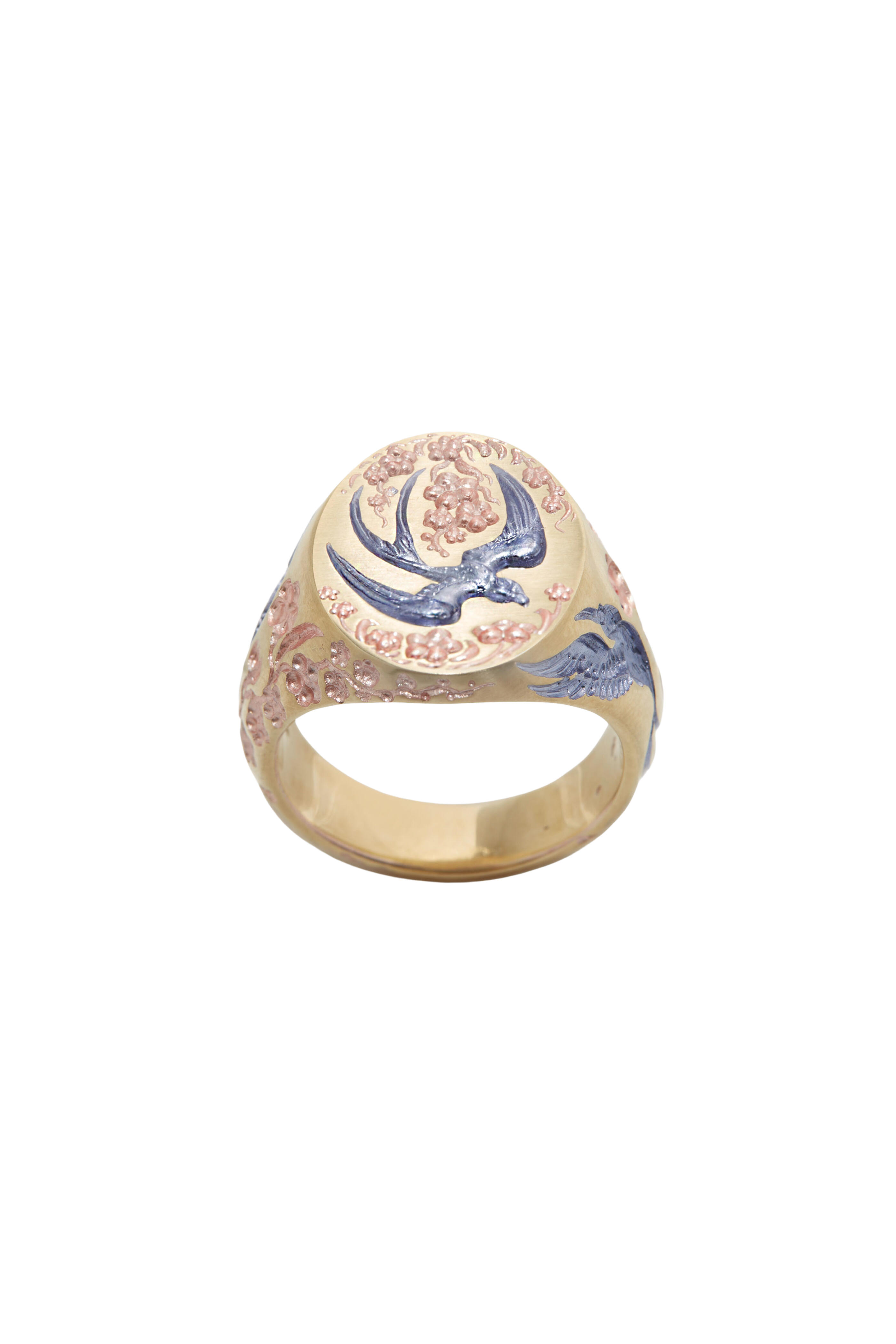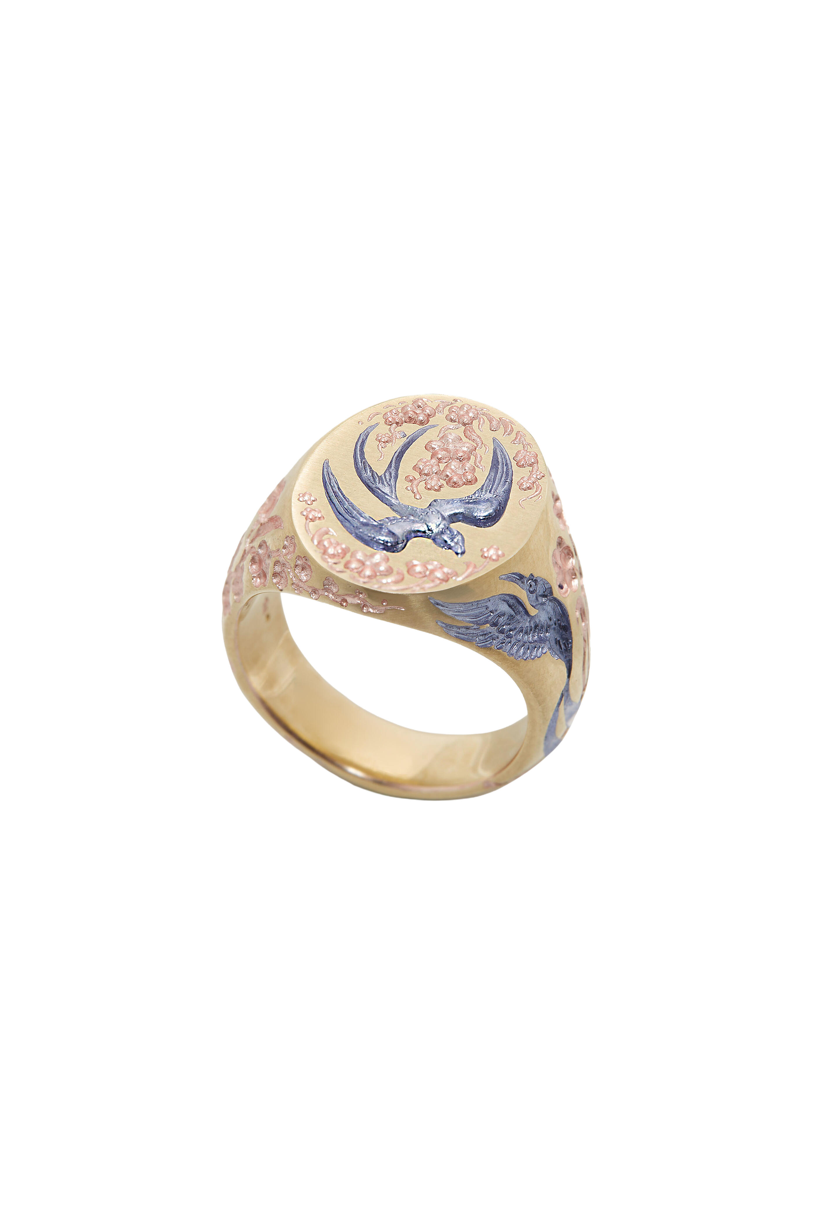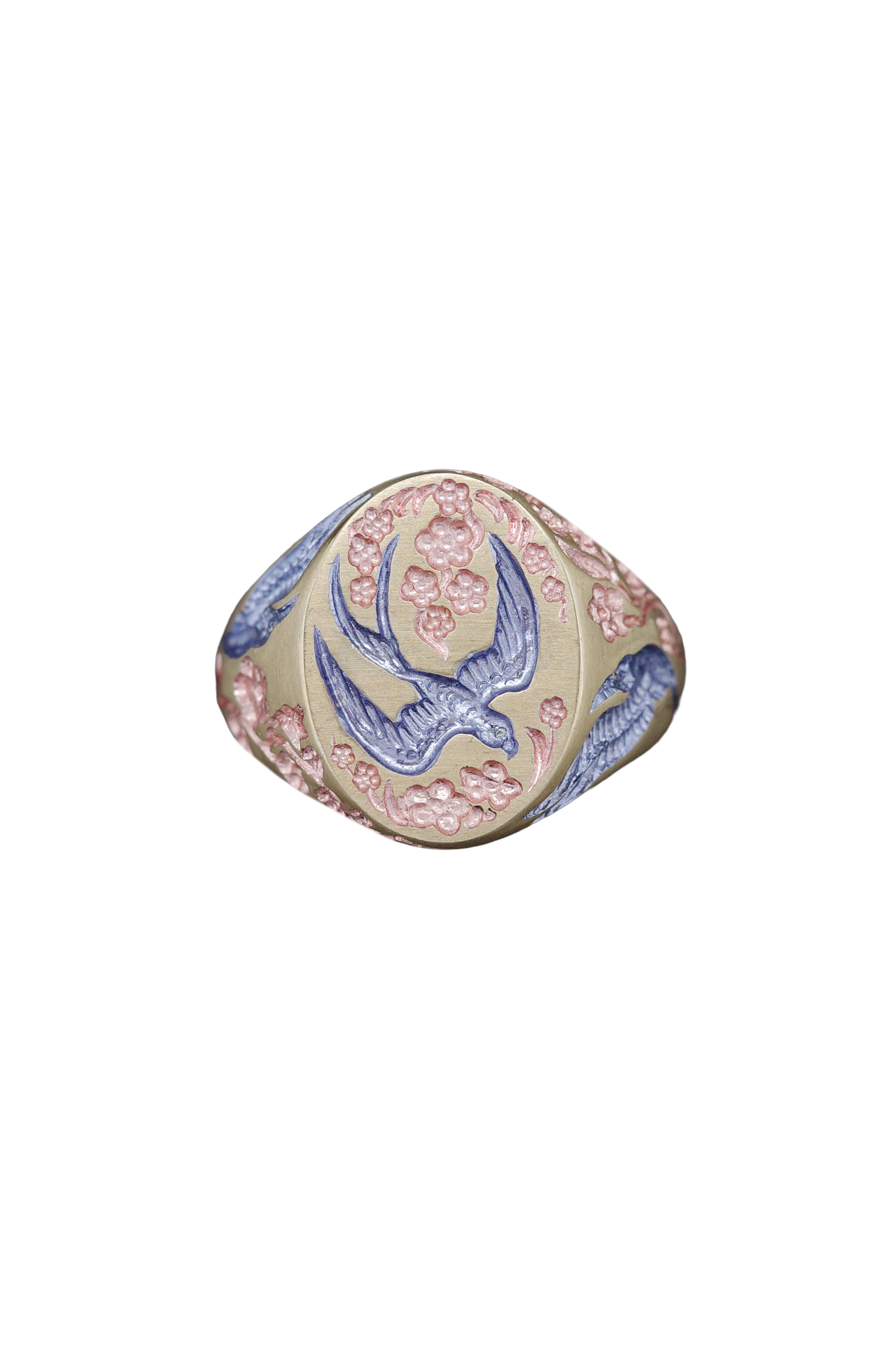 pk gold. Diamond. Pink and purple colored engraving. All of the birds are set with diamond eyes. Incorporates an elegant swallow motif on the front, accompanied by floral designs and, on the sides, hummingbirds fly amidst the blossoms. Signet style. Handmade in London. Ring size 7.