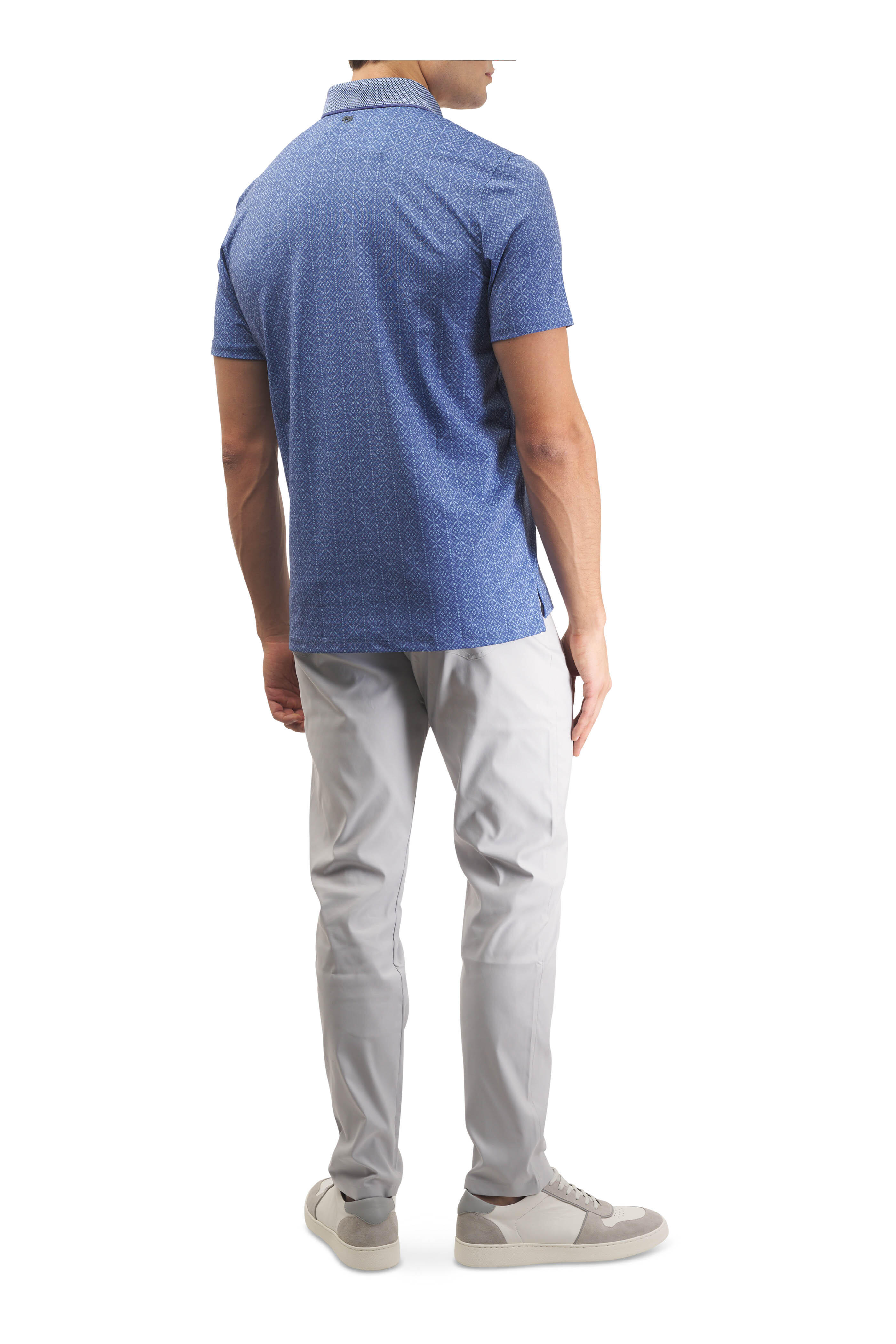 Spread collar. Three button placket. Pullover style. Vented hem. Imported. 90% recycled polyester, 10% spandex. Machine wash.
