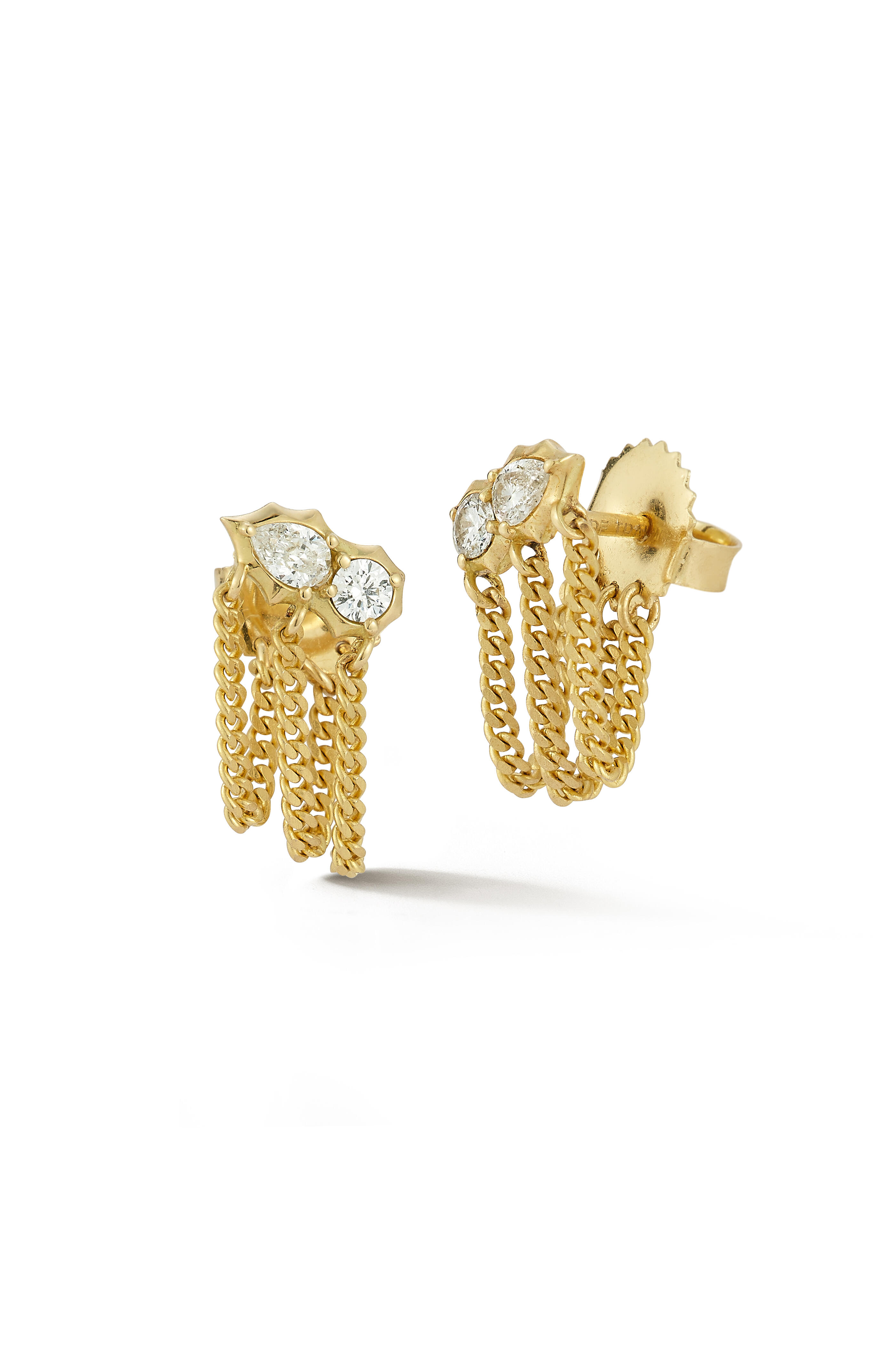 Designed with our signature Posey cluster and three rows of slinky curb chains, the Posey Chain Loop Earrings are a casual yet still feel like they can be dressed up. Handcrafted in 18-karat and featuring 0.13tcw of round and pear shaped diamonds, the Posey Chain Loop Earrings are the perfect lightweight earring that still feel like a statement.
