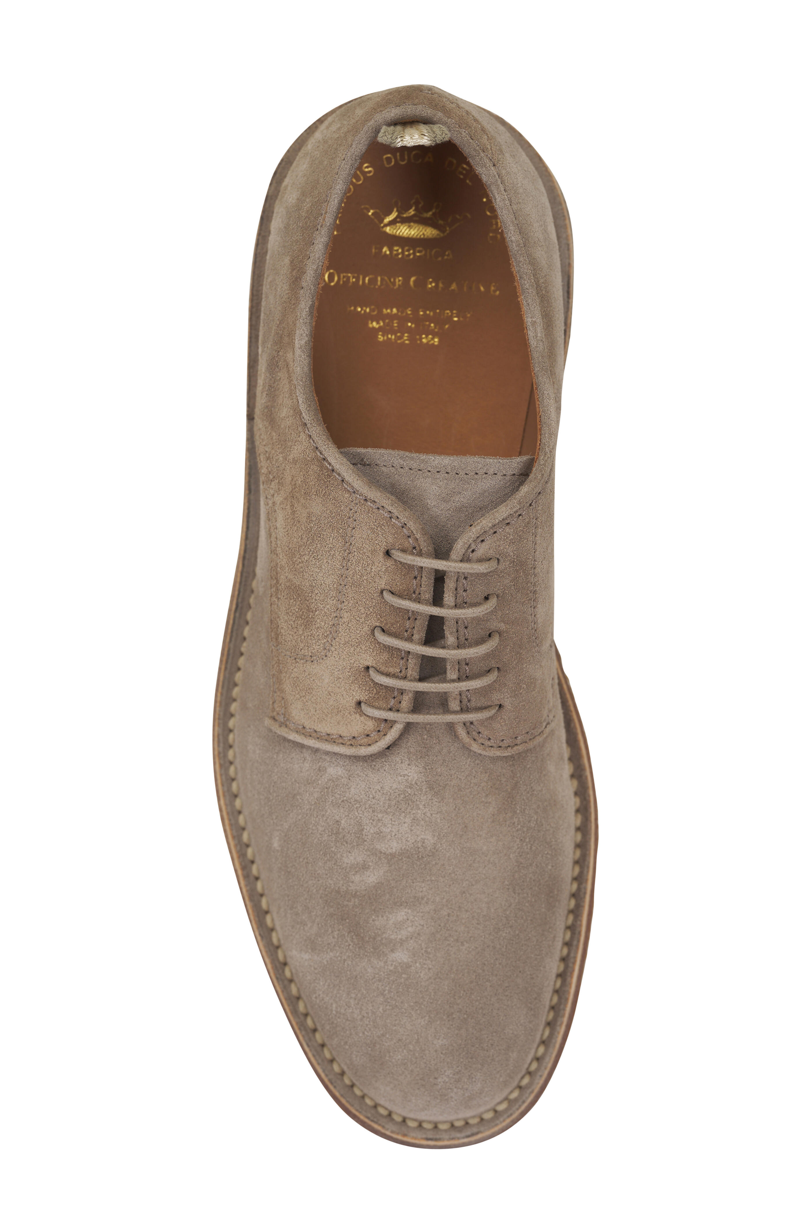 Suede upper. Almond toe. Five eyelet lace up closure. Slip on style. Leather lining and insole. Rubber sole. Made in Italy.