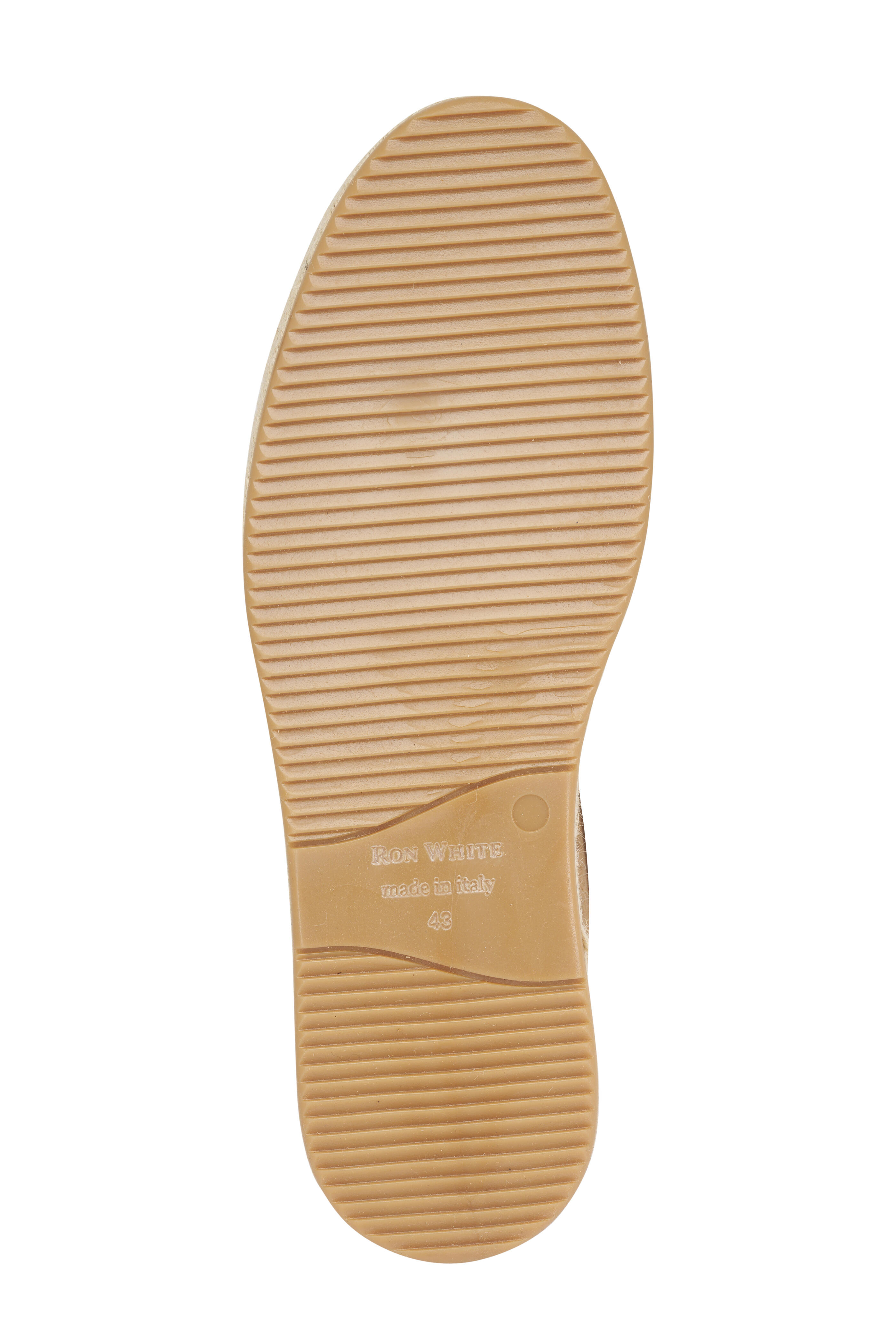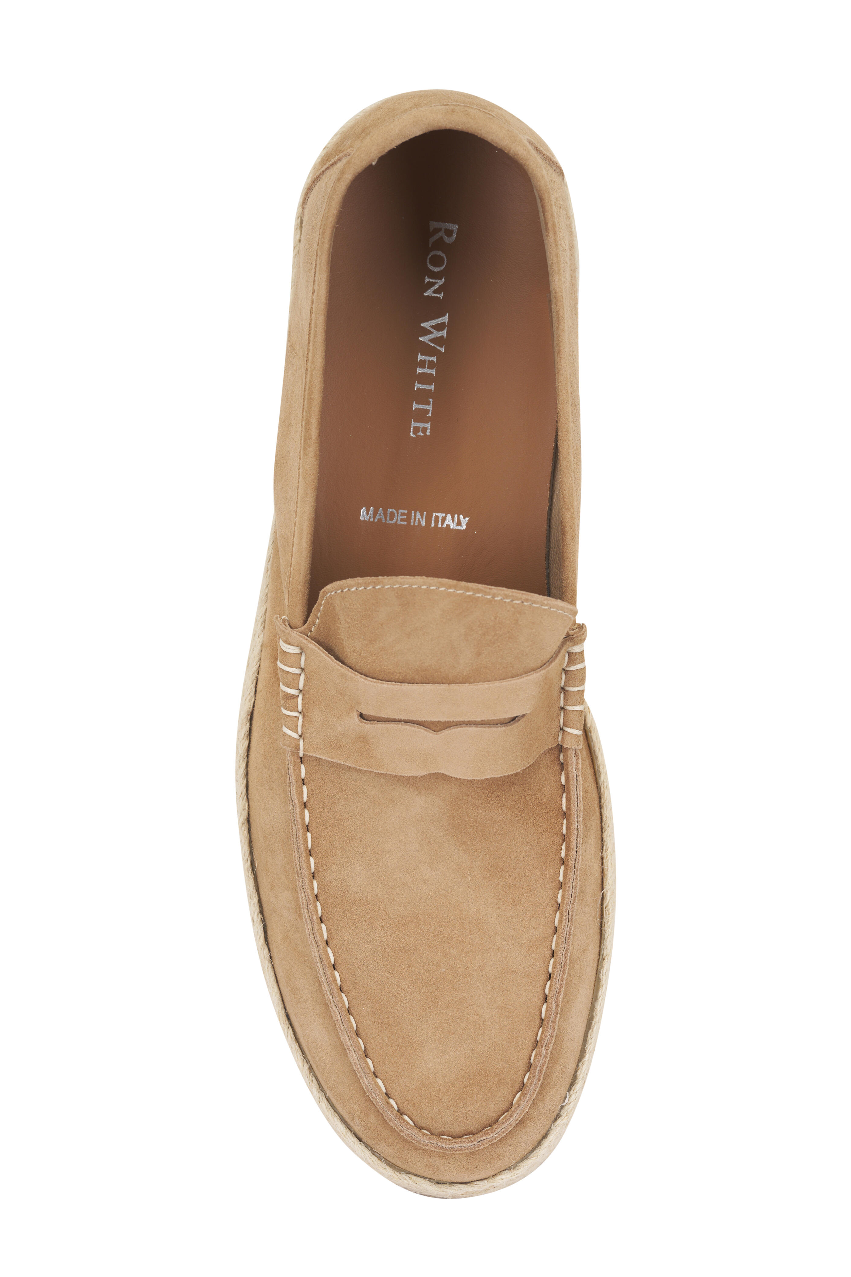 Suede upper. Round apron toe. Slip-on style. Penny strap across vamp. Leather lining and insole. Raffia midsole. Rubber sole. Made in Italy.