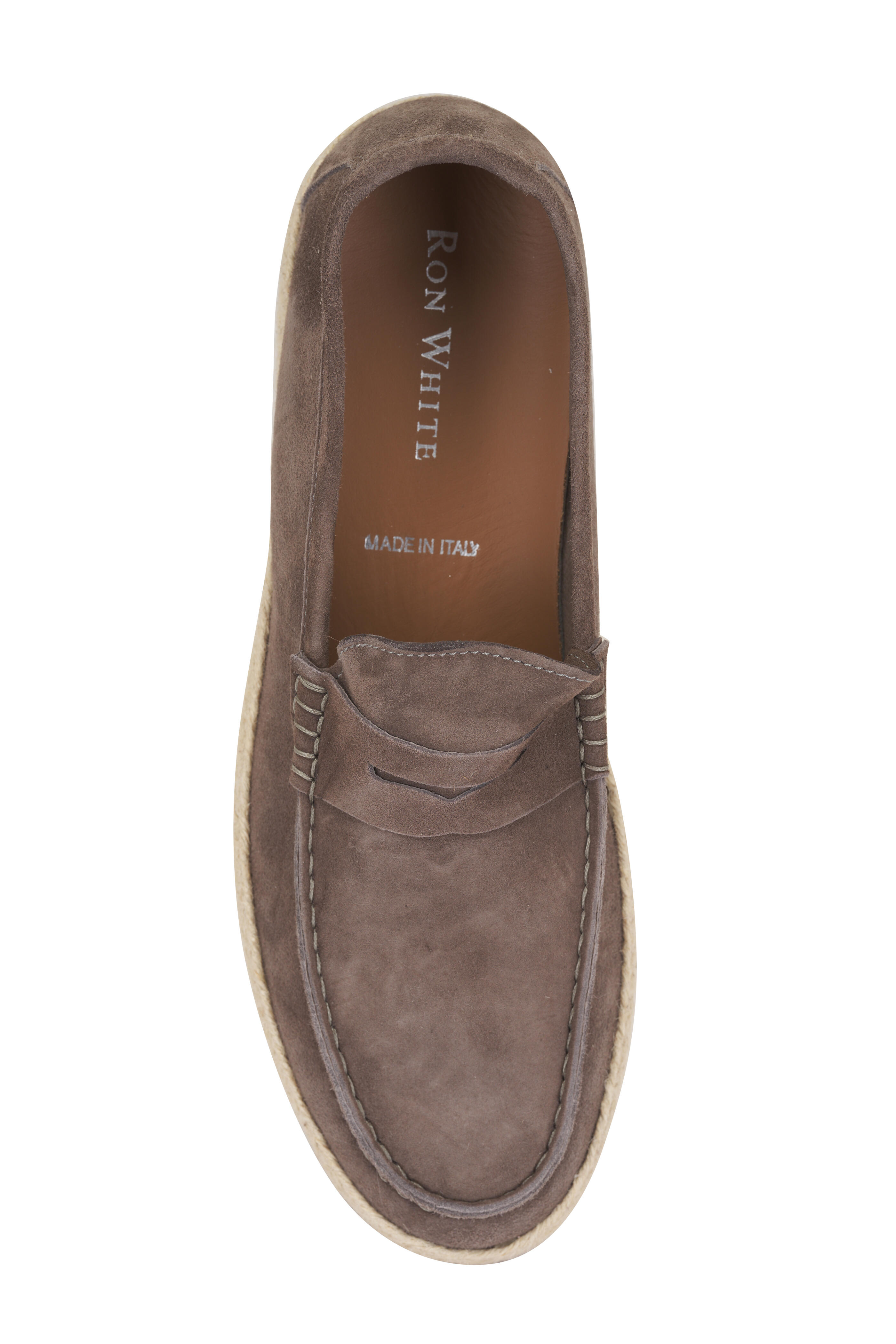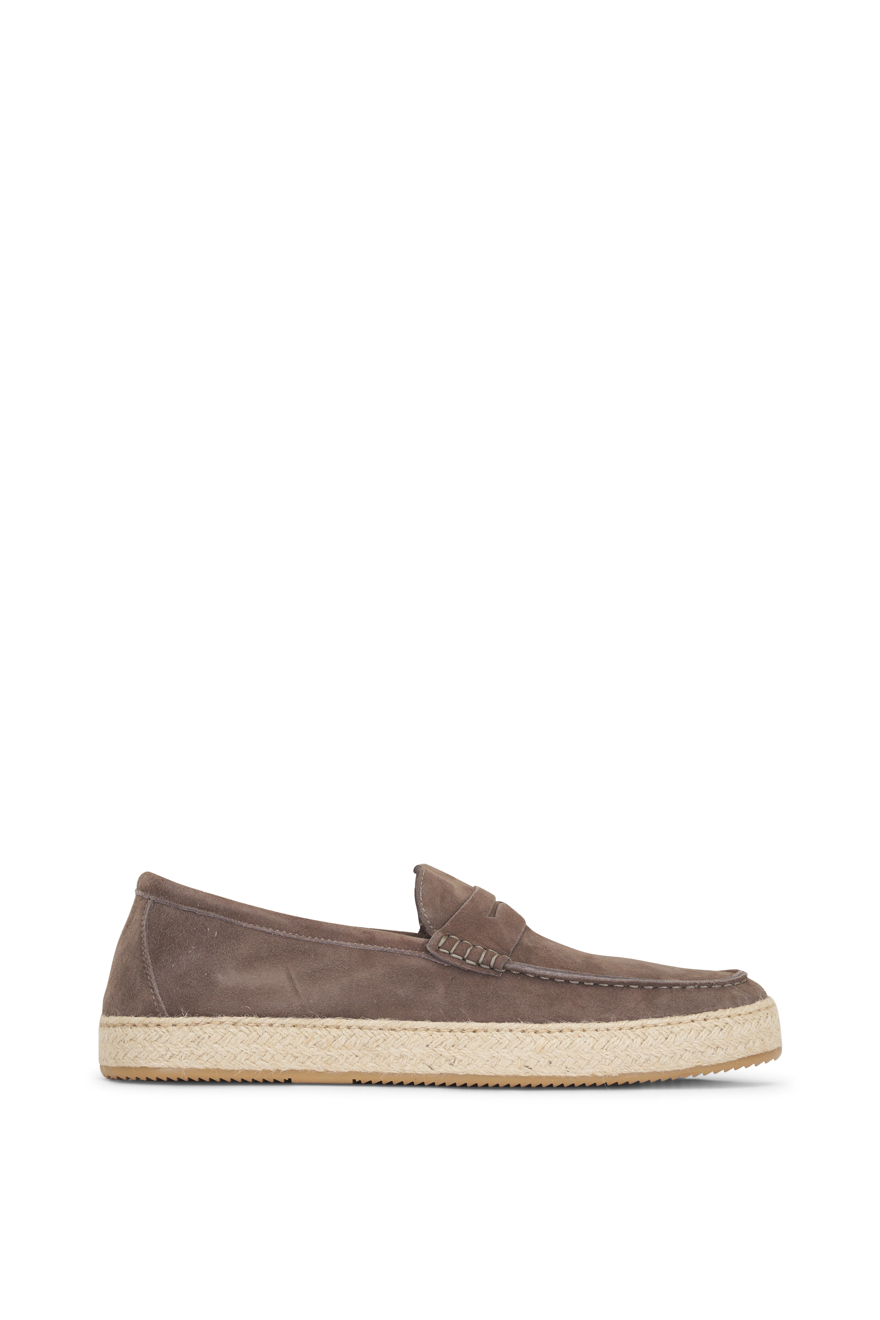 Suede upper. Round apron toe. Slip-on style. Penny strap across vamp. Leather lining and insole. Raffia midsole. Rubber sole. Made in Italy.