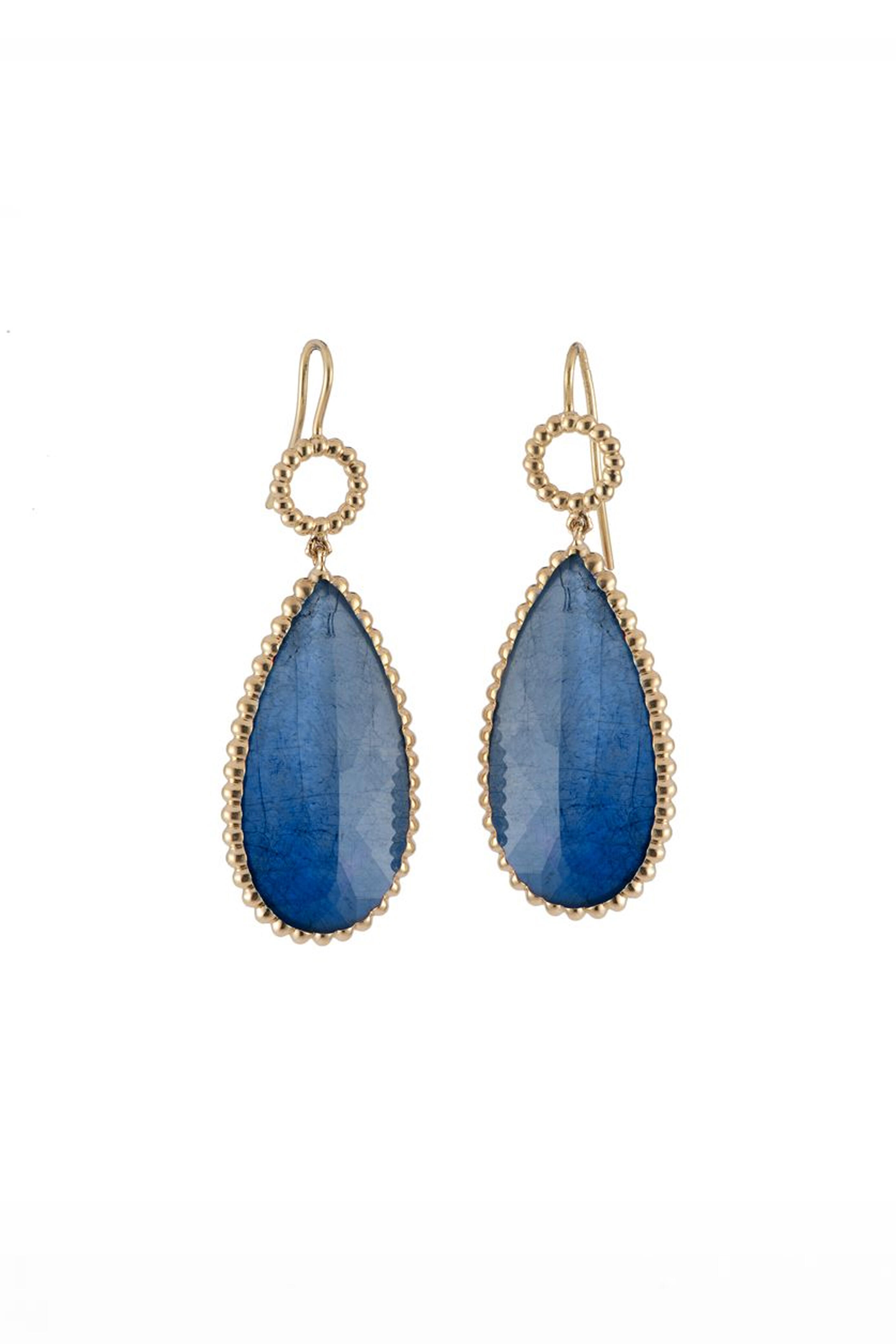 18k gold. Sapphire. Quartz. Teardrop design. Elongated design. Engraved detailing. Drop style. Wire back. Made in the USA.