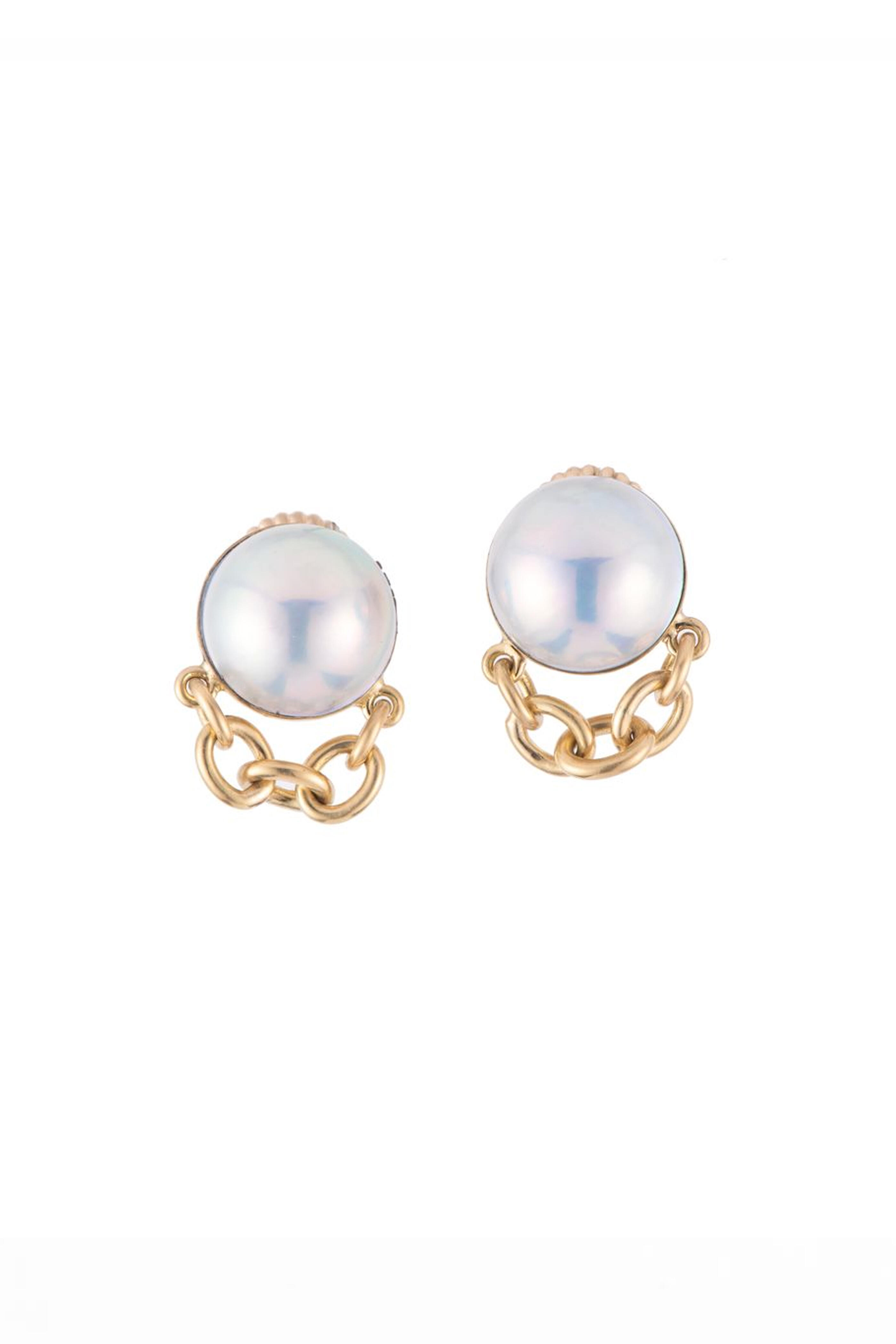 18k gold. Pearl. Chain link. Gold bezel. Stud style. Push back post. Made in the USA.