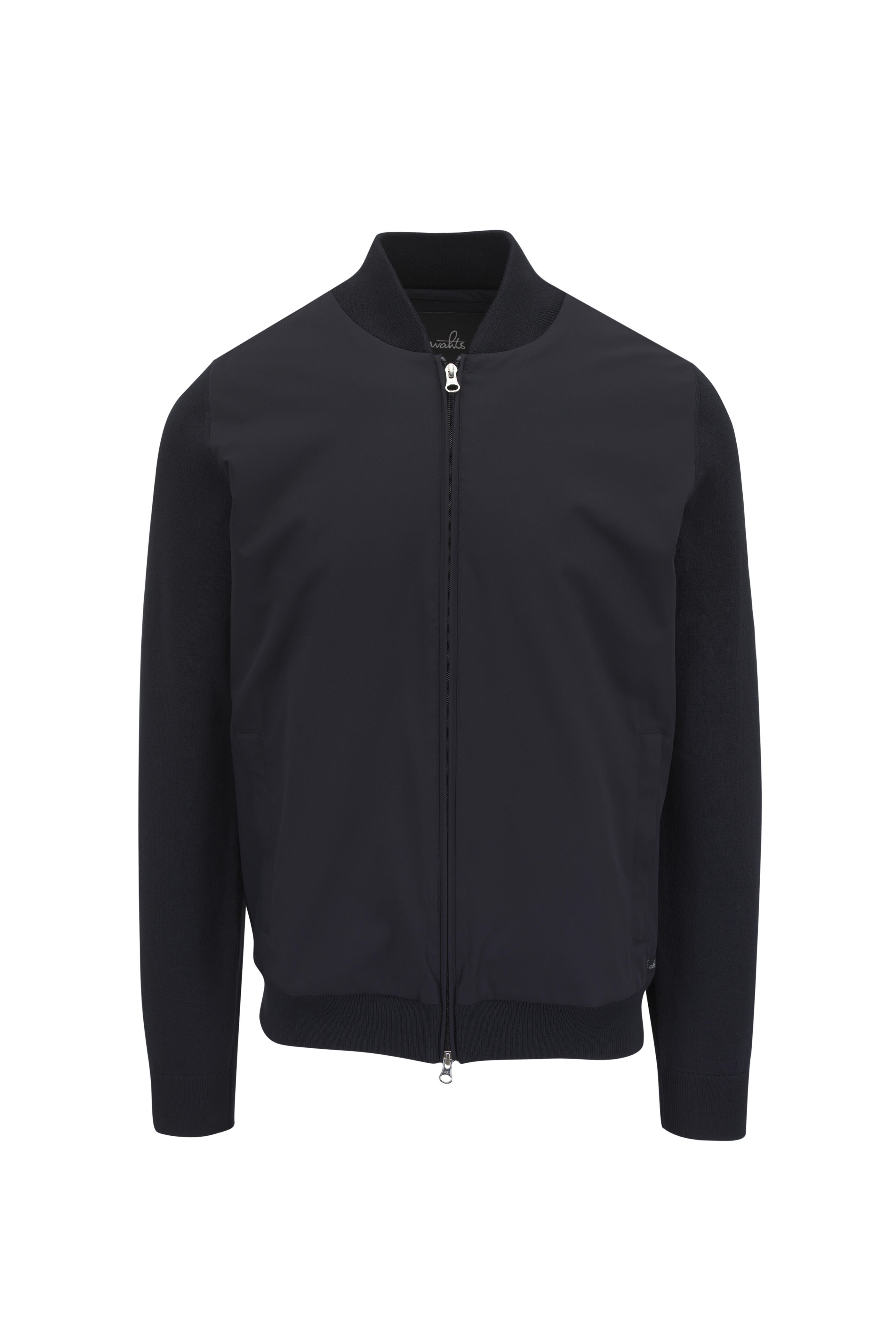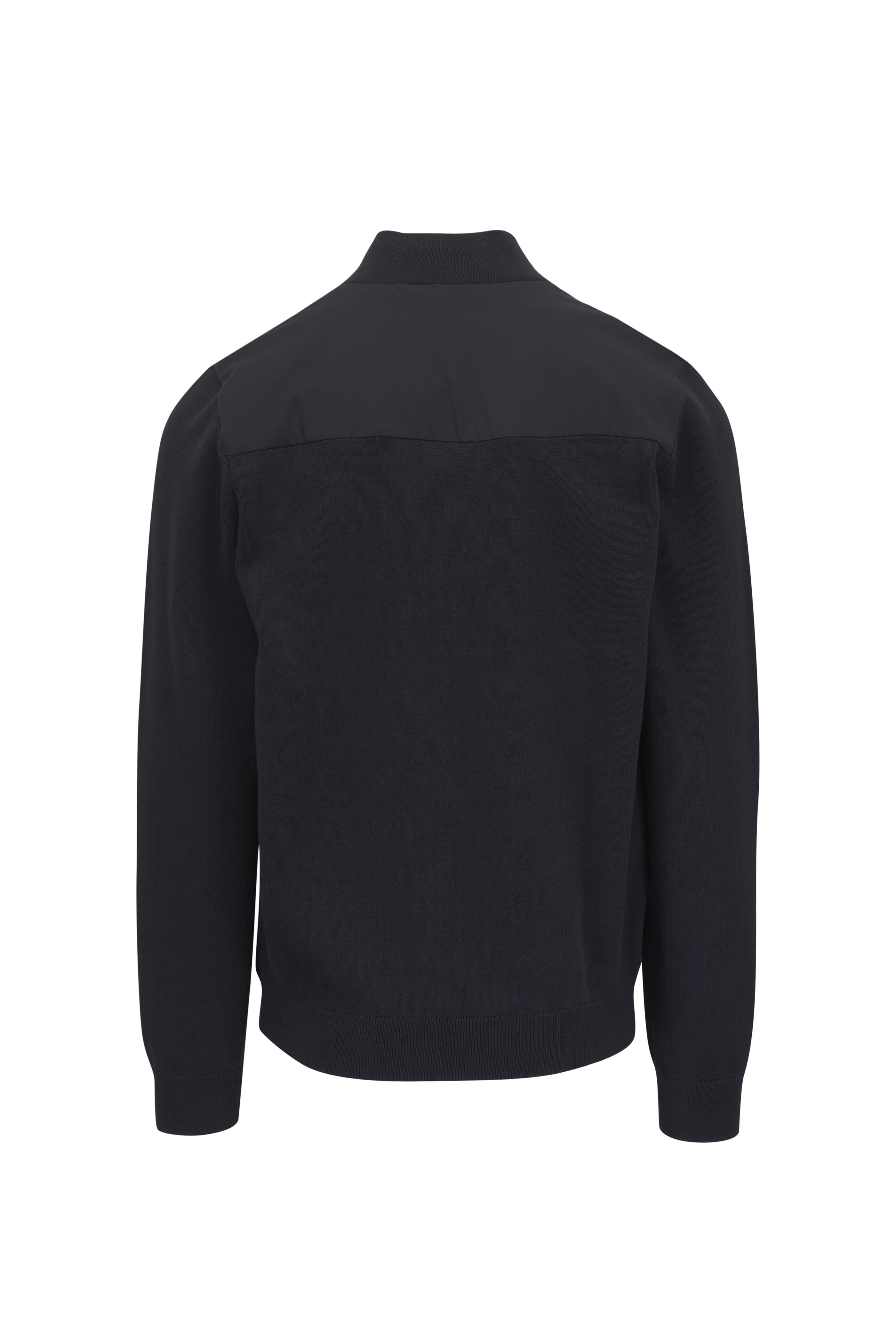 Stand collar. Two-way front zip closure. Lower waist side pockets. Ribbed knit trims. Imported. Back panel/ sleeves: 100% cotton; Front panel: 83% polyamide, 17% elastane. Dry clean.