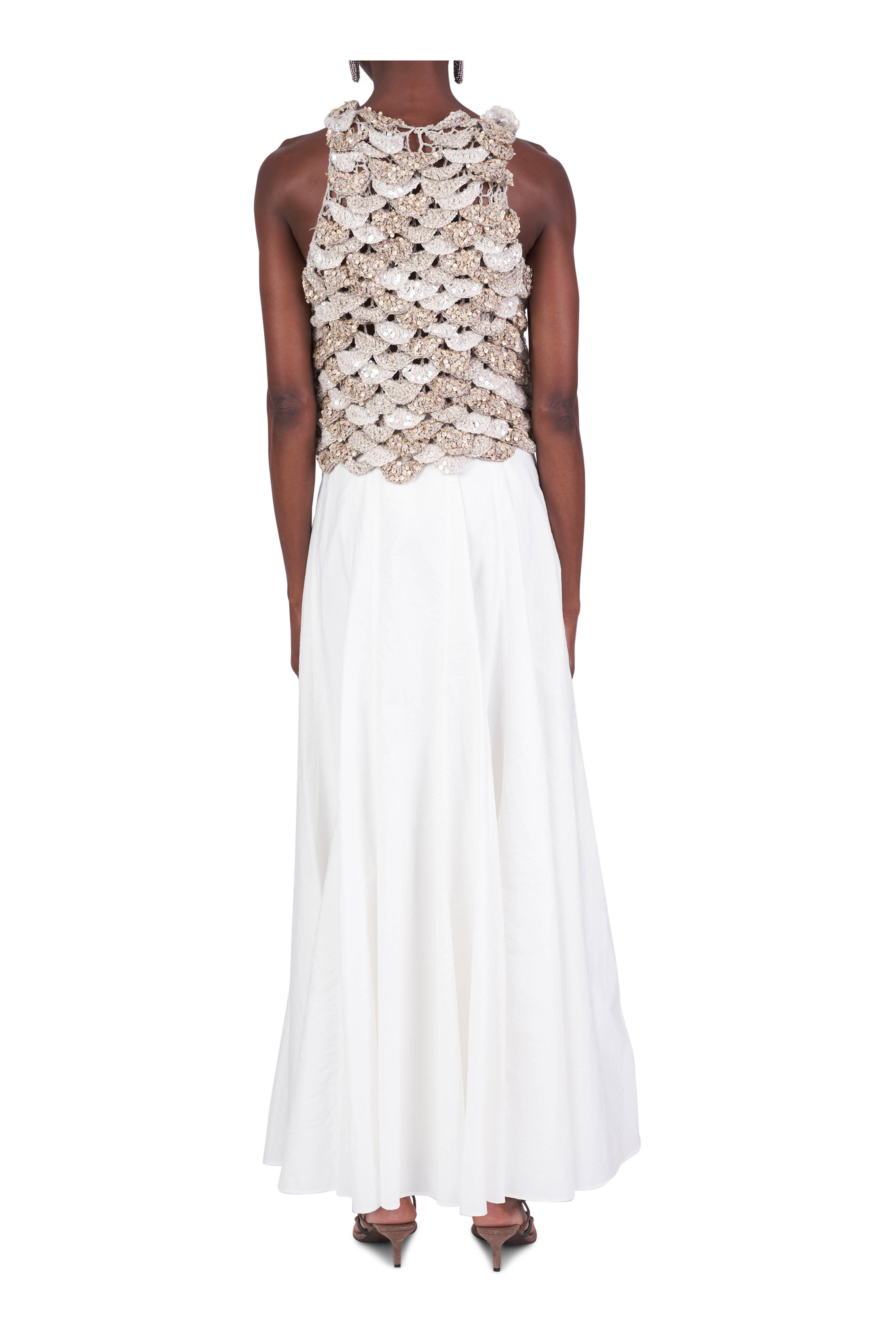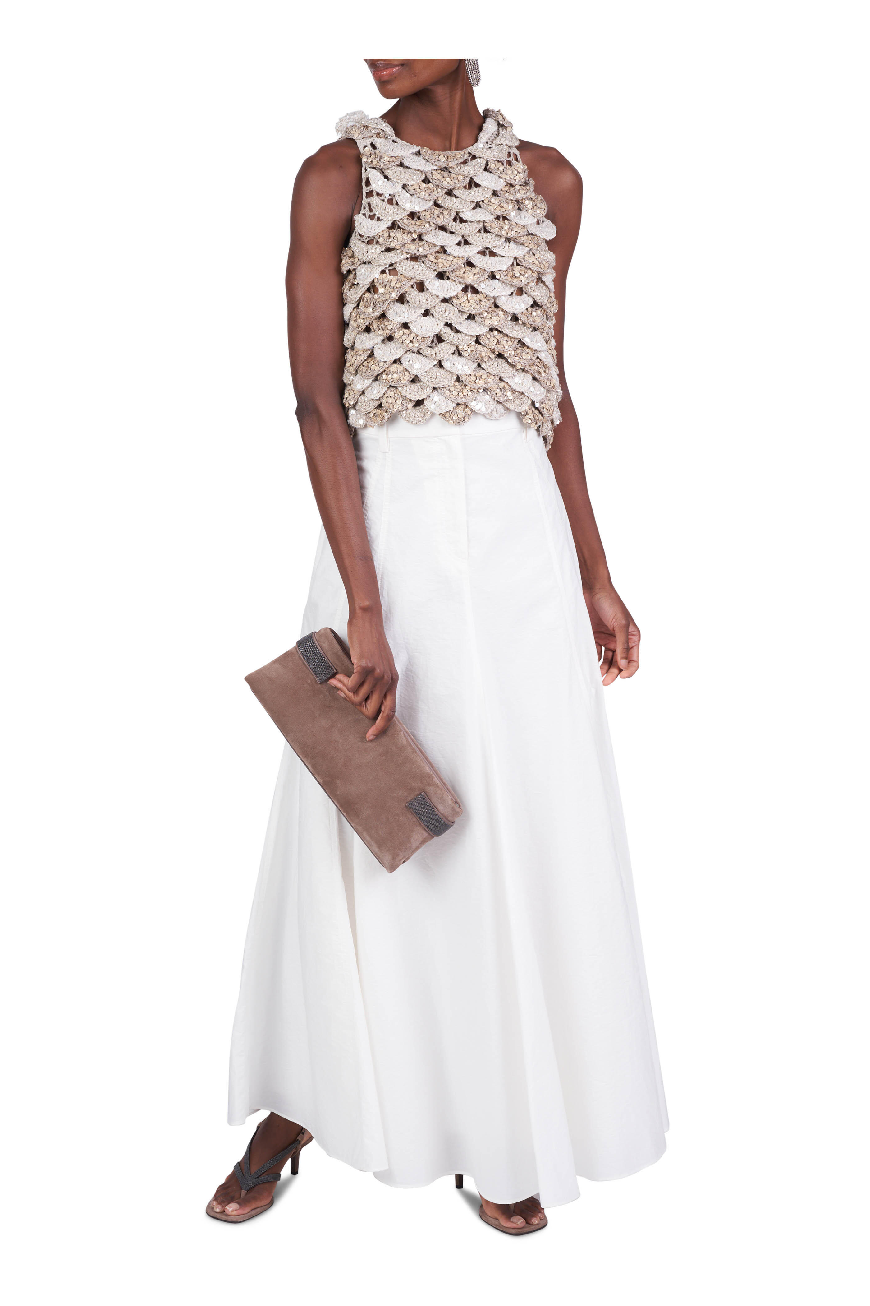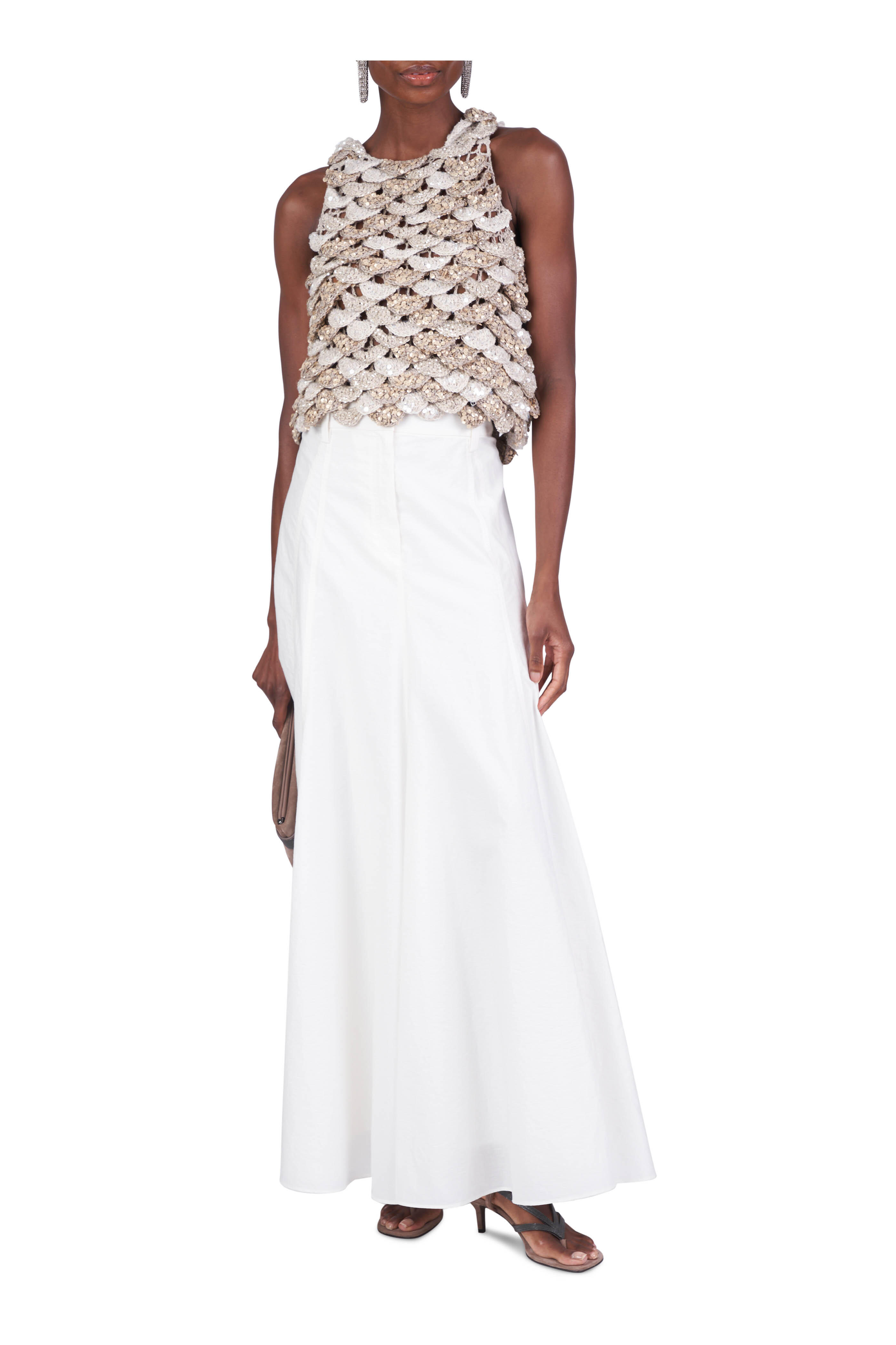 Zip fly; hook-and-bar closure. Banded waist; belt loops. Monili detailing. Made in Italy. 75% cotton, 25% nylon; lined. Dry clean.