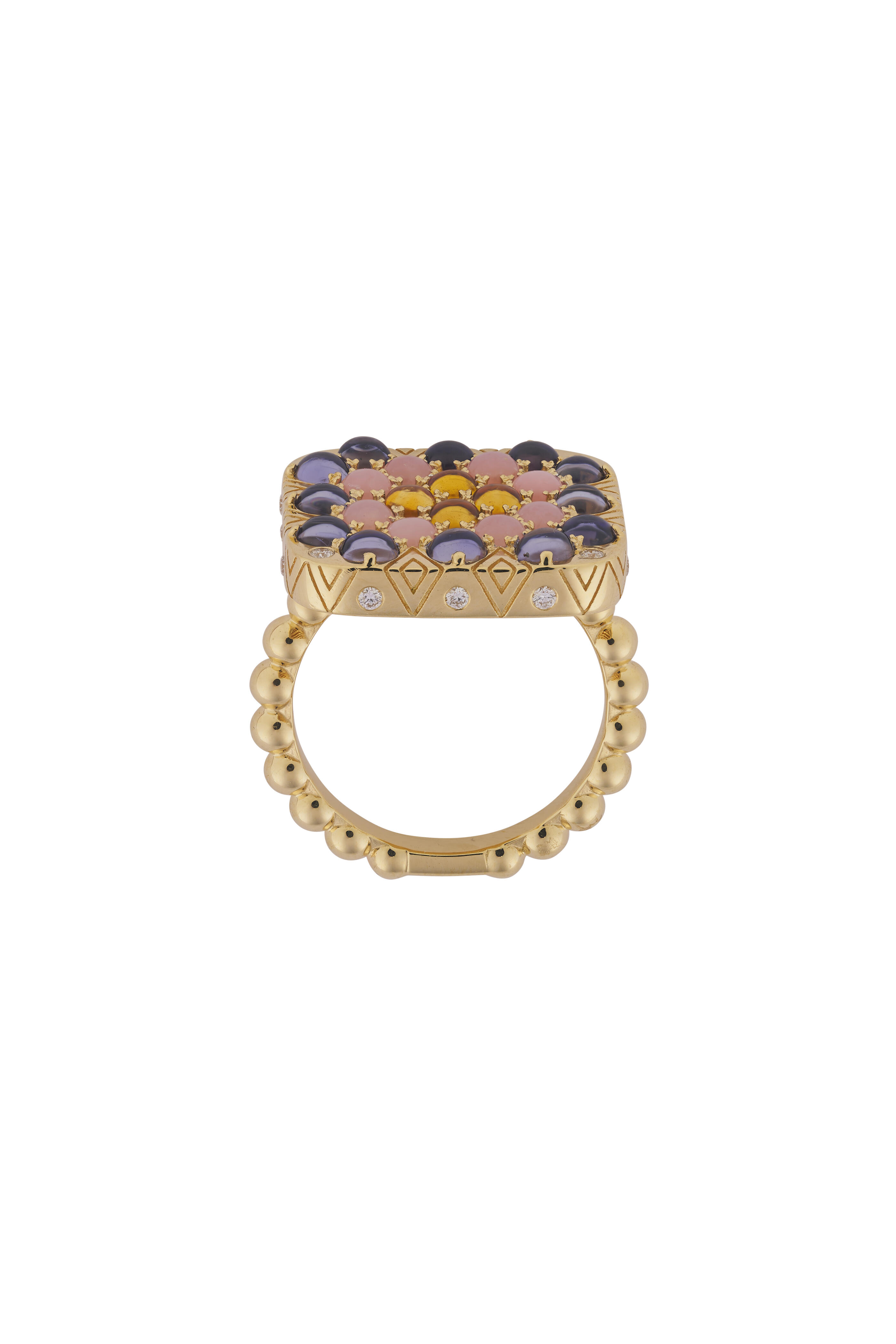 18k gold. Diamond 0.29 total carat weight. Citrine 0.43 total carat weight. Pink Opal 0.73 total carat weight. Iolite 1.32 total carat weight. Engraved detailing. Inspired design by the 70s. Signet style. Made in the USA. Call for ring size.