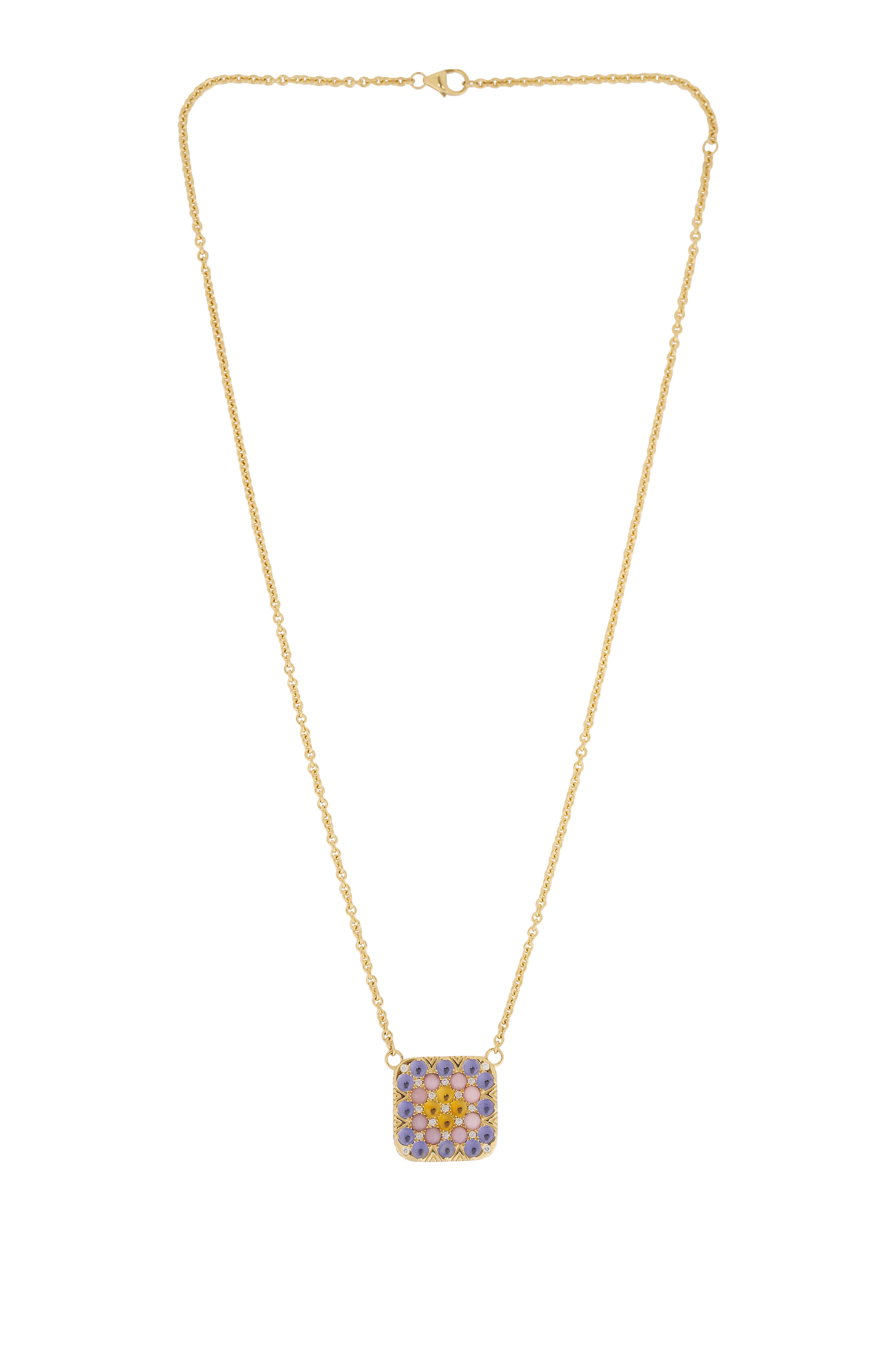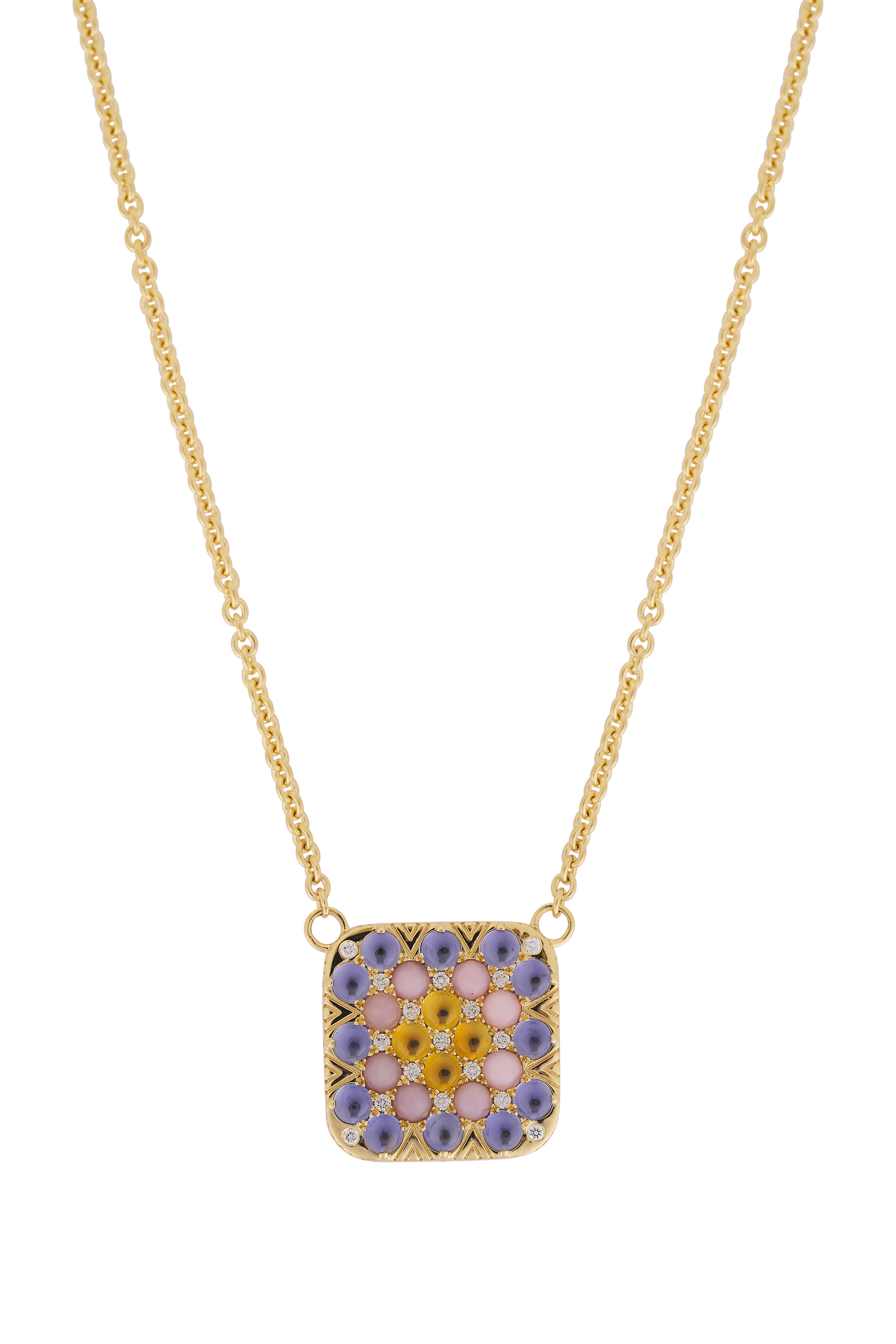 18k gold. Diamond 0.17 total carat weight. Blue Calcedony0.48 total carat weight. Orange Carnelian 0.92 total carat weight. Engraved detailing. Inspired design by the 70s. Cable chain. Lobster claw clasps. Made in the USA. Length: 16-18".