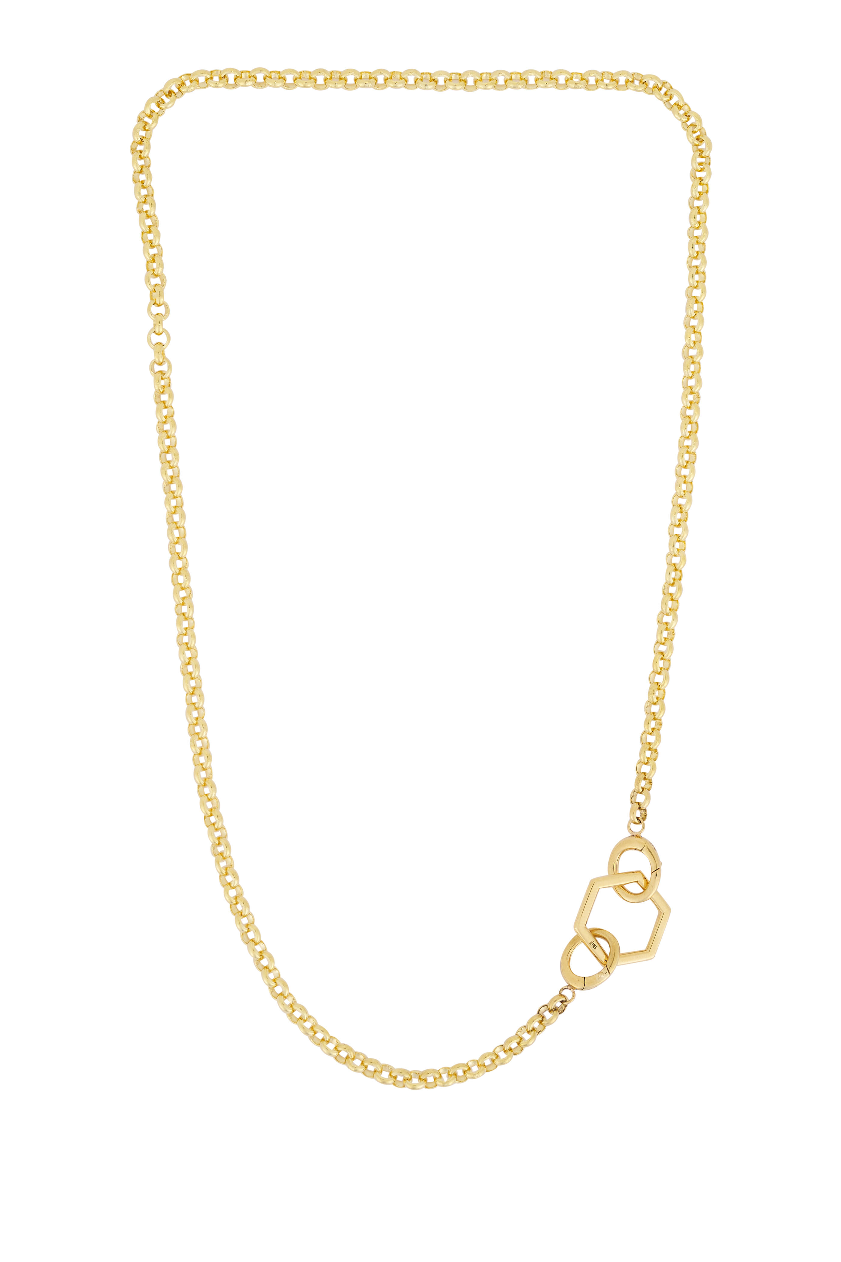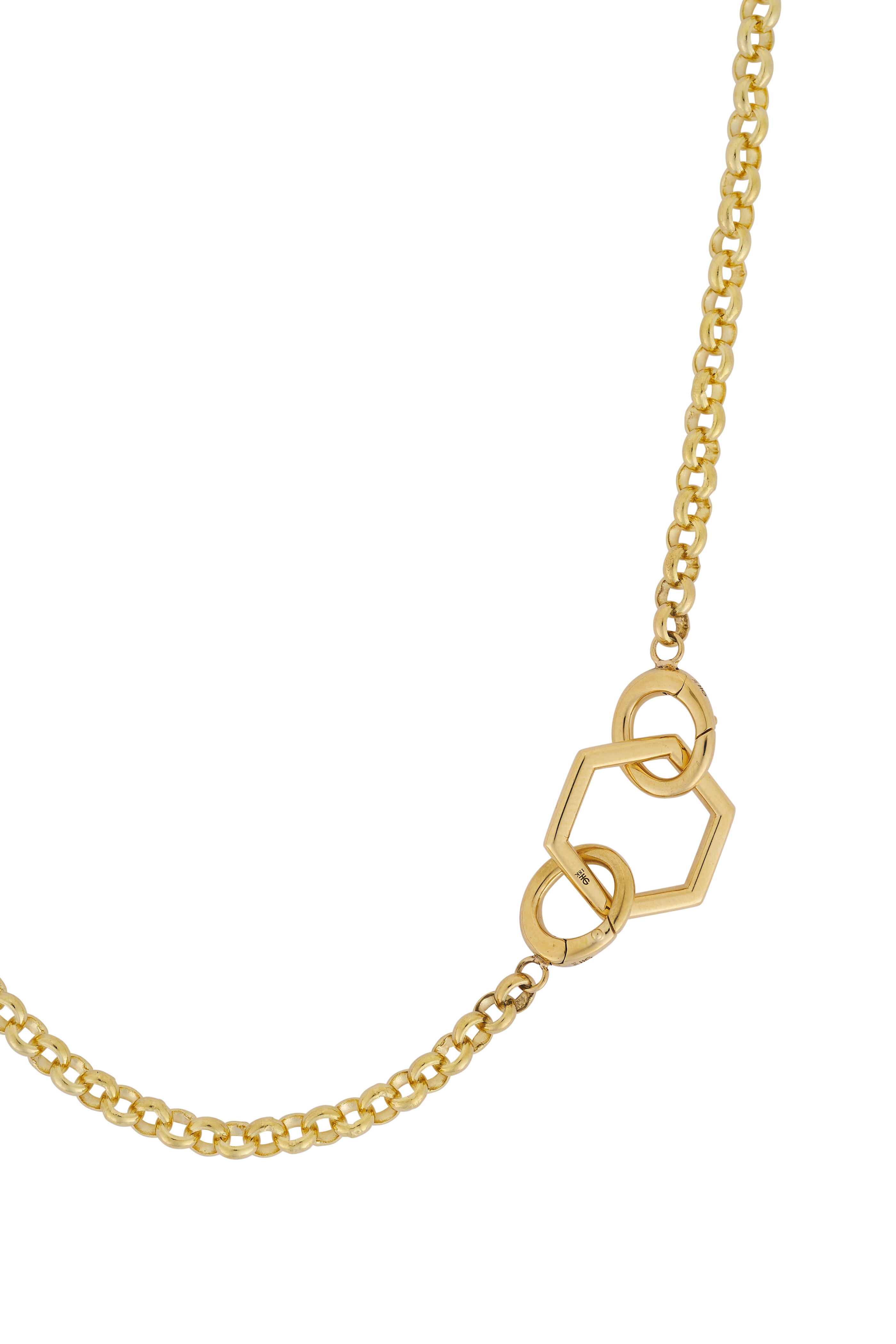 18k gold. Open bail design. Rolo chain. Large lobster claw clasps. Made in the USA. Length: 18".