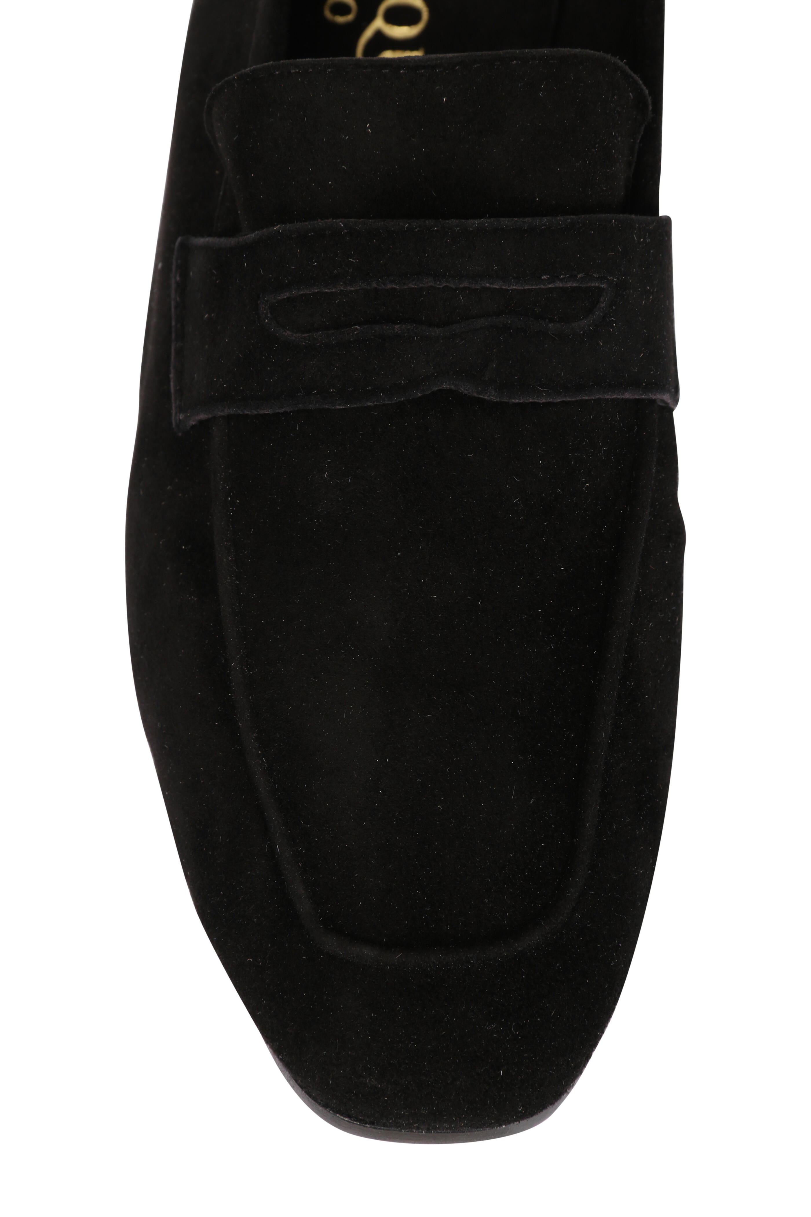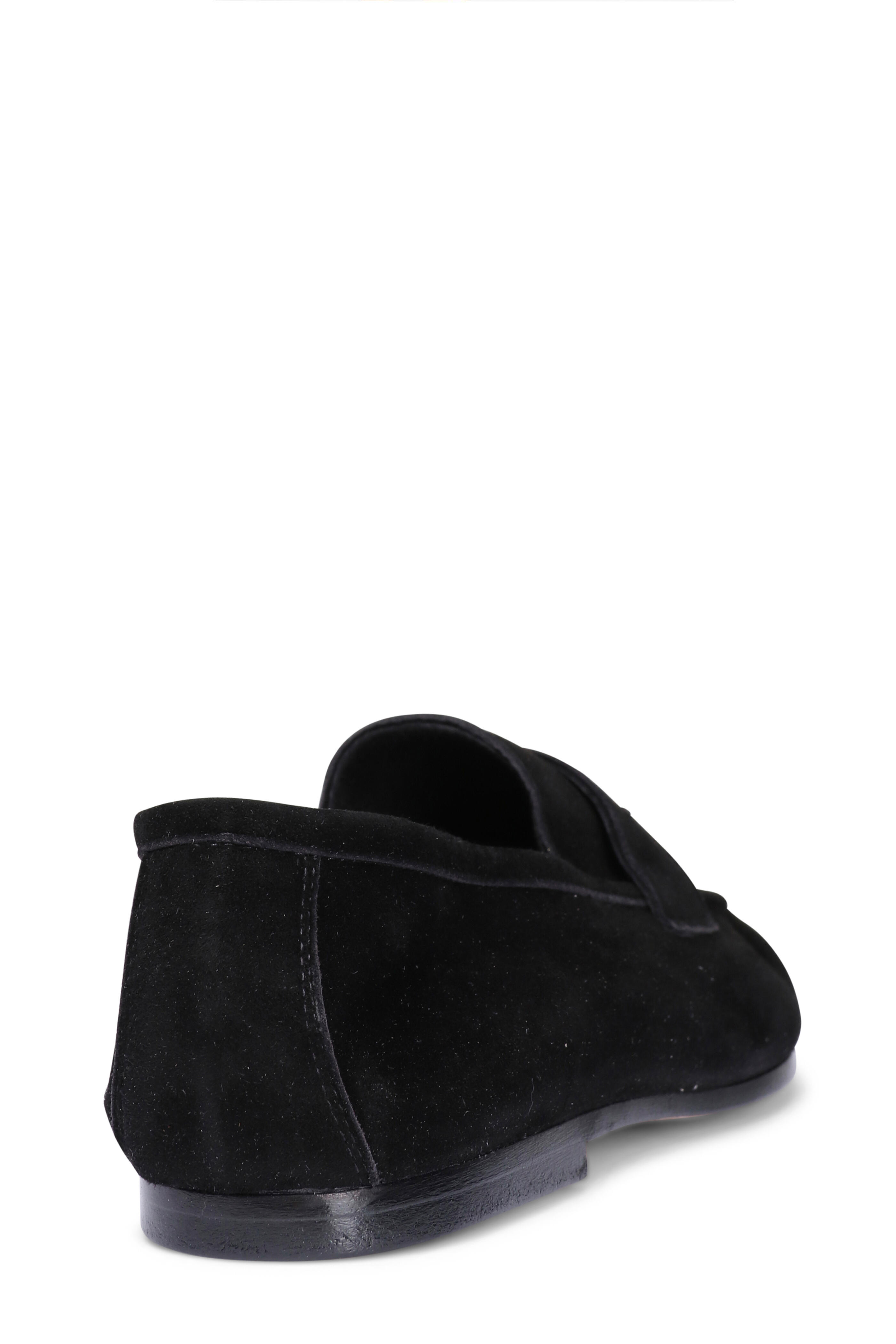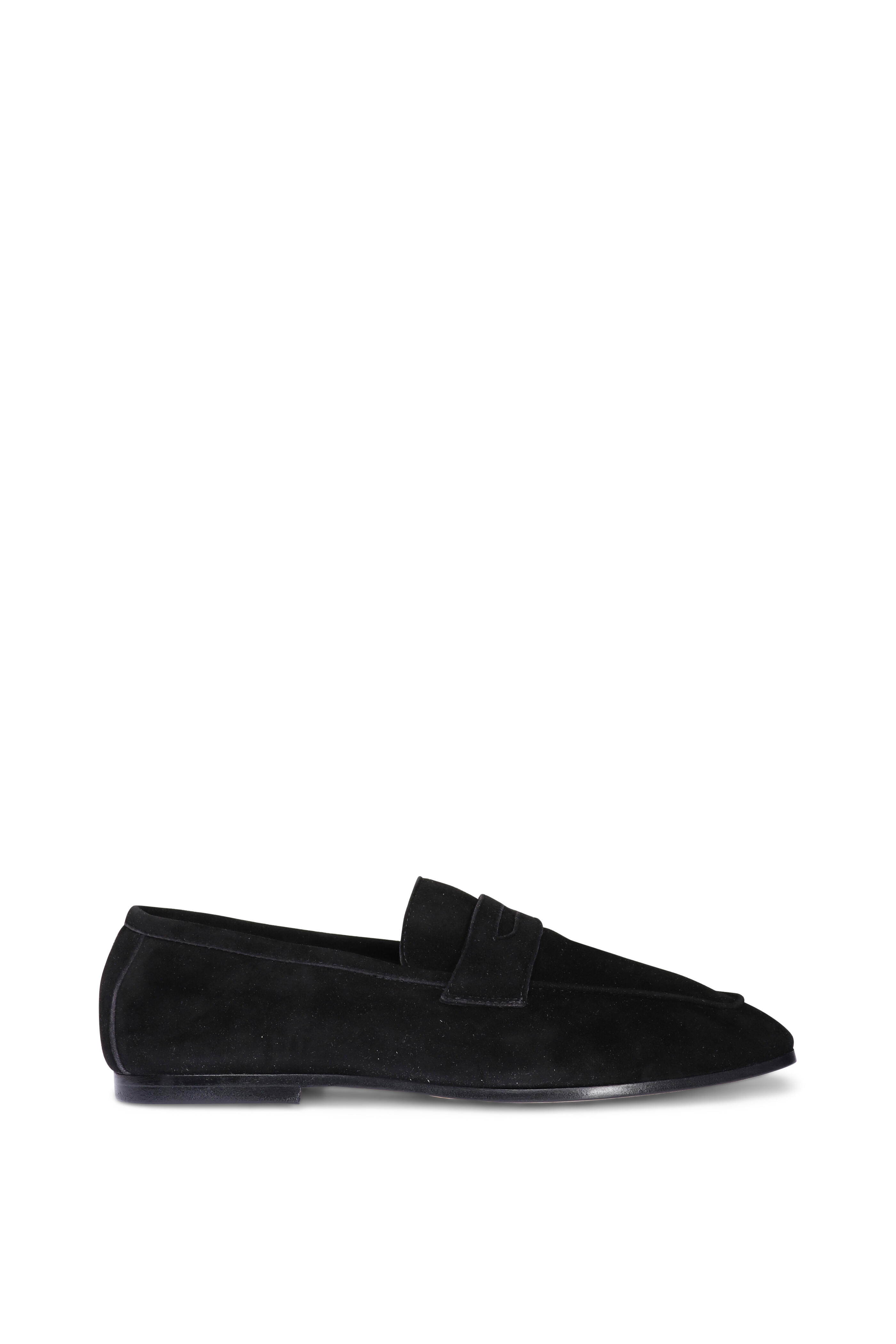 Suede upper. Leather lining and sole. Reinforced apron toe. Notched vamp. Strap with penny holder. Slip-on style. Tonal stitching. Made in Italy.