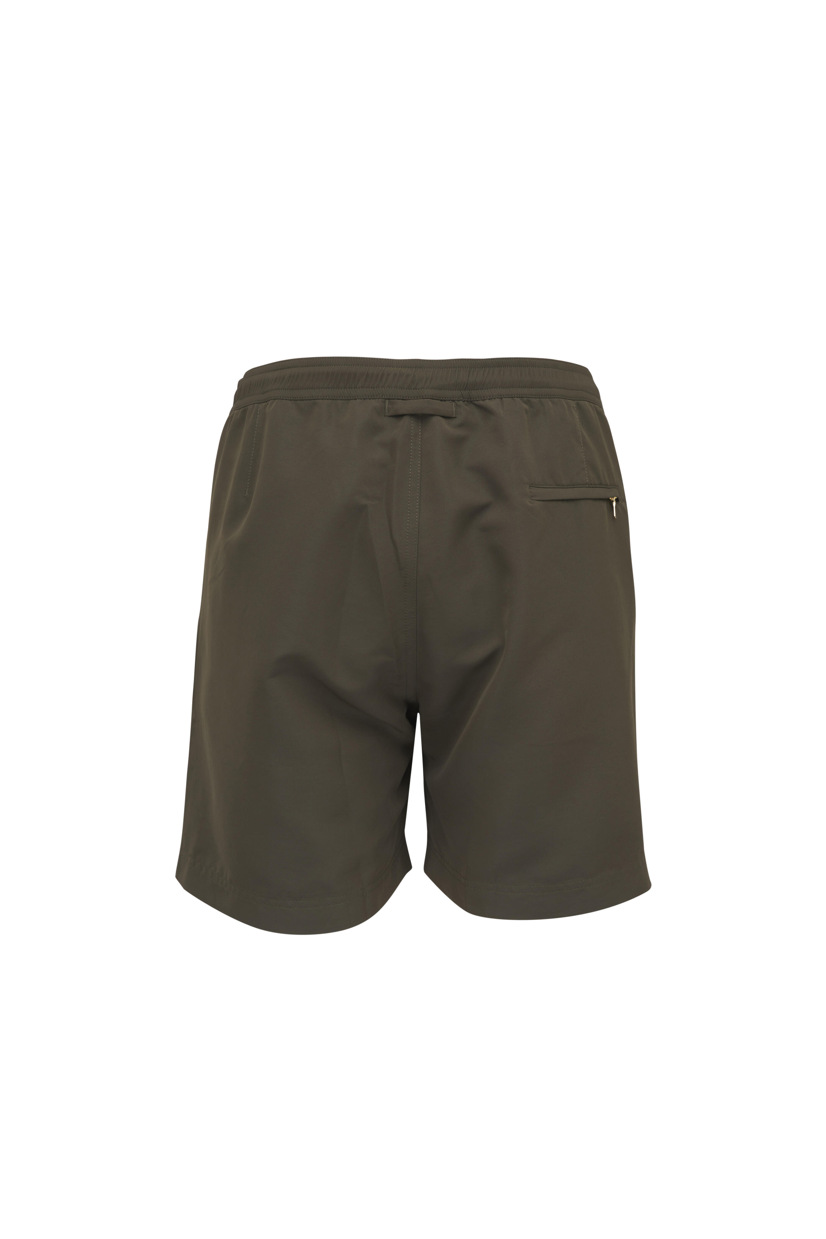 Concealed front zip and snap button closure. Partially elasticized waistband with adjustable drawstring. Side angle pockets, front snap coin pocket, back zip pocket. Imported. 100% polyester; mesh lining. Machine wash.