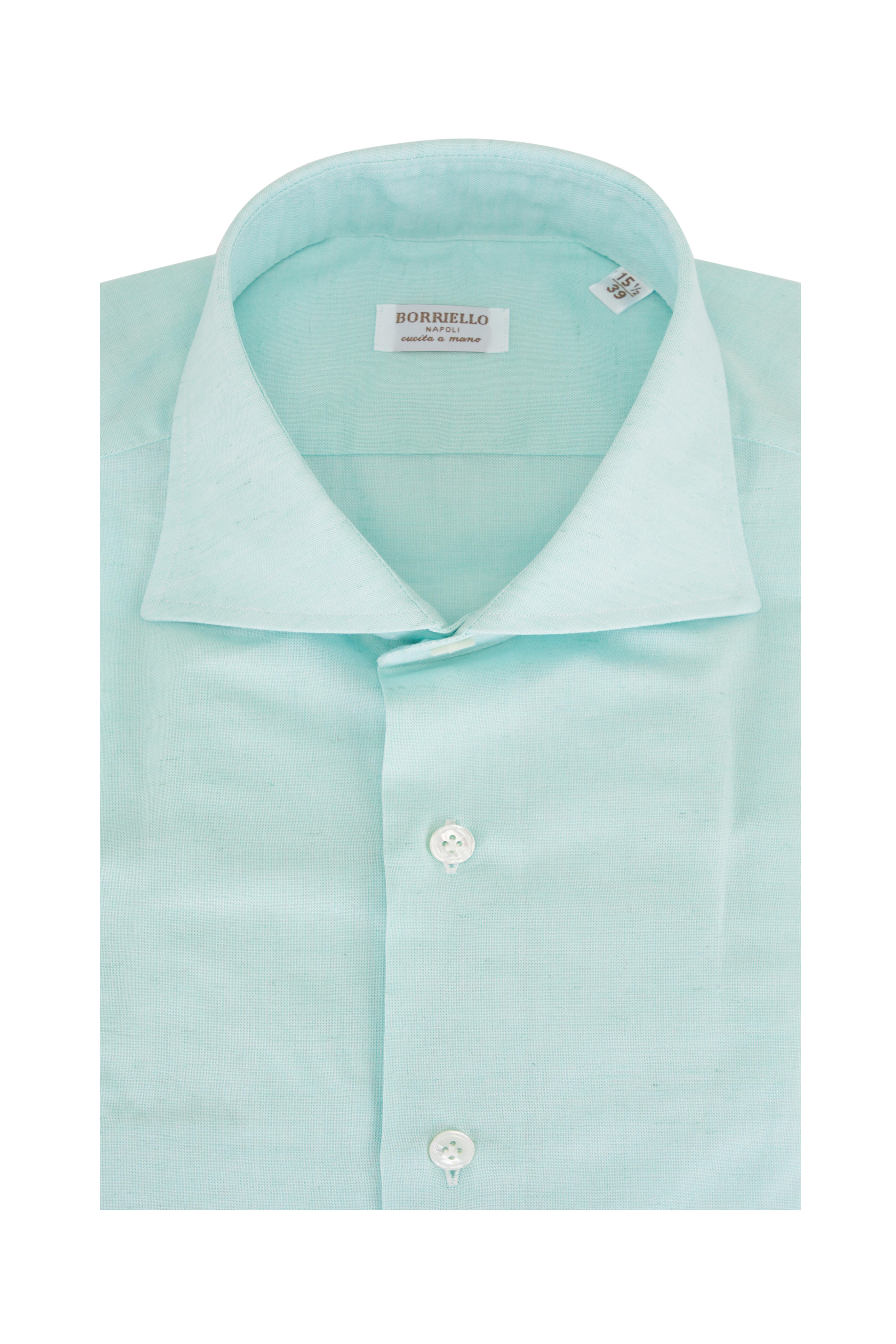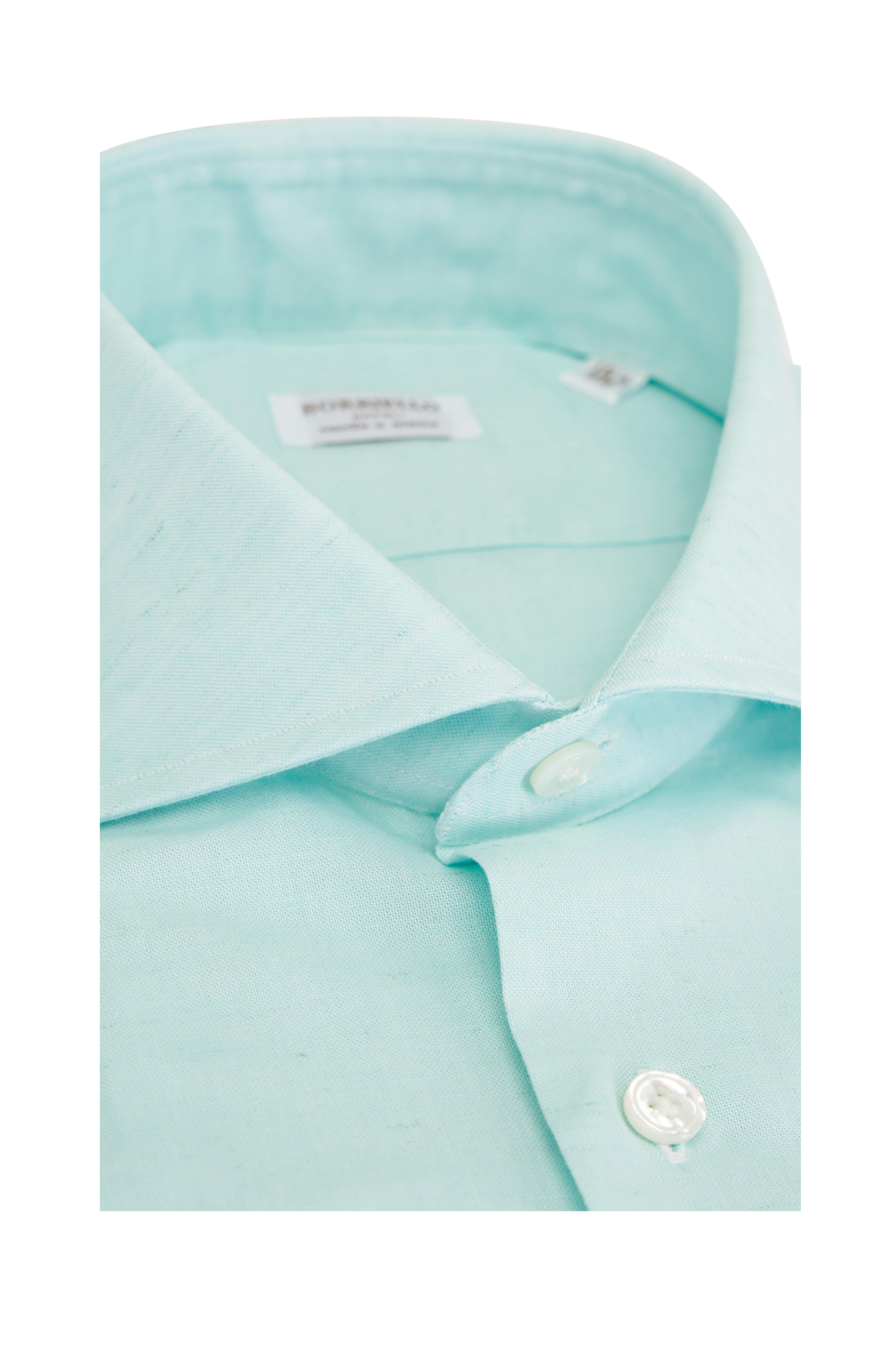 Spread collar. French front button placket. Single button barrel cuffs. Made in Italy. 100% cotton. Machine wash.