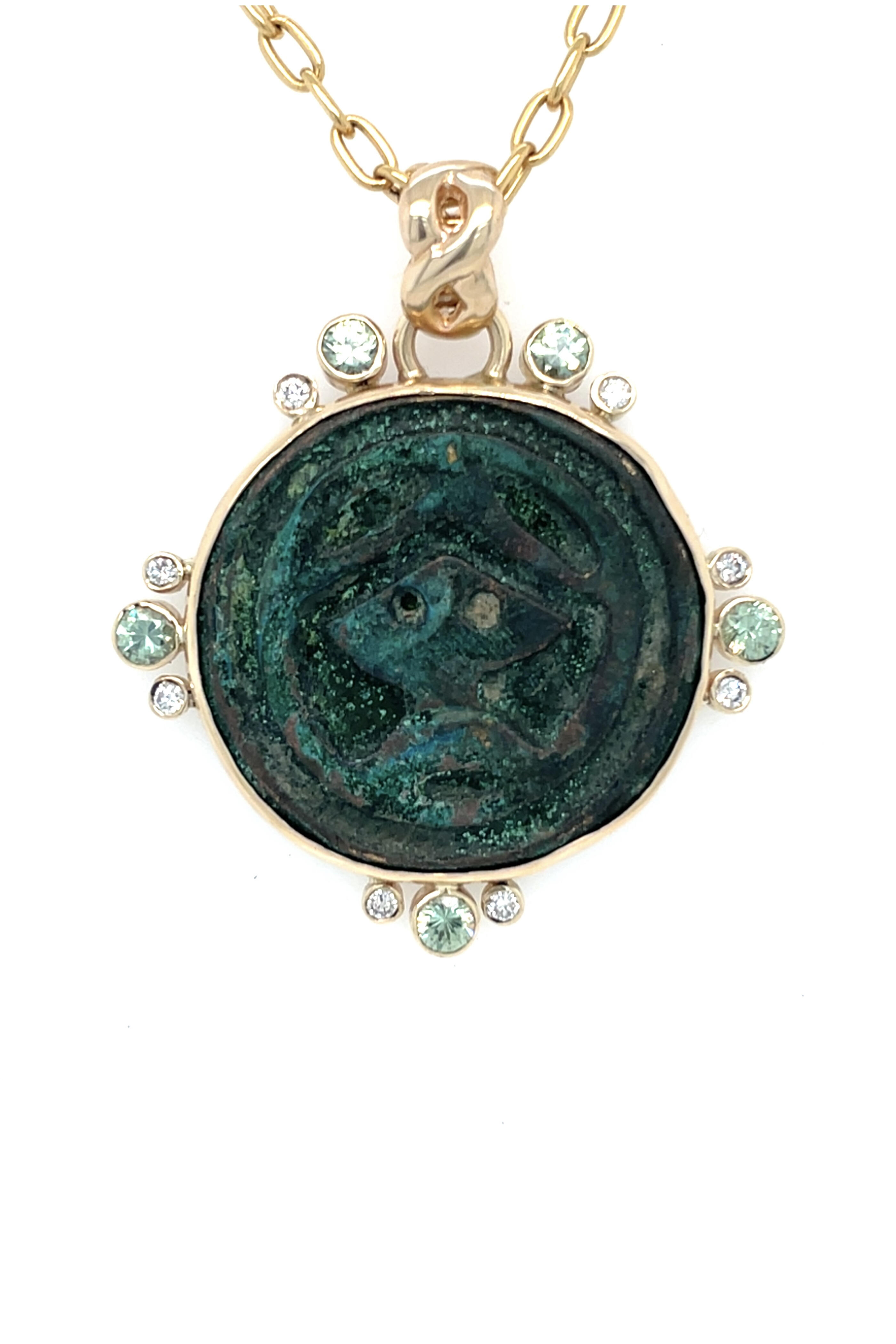 14k gold. Bronze. White diamond. Garnet. Ancient Viking bronze emblem of Viking world surrounded by water. Ca. 1050 CE.. Gold bezel. Infinity bail. Made in the USA. Diameter: 1.75”.