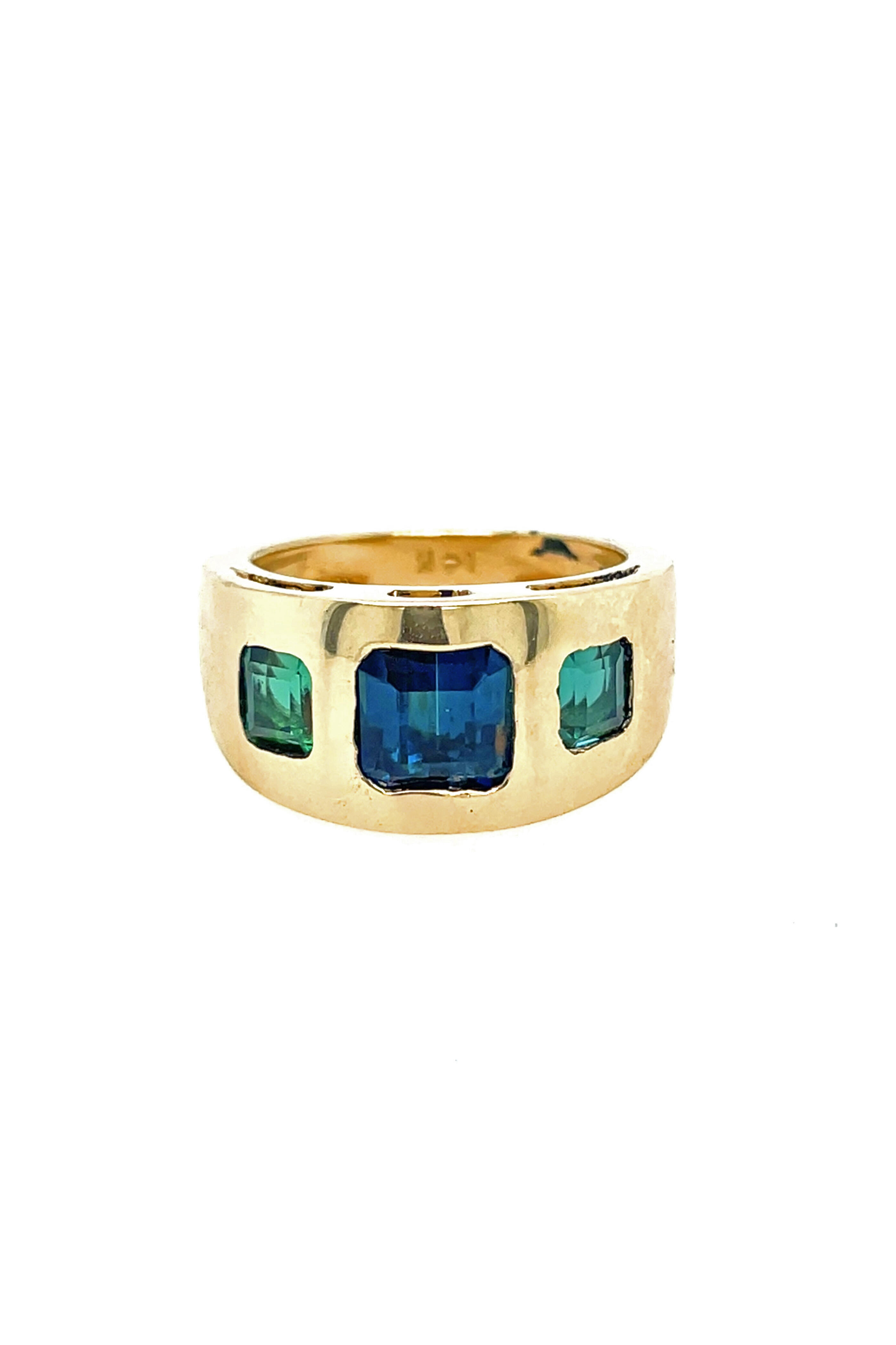 14k yellow gold. Blue tourmaline 1.44 total carat weight. Green tourmaline 1.53 total carat weight. Princess cut stone with elongated green tourmaline on sides. Gold bezel. Made in the USA. Ring size 7.