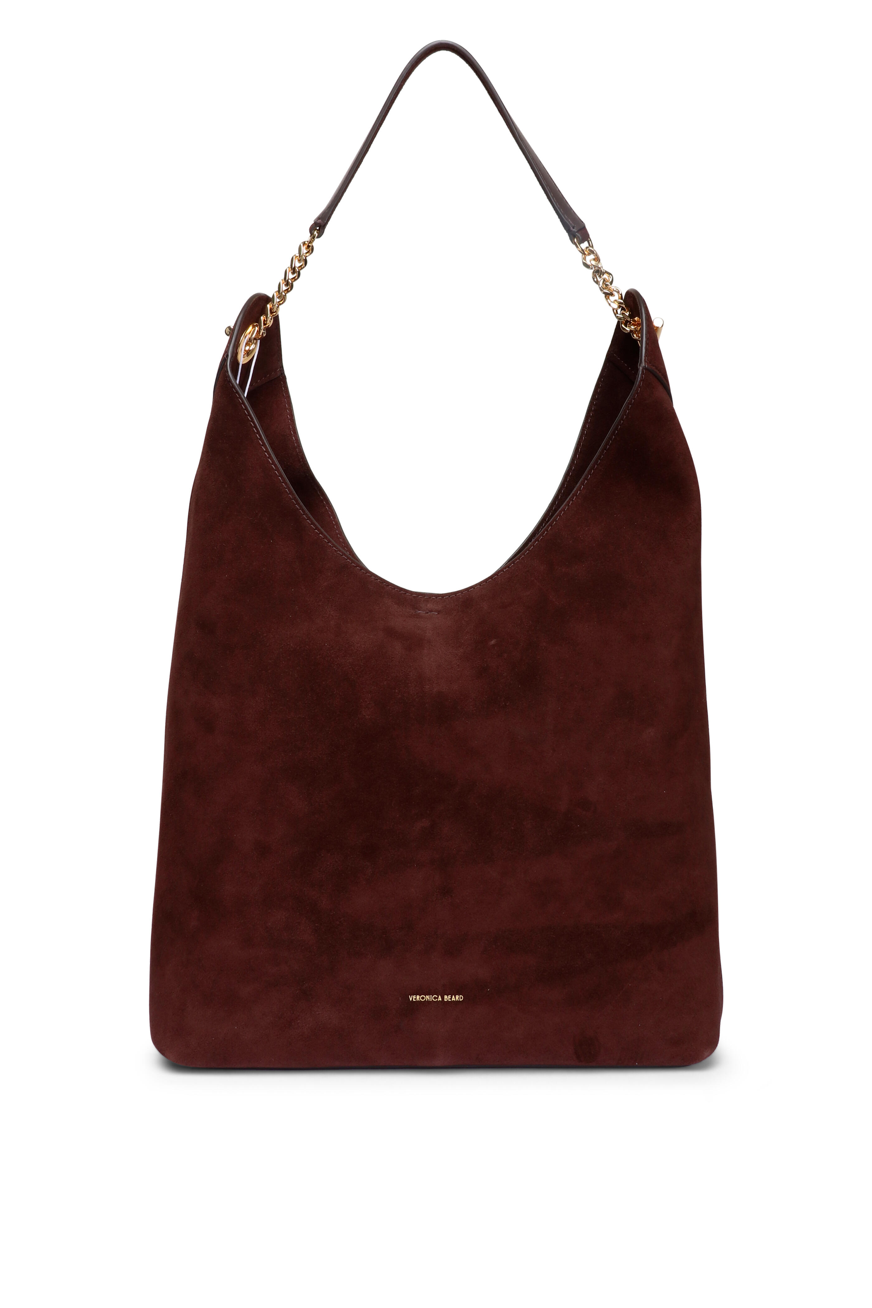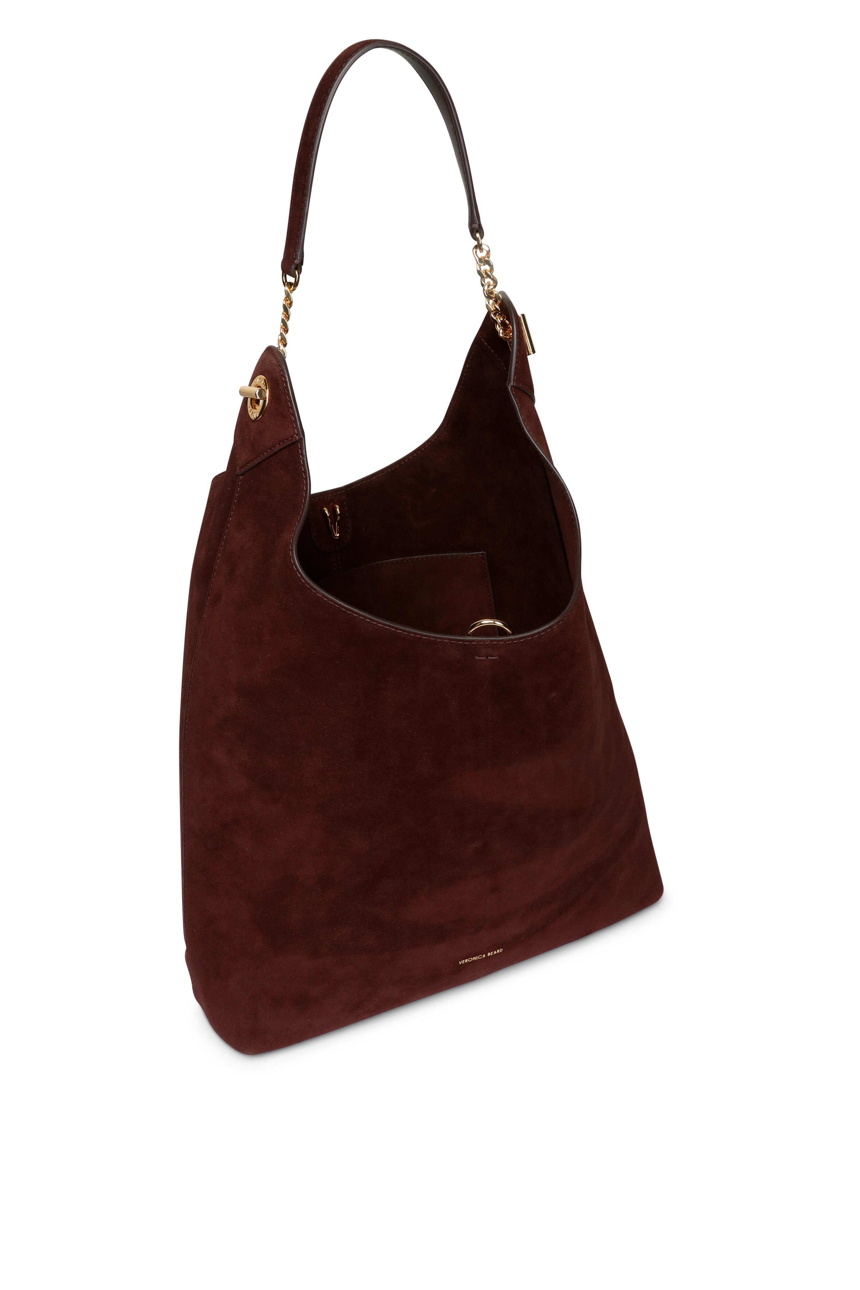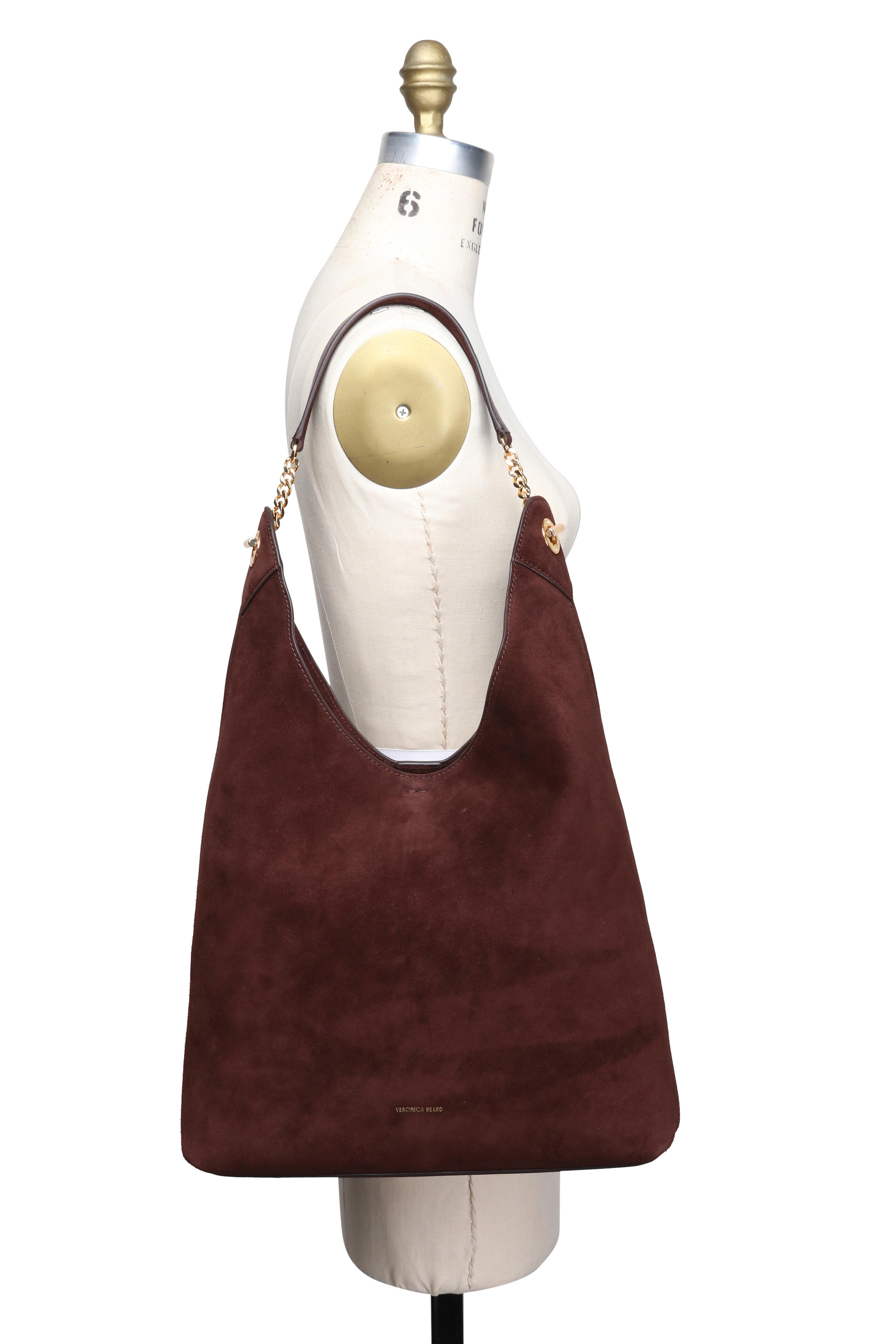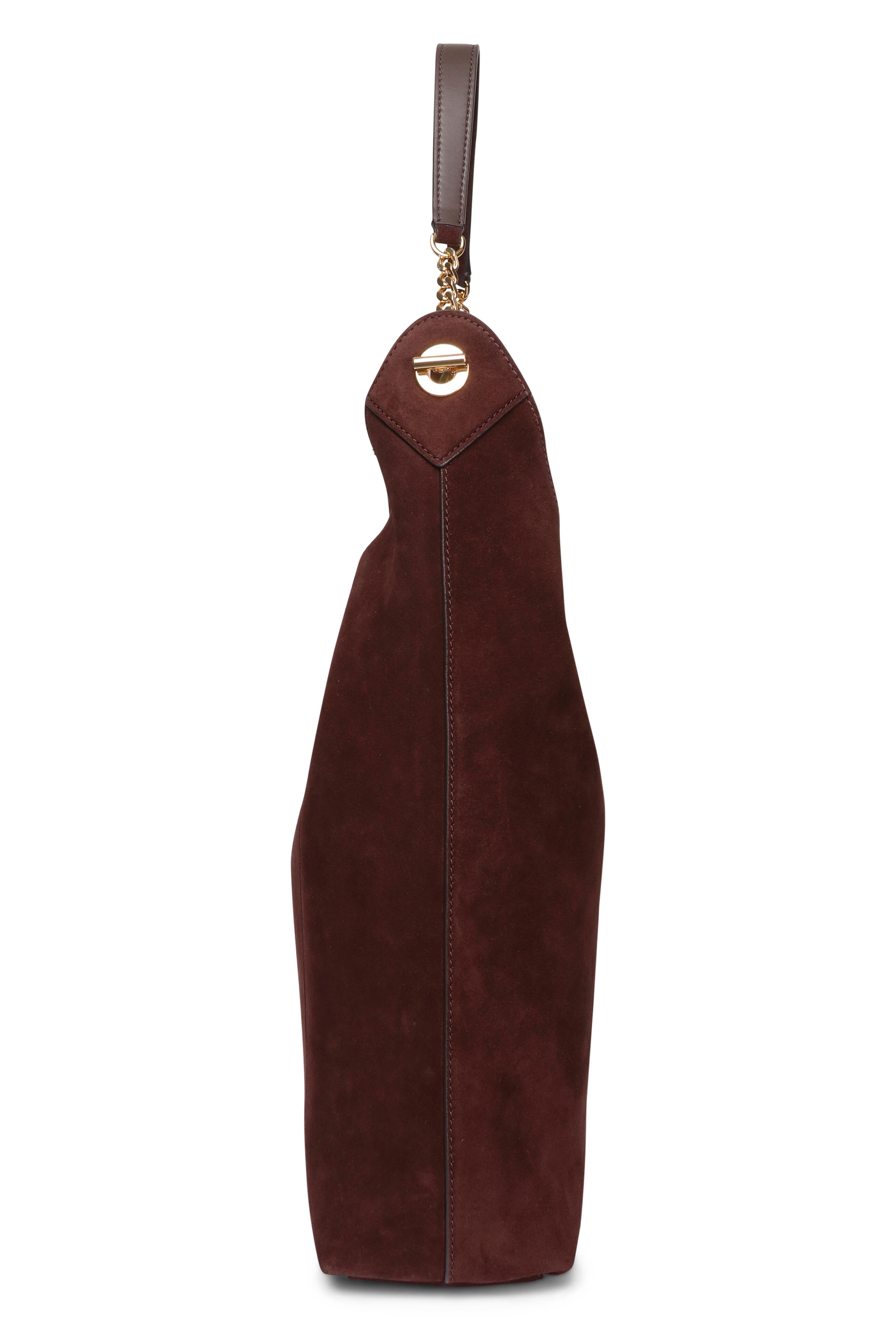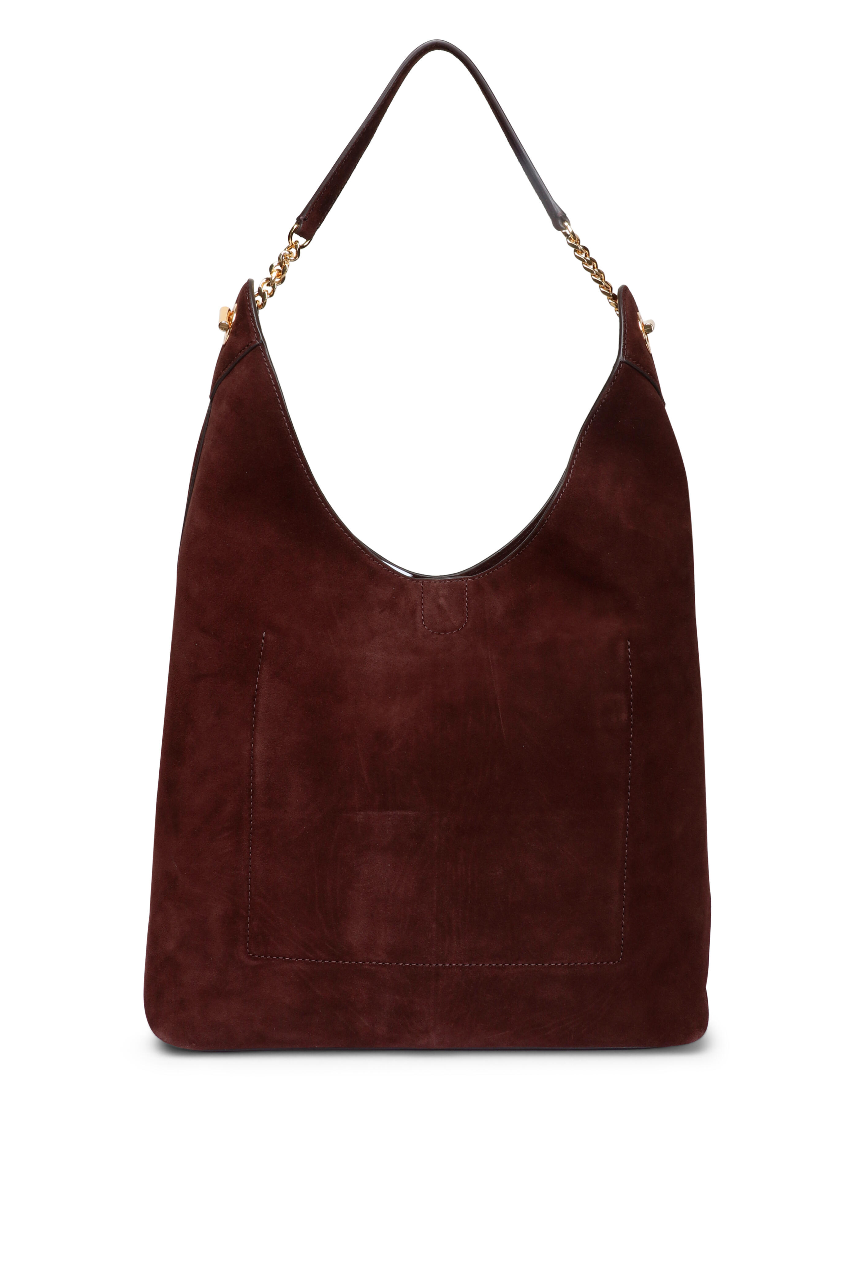 Toggle clasps. Single top handle; chain and leather. Slouchy north-south silhouette. Gold-ton hardware. Interior slip pocket. Imported. 13.4” L x 3.5” W x 12.2” H. Handle drop: 12.6”. 100% Italian suede outer. 100% leather lining.