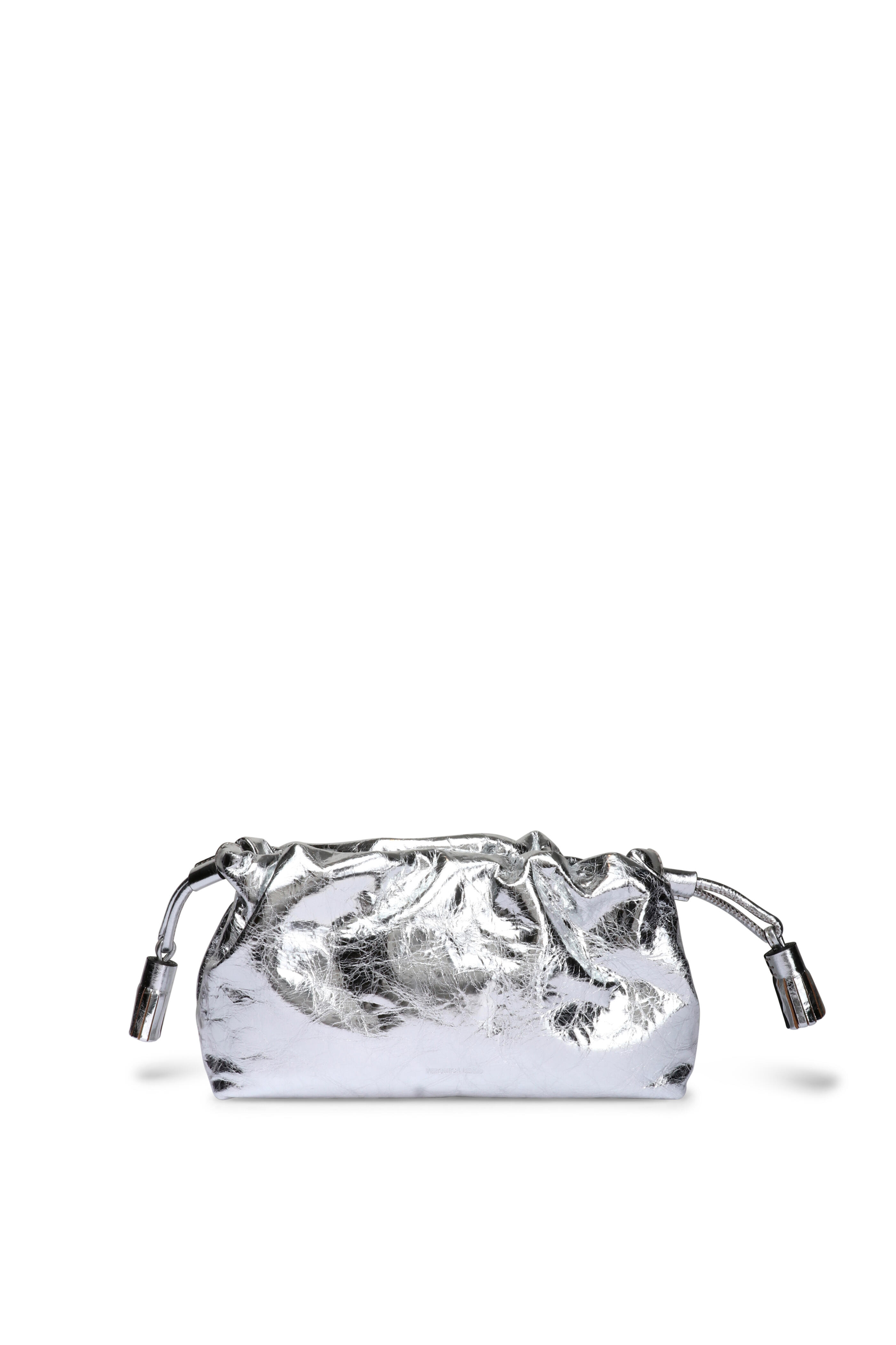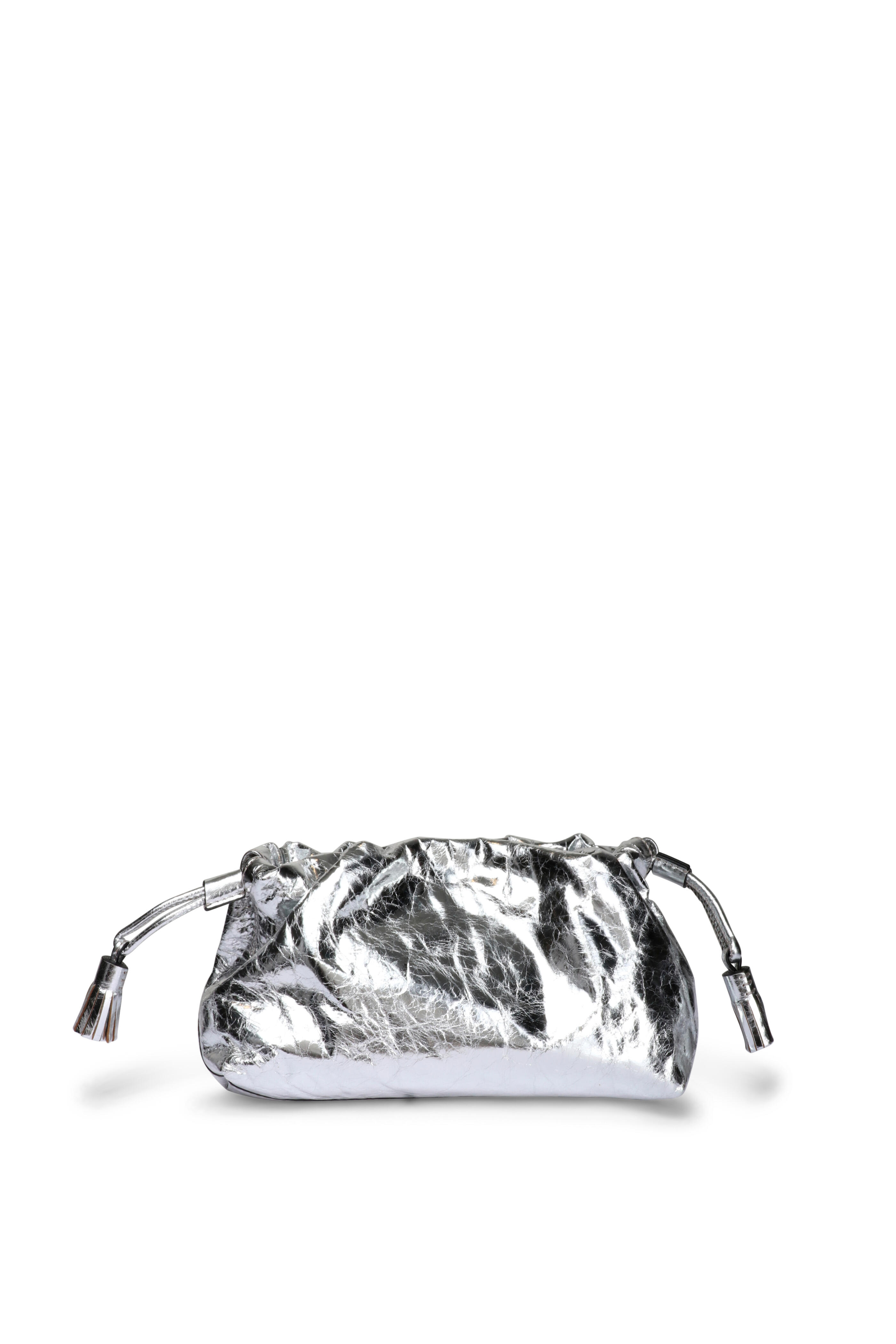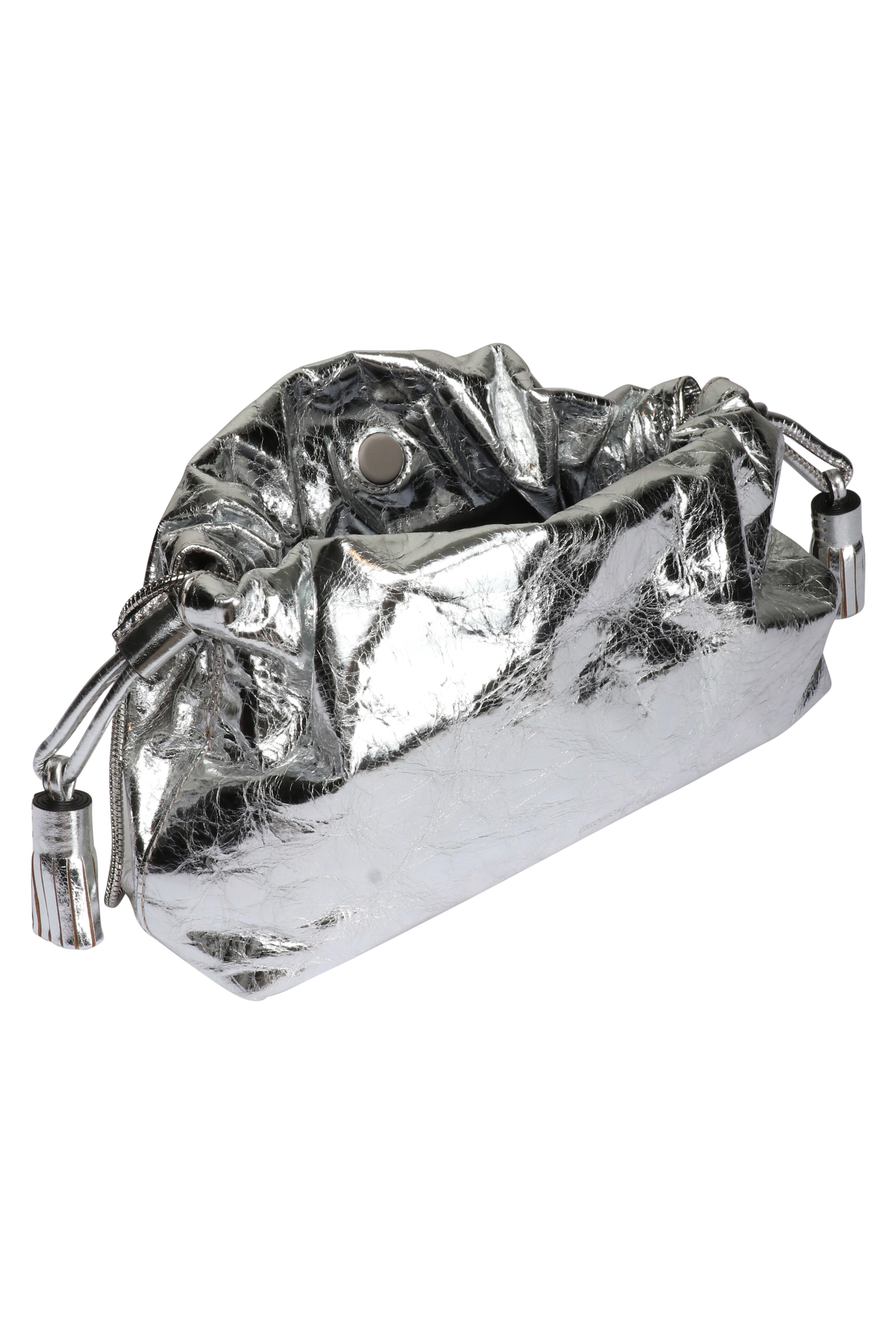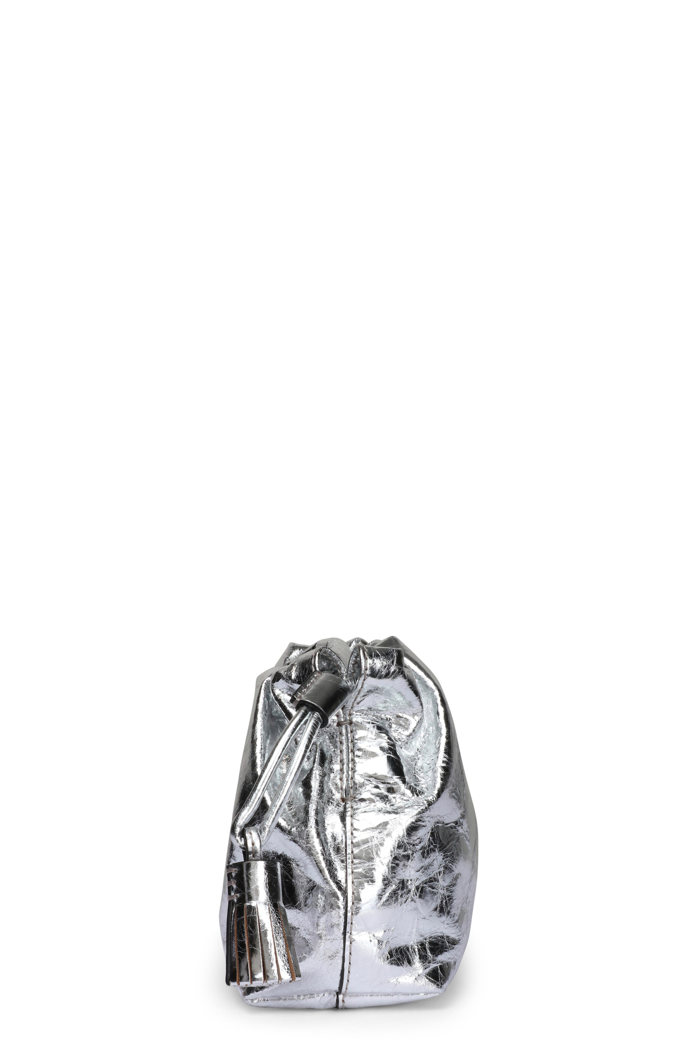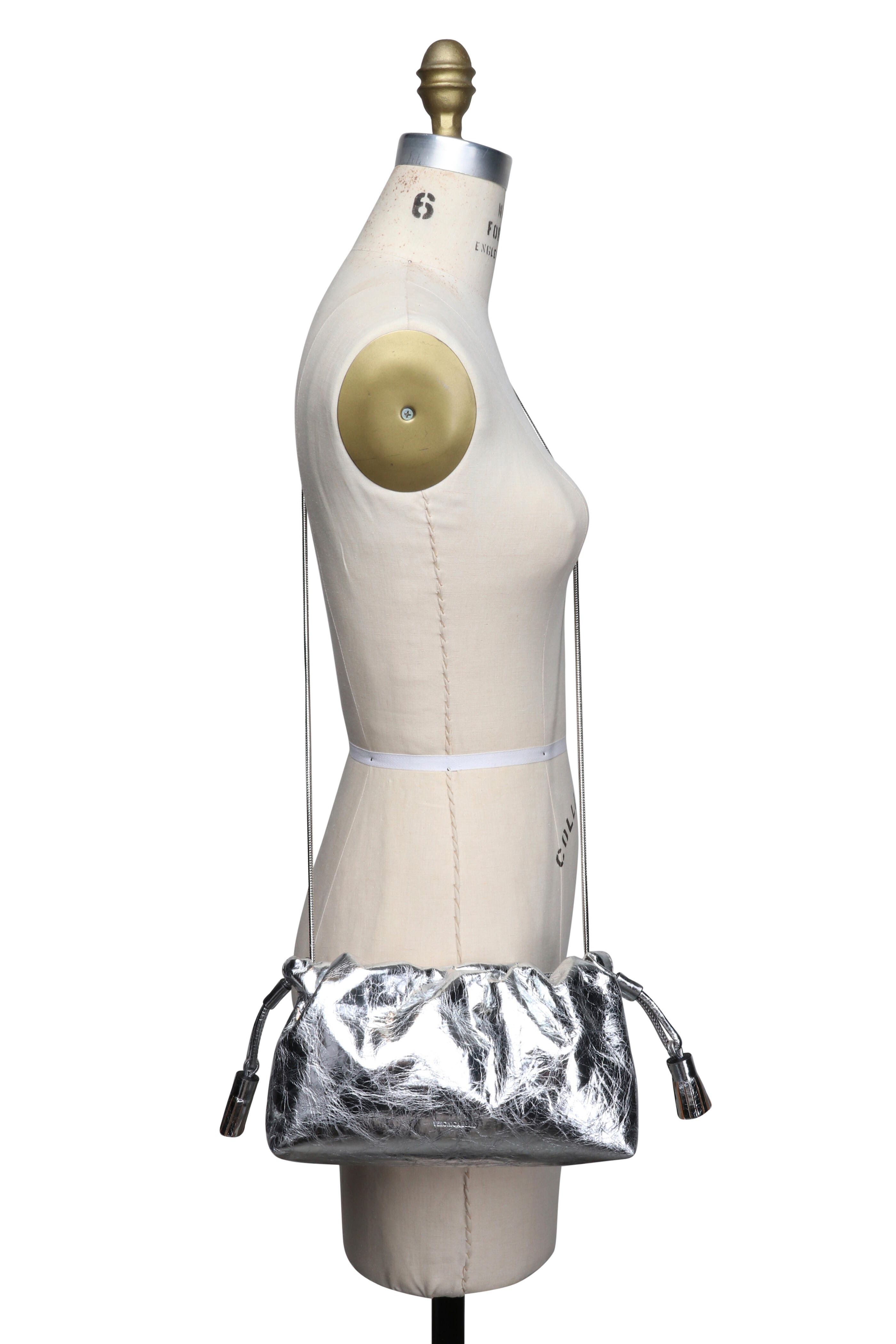 Magnetic clasps. Cinchable top. Crossbody silver snake chain strap. Premium silver leather with a crinkled finish. Leather tassel drawstrings on each end. Interior wall card pocket. Imported. 10.2” L x 3” W x 5.9” H. Strap drop: 23.2”. 100% leather outer. 100% polyester lining.