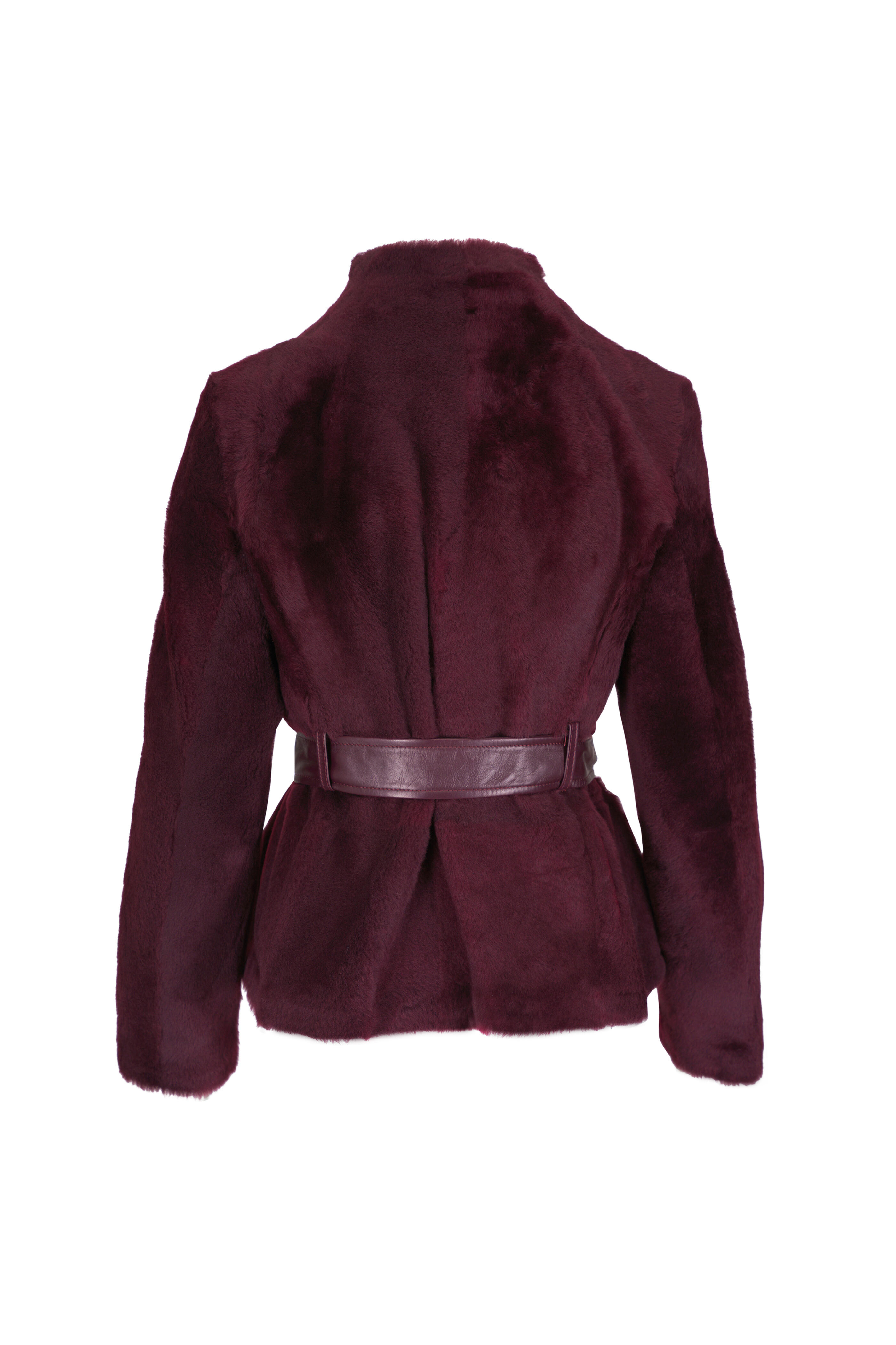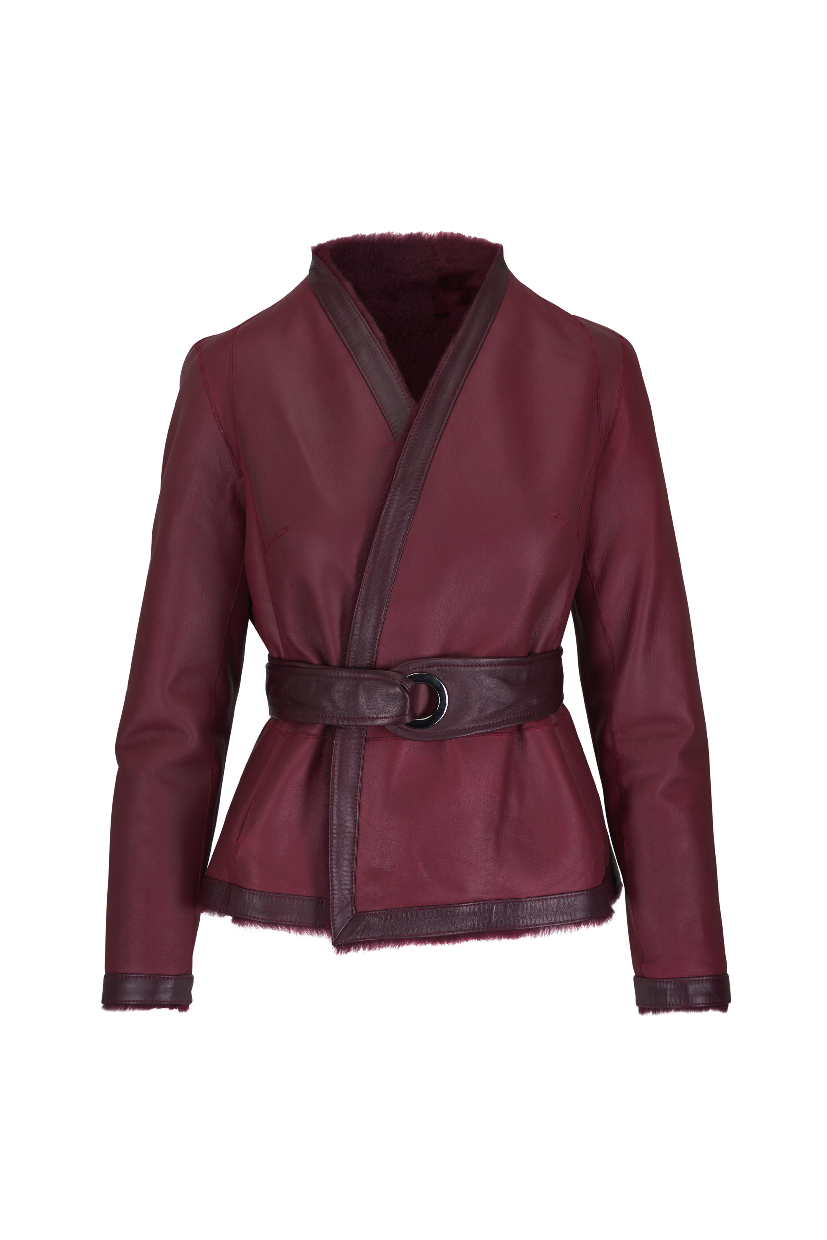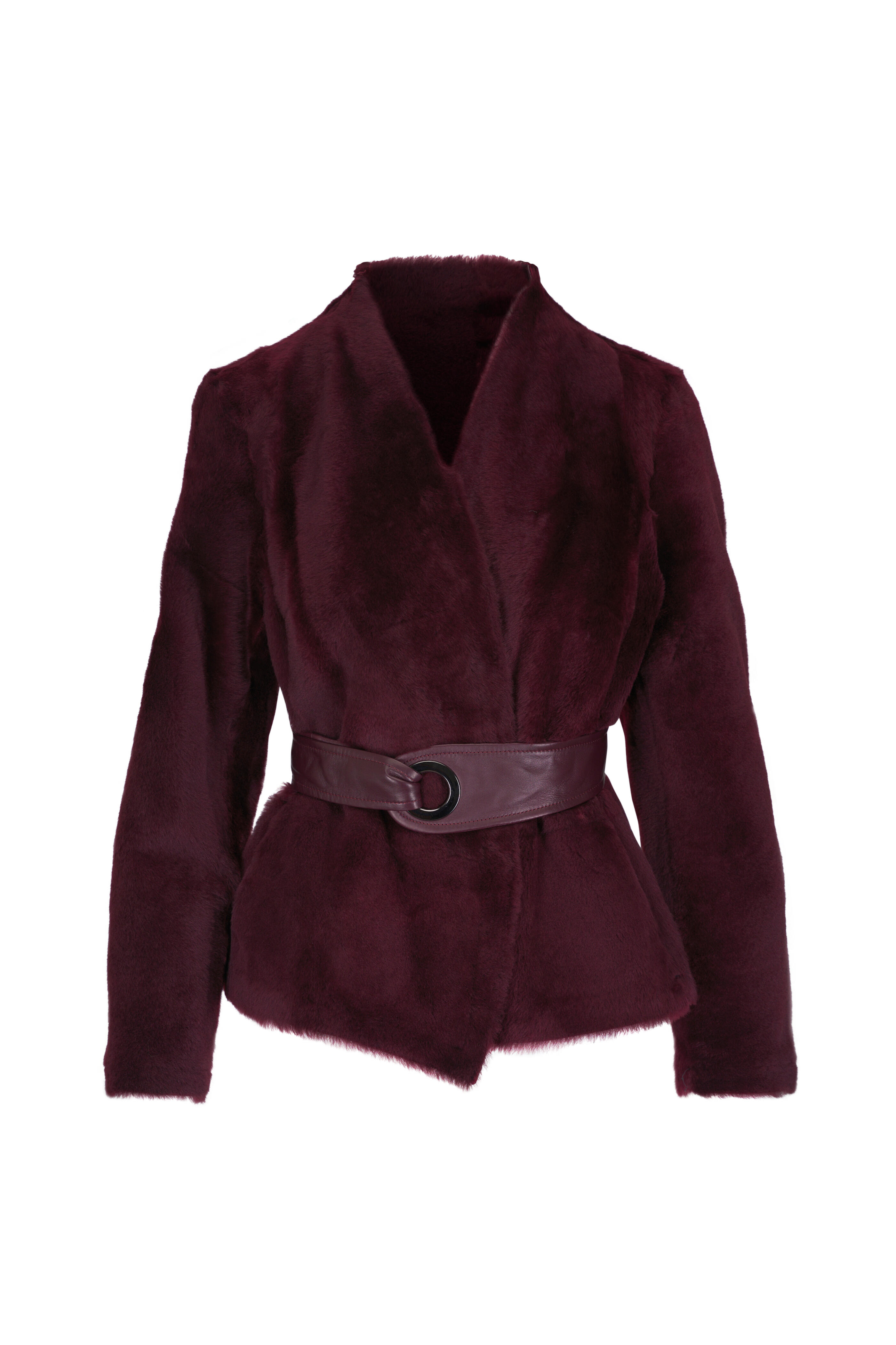 Specialist clean. Collarless v-neckline. Leather belt closure. Reverses to leather. Made in the USA. 100% lambskin shearling.