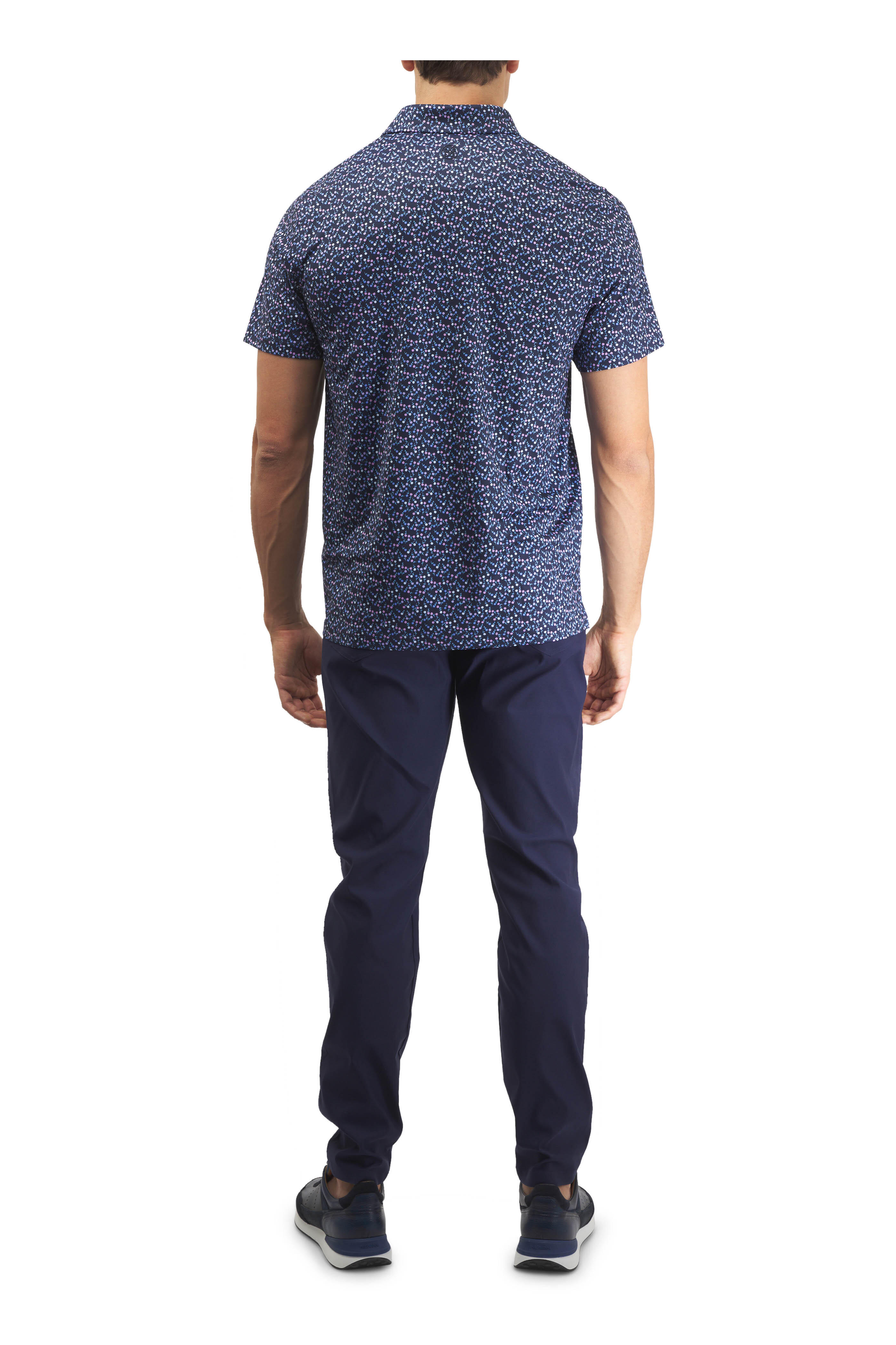Spread collar. Three-button placket. Vented hem. Imported. 92% polyester, 8% spandex. Machine wash.