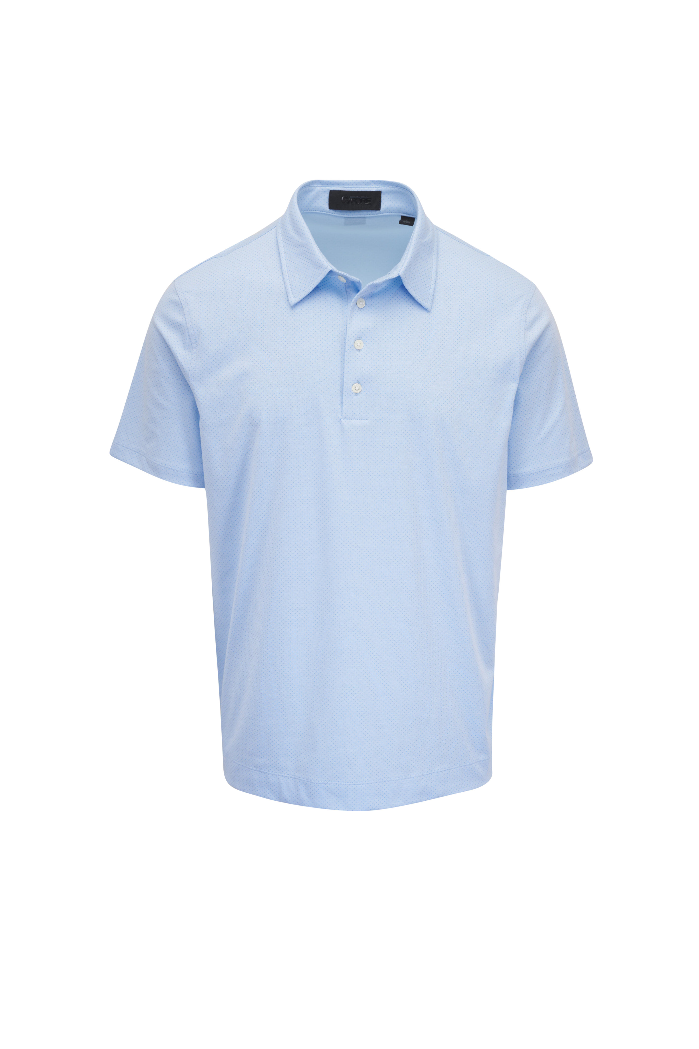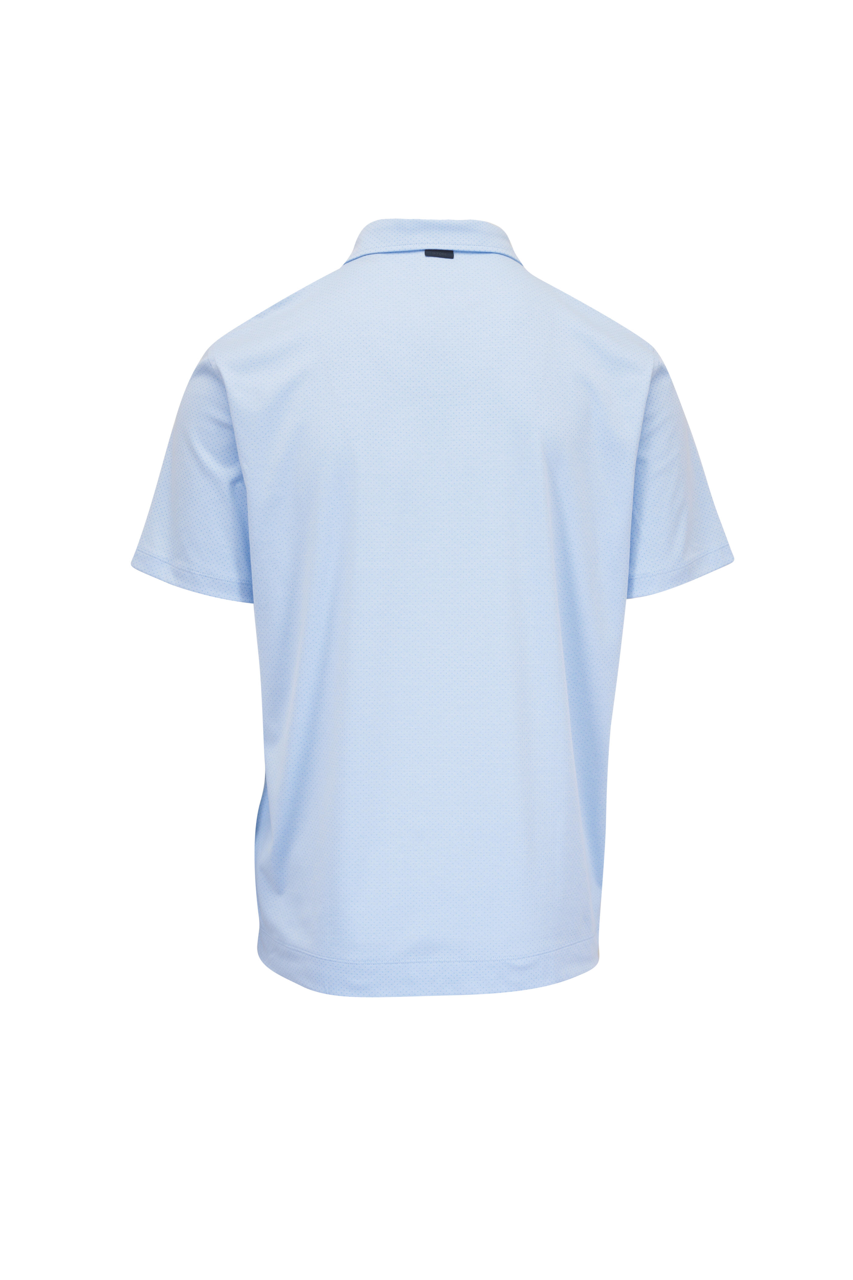 Spread collar. Four button placket. Pullover style. Short sleeves. Vented hem. Imported. Shoulder to hem 29" (size L). 60% cotton, 28% polyamide, 12% elastane. Machine wash.
