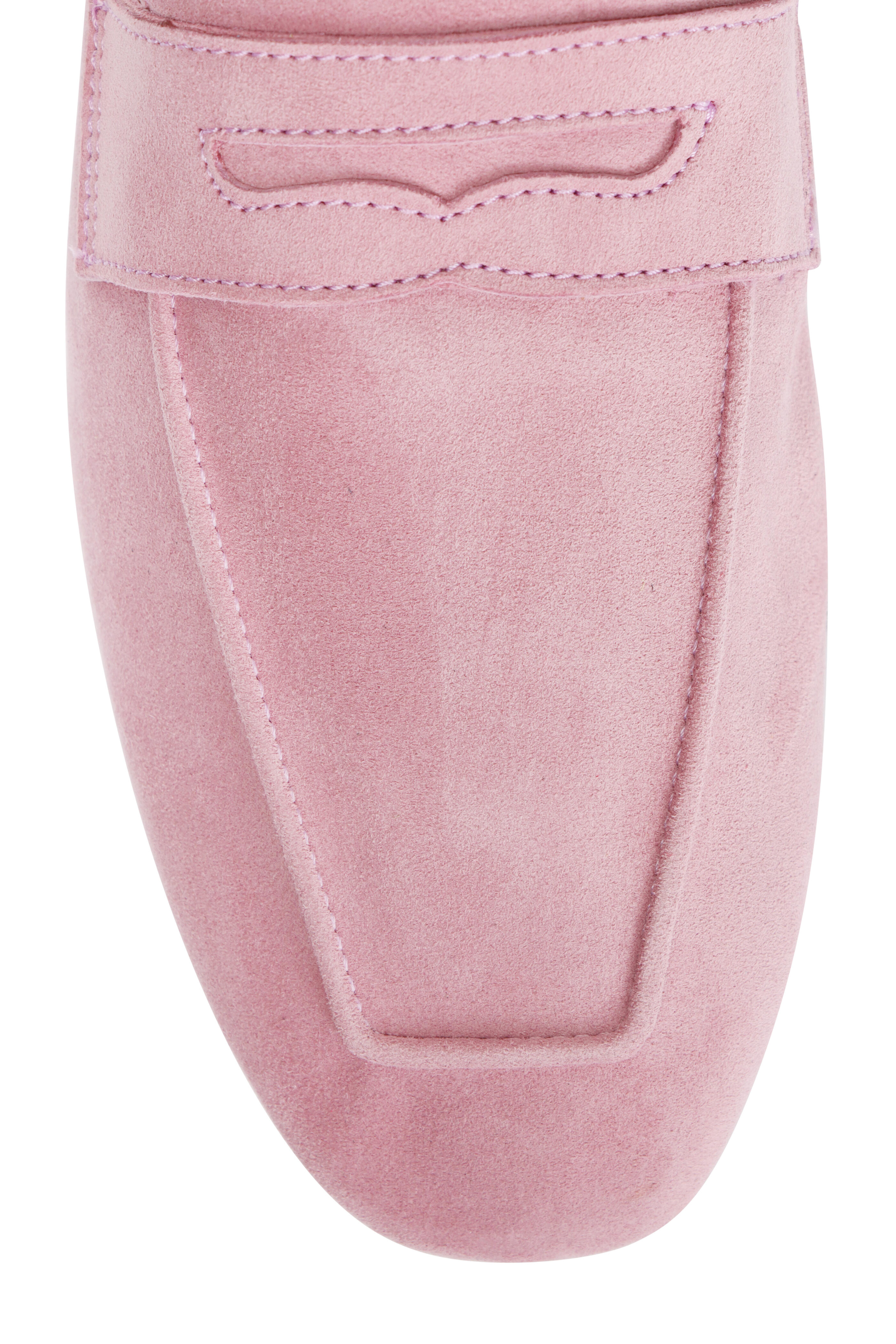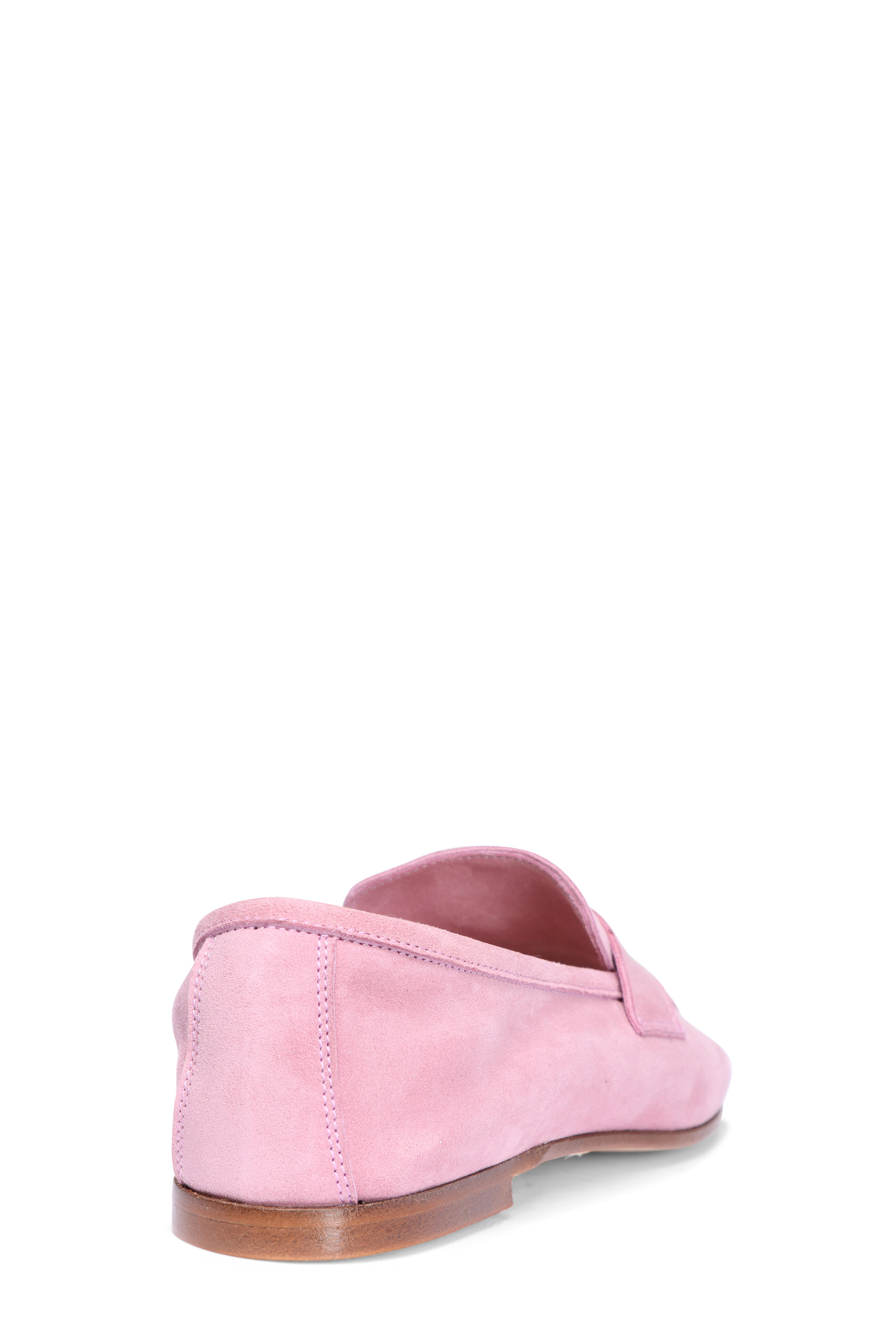 Suede upper. Leather lining and sole. Reinforced apron toe. Notched vamp. Strap with penny holder. Slip-on style. Tonal stitching. Made in Italy.