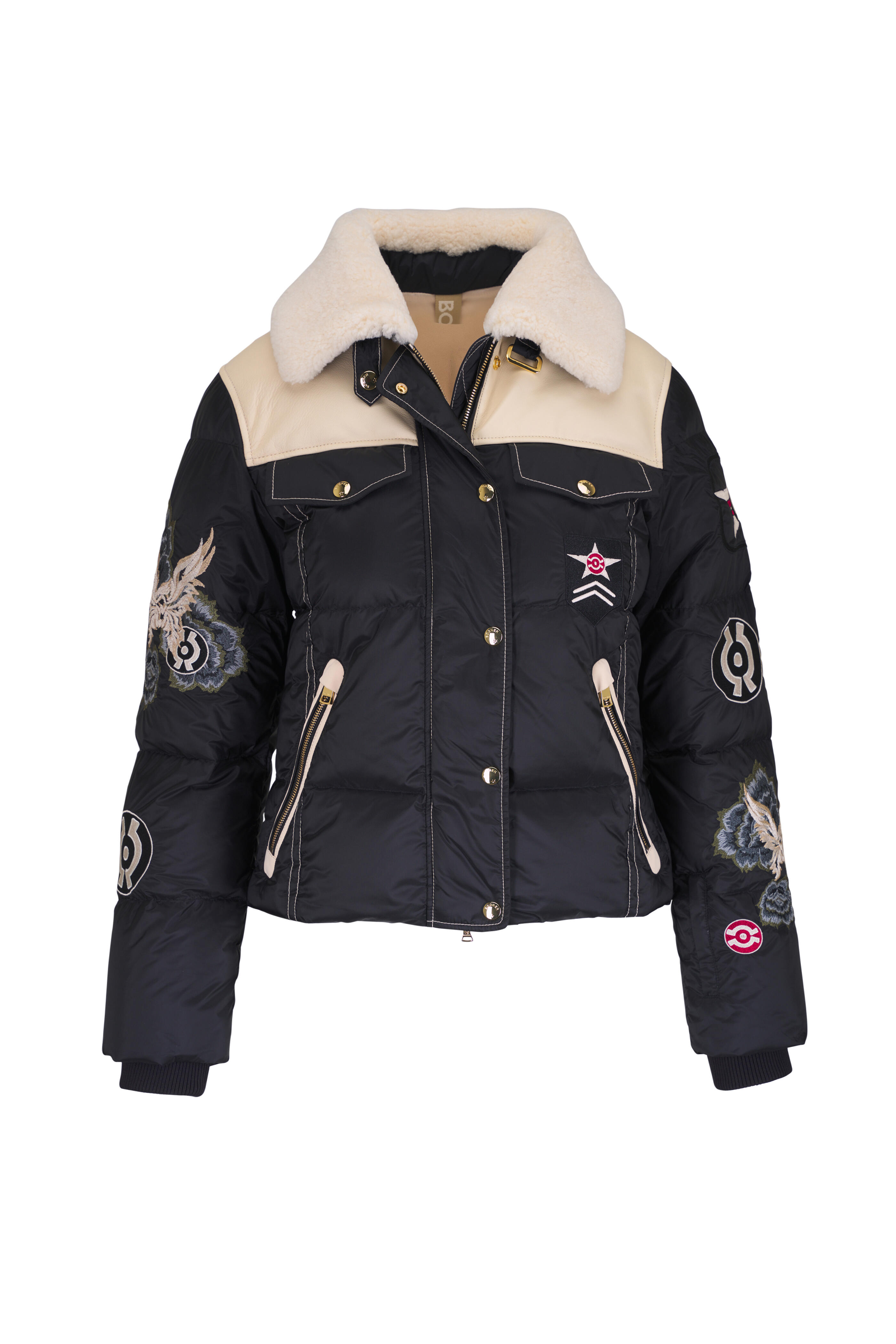 Specialist clean. Turn-down collar with lambskin inside and press stud fastening. Two-way front zip; snap cover. Set-in ribbed waistband with press studs as snow guard. Drawstring hem. One zippered ski pass pocket on the sleeve; two concealed zippered side pockets; one internal pocket. Elasticated snow skirt with snap fasteners on the inside. Ribbed cuffs. Imported. 100% polyamide; fabric 2: 100% polyurethane; trim: 100% lamb; down: 90% goose down, 10% goose feathers.