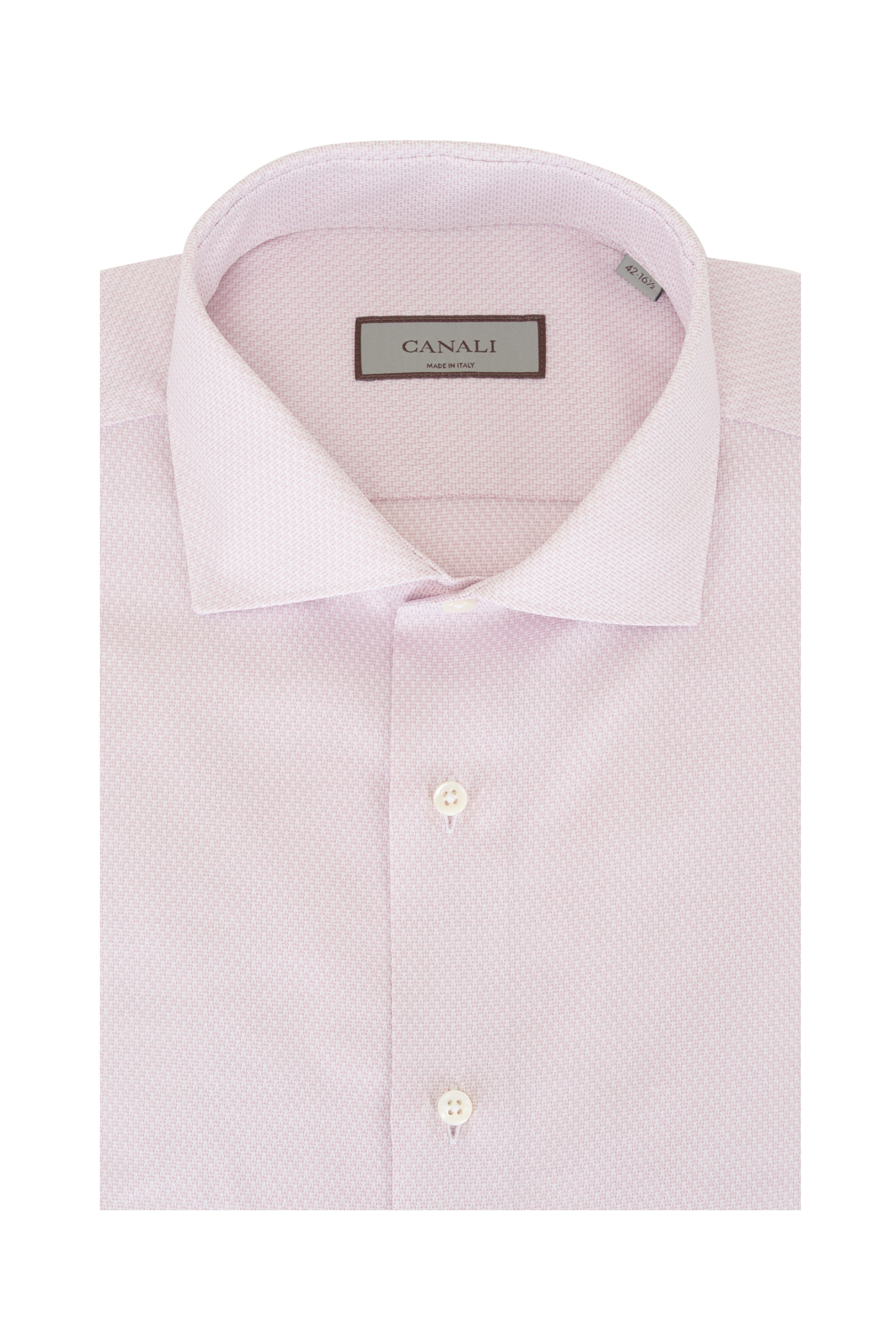 Spread collar. French front button placket. Single button barrel cuffs. Made in Italy. 100% cotton. Machine wash.