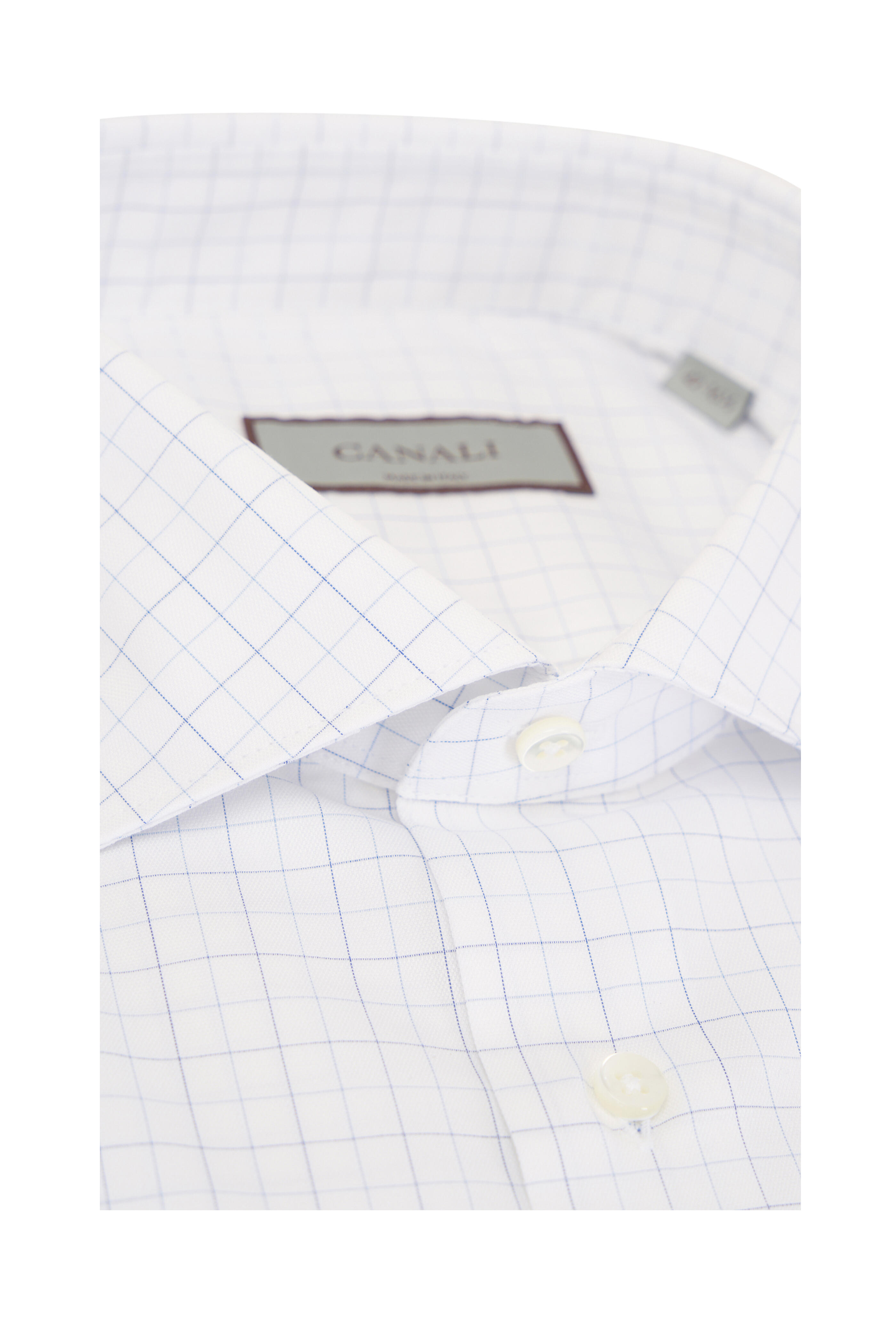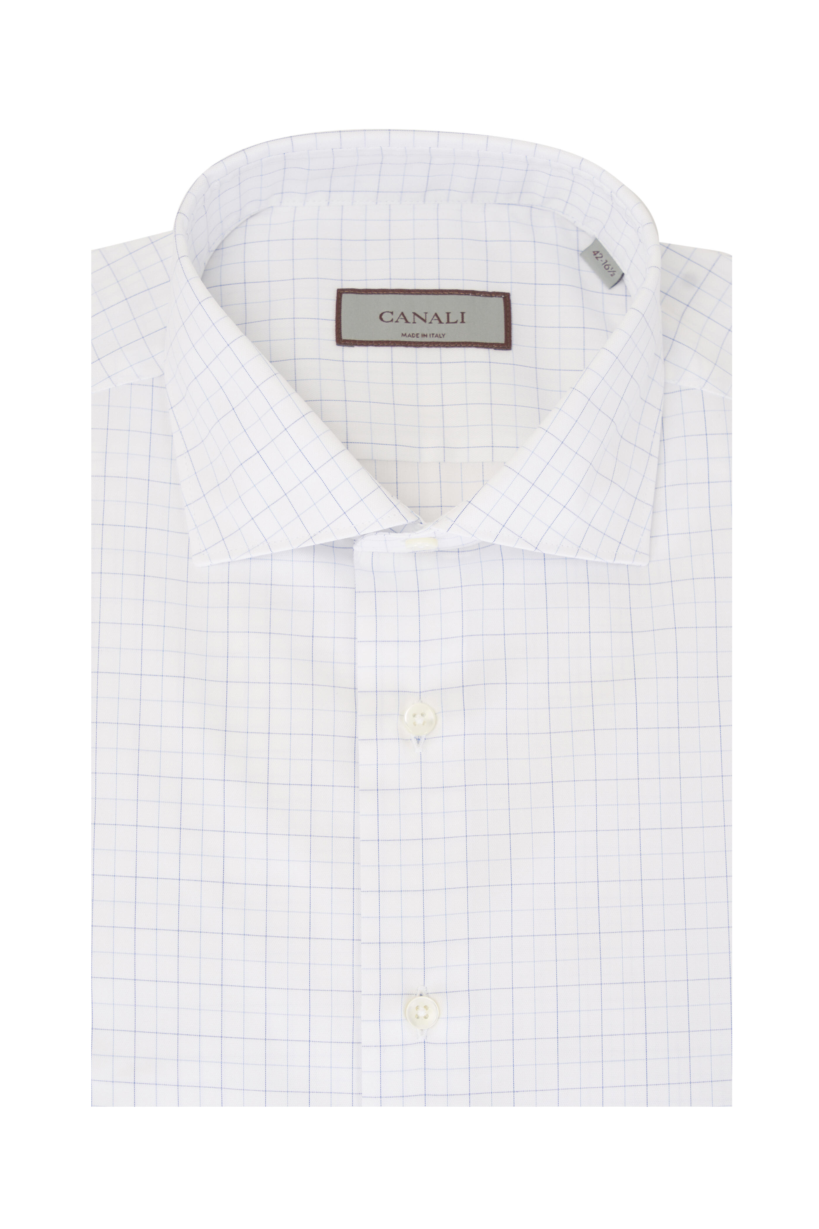 Spread collar. French front button placket. Single button mitered cuffs. Made in Italy. 100% cotton. Machine wash.