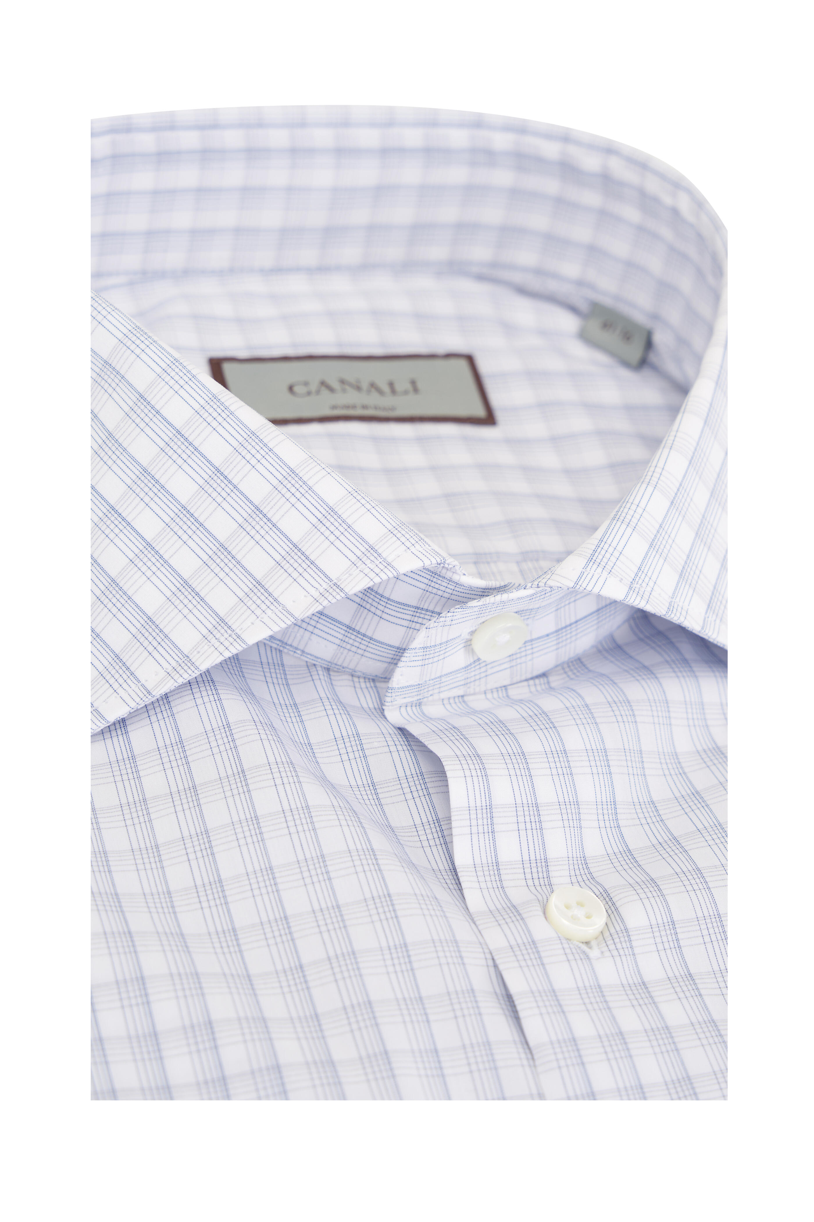 Spread collar. French front button placket. Single button mitered cuffs. Made in Italy. 100% cotton. Machine wash.