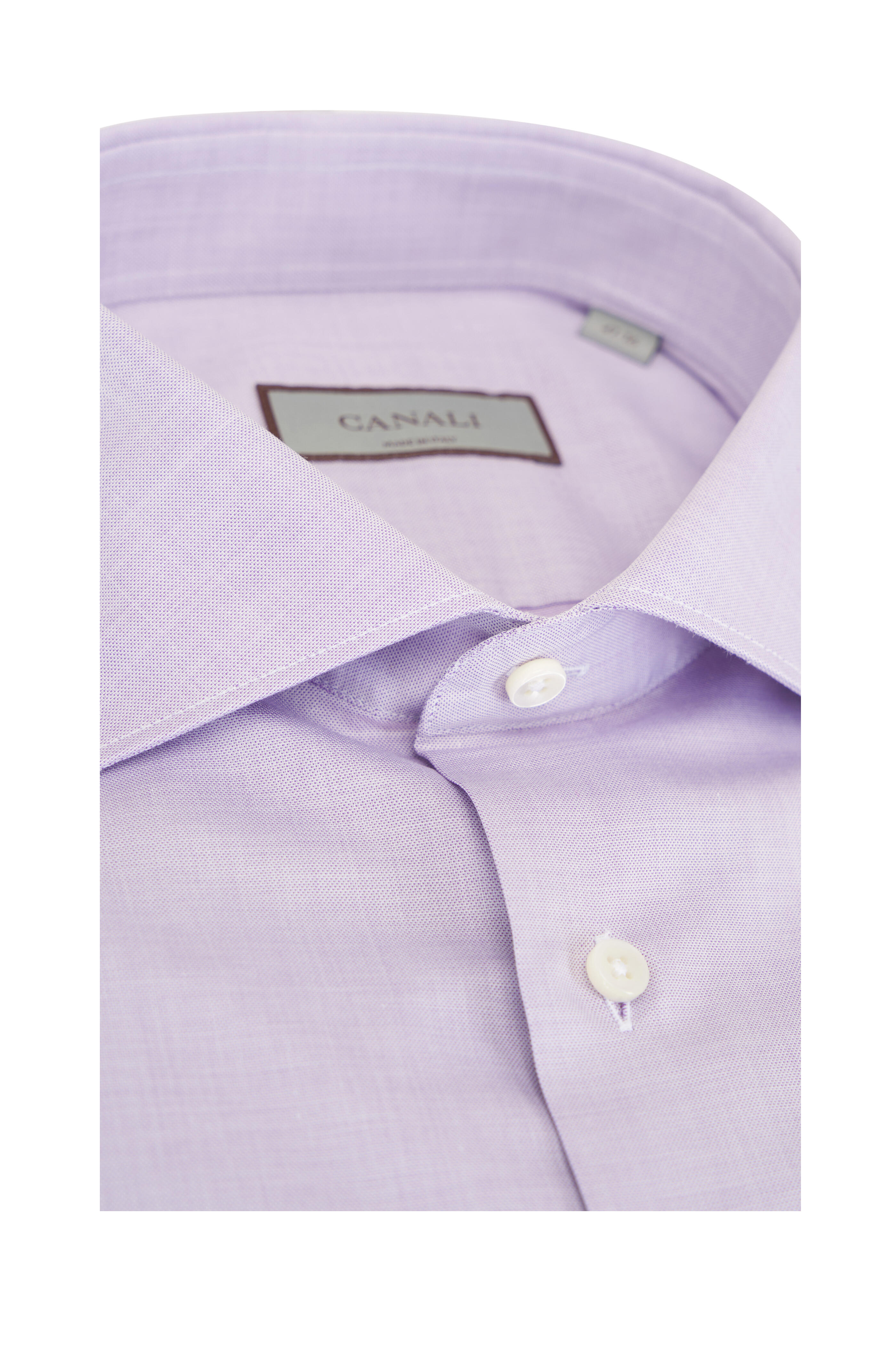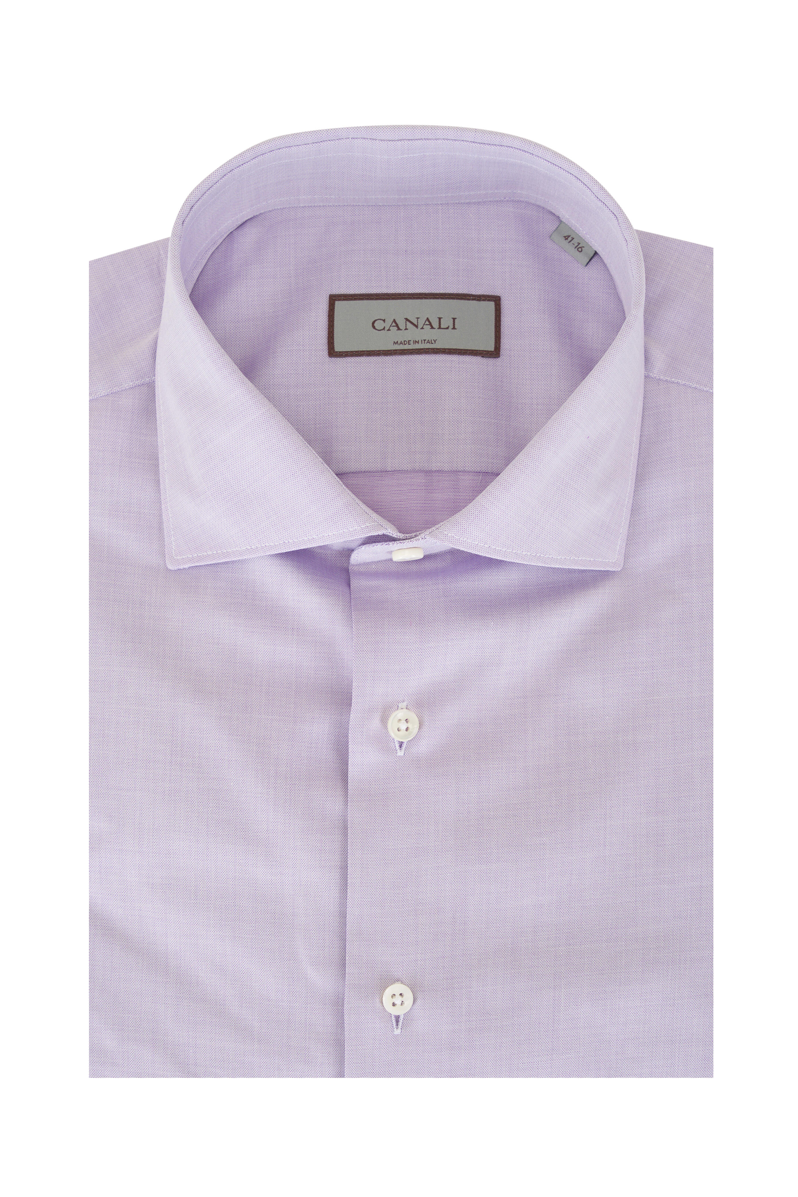 Spread collar. French front button placket. Single button mitered cuffs. Made in Italy. 100% cotton. Machine wash.