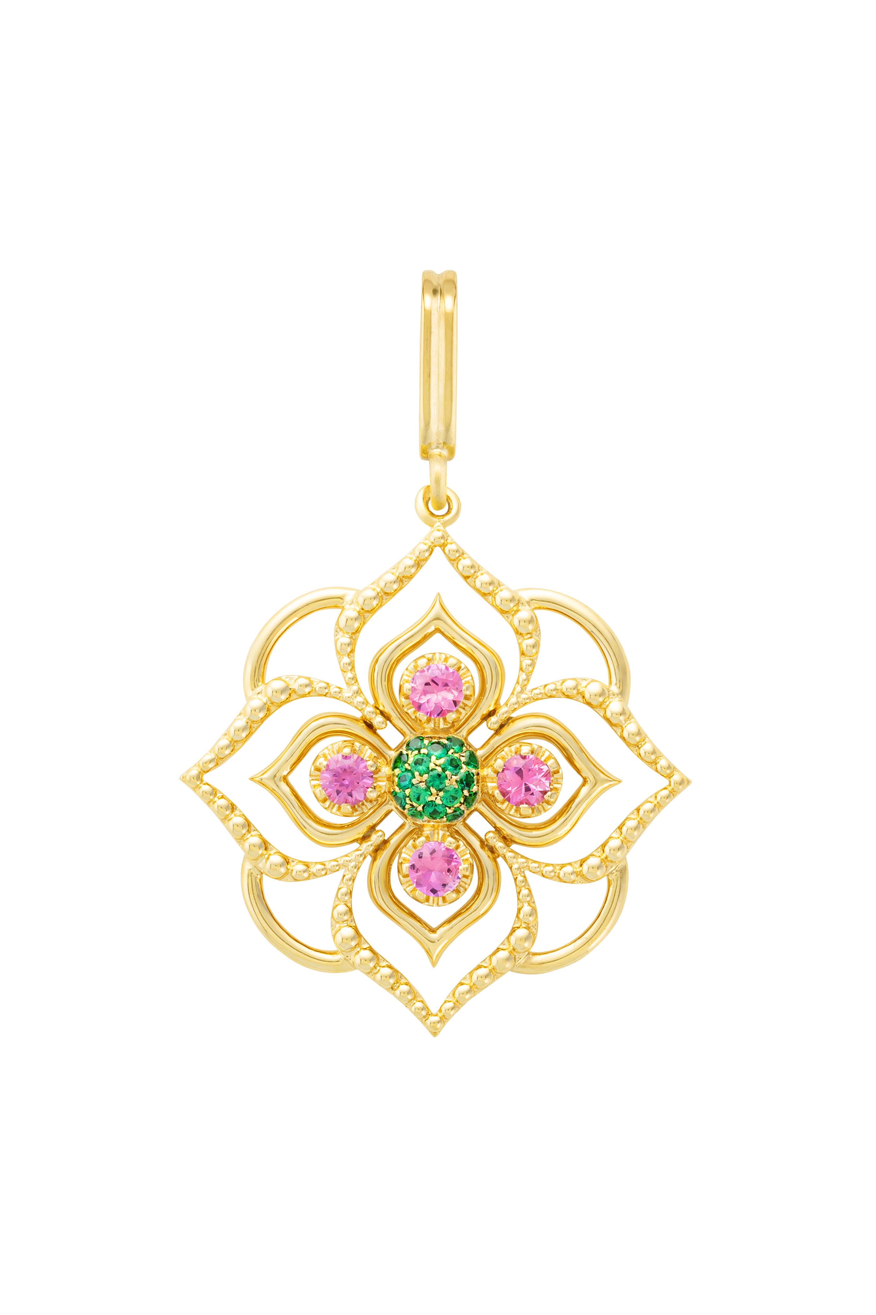 18k Yellow Gold. 0.48 ct Pink Sapphire. 0.14 ct Tsavorite. *Necklace sold separately.