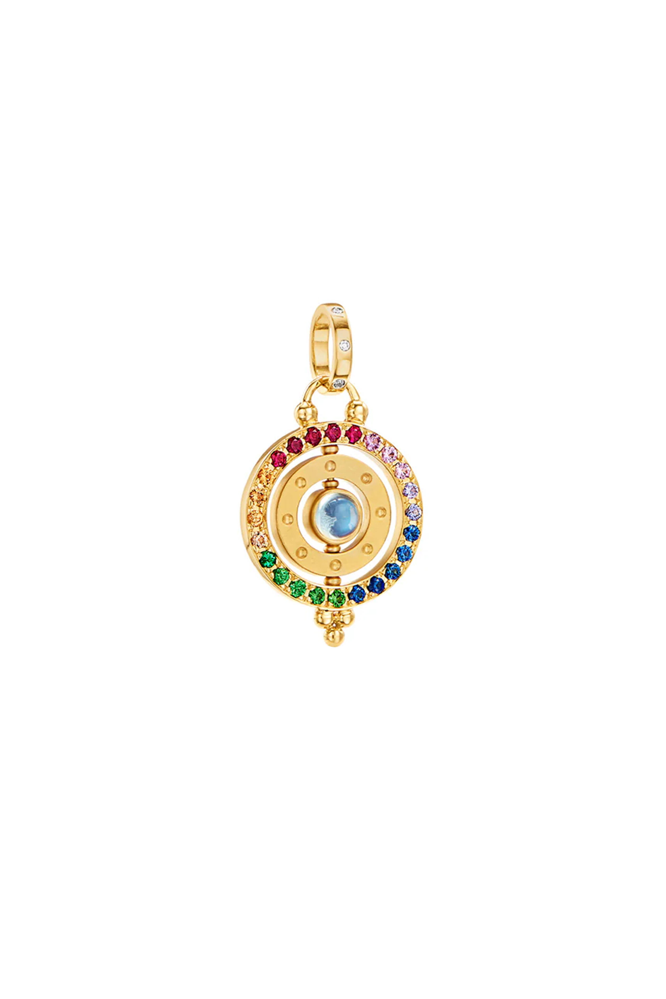 18k yellow gold. Diamond 0.08 total carat weight. Ruby 0.10 total carat weight. Tsavorite 0.10 total carat weight. Blue moonstone 0.30 total carat weight. Mixed sapphires 0.32 total carat weight. Inspired by the ancient theory that Earth was the center of the universe. Bands of gold and colored sapphires, delineating the orbits of the moon and sun, encircle a Blue Moonstone Earth.. Orbit design. Prong setting. Diamond bail. Imported. Dimensions: 1.2” L x 0.6” W.