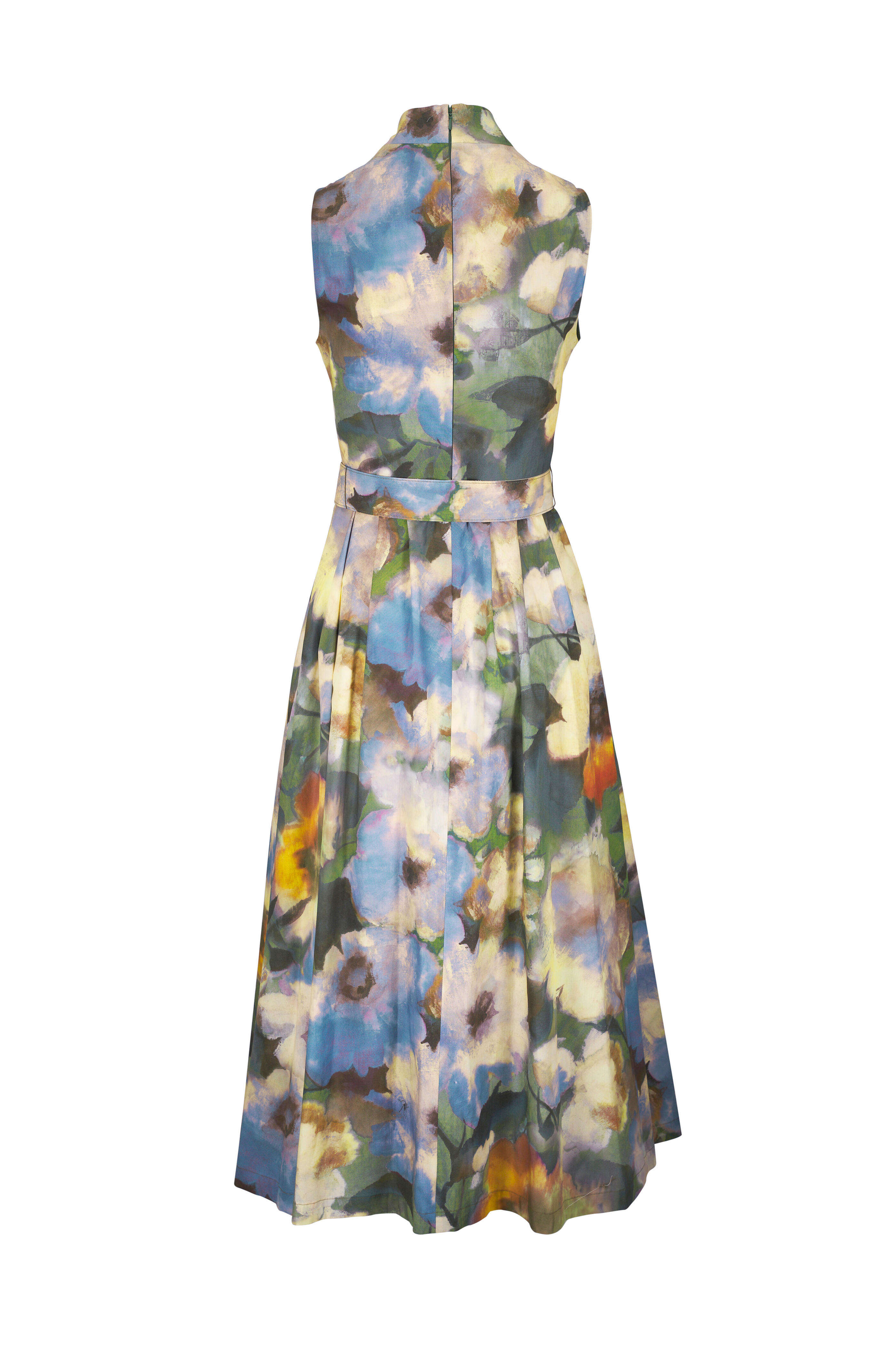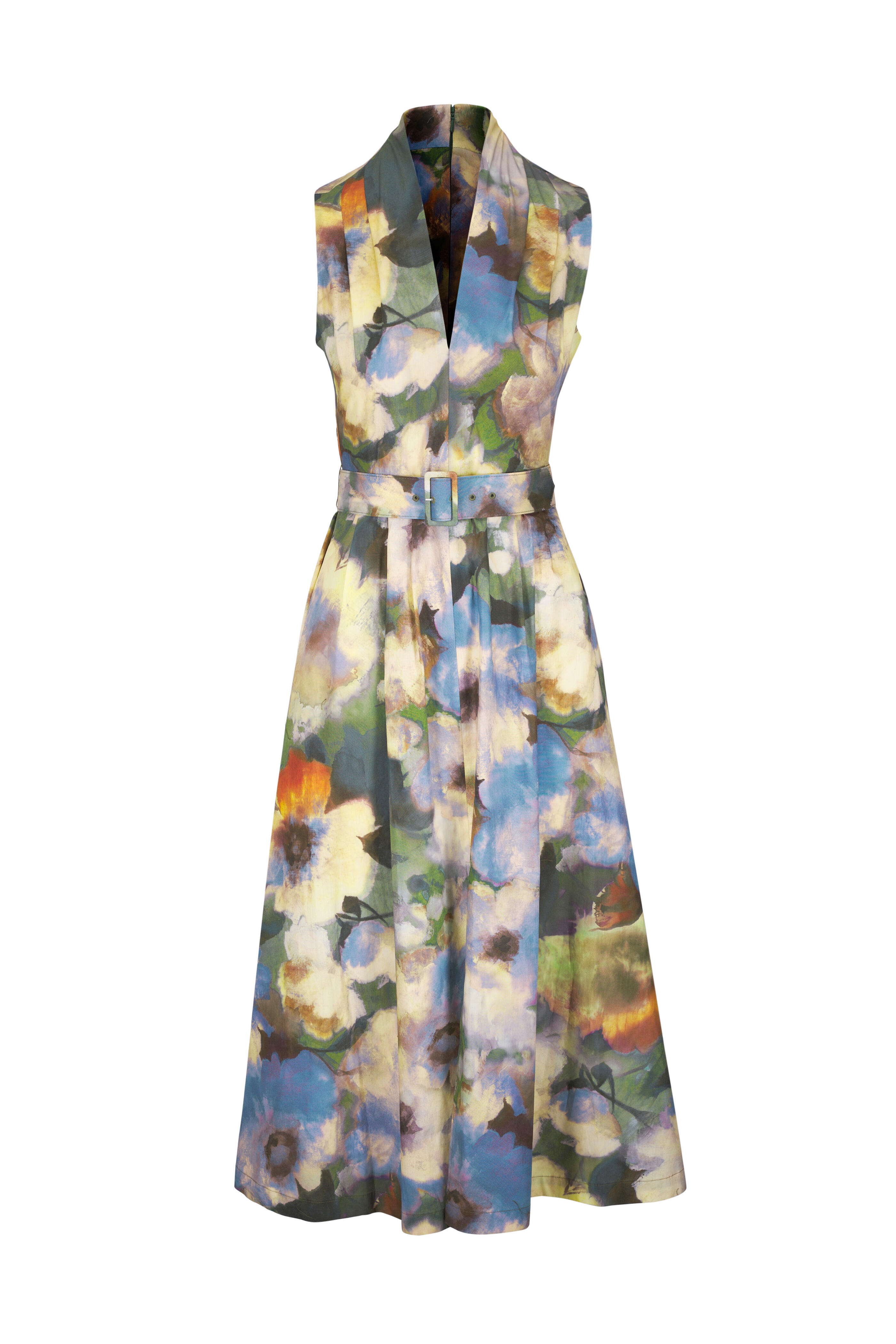 V-neckline. Concealed back zip. Belt loops; adjustable belt. Side slip pockets. Front slit. Made in the USA. Approximately 52" shoulder to hem (measurements taken from size 4). 100% cotton. Dry clean.