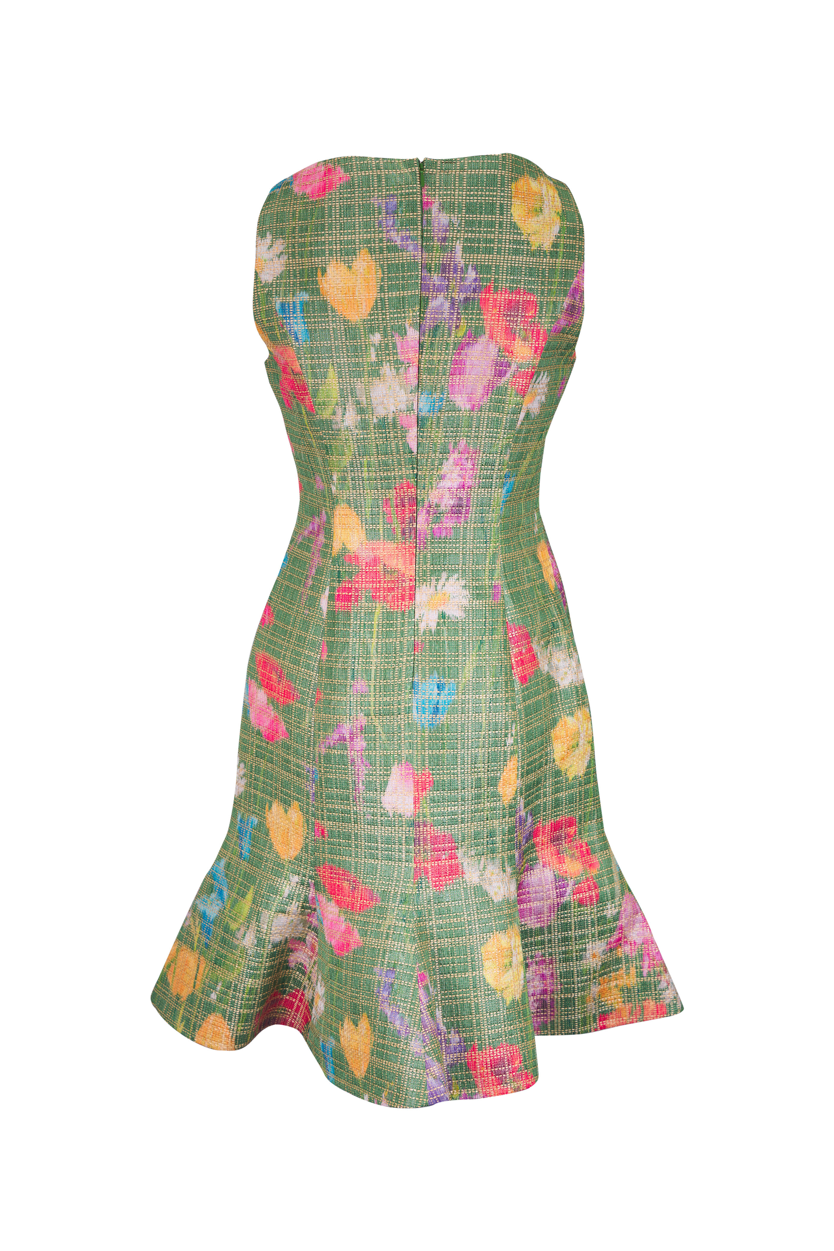 Square neckline. Concealed back zip. Sleeveless. Flounce hem. Made in USA. Shoulder to hem 38" (size 4). 46% polyamide, 43% polyester, 11% metallic; lined. Dry clean.
