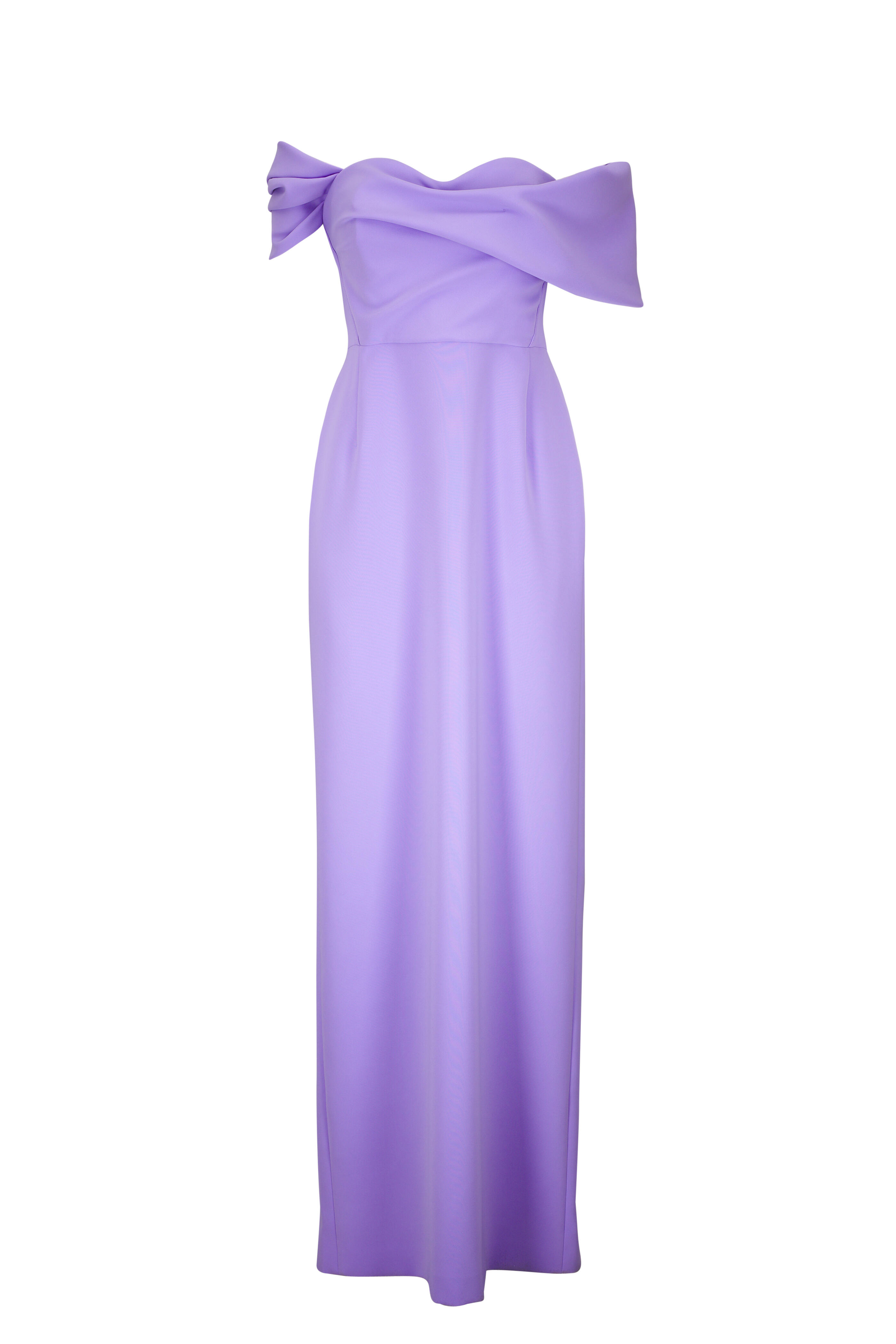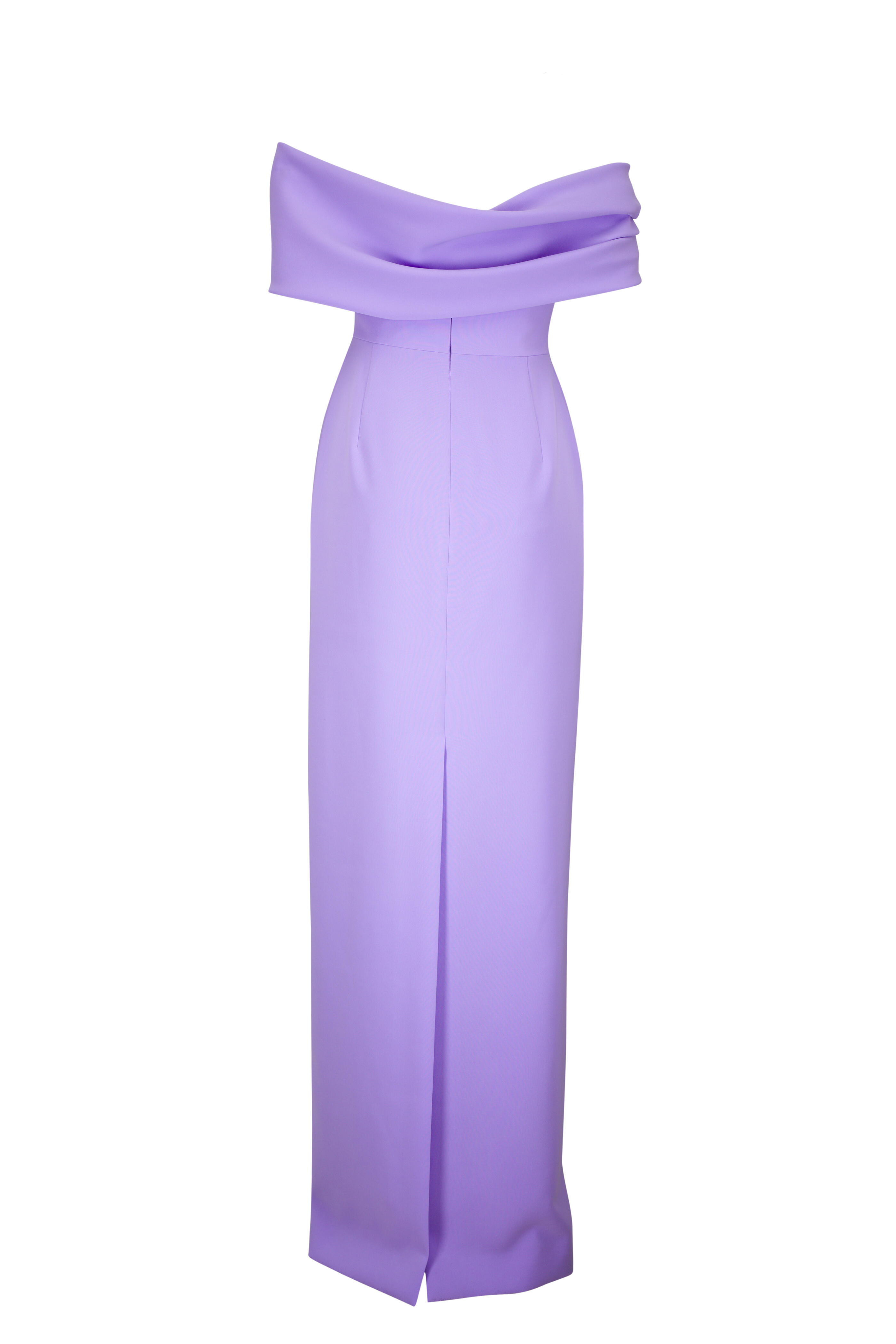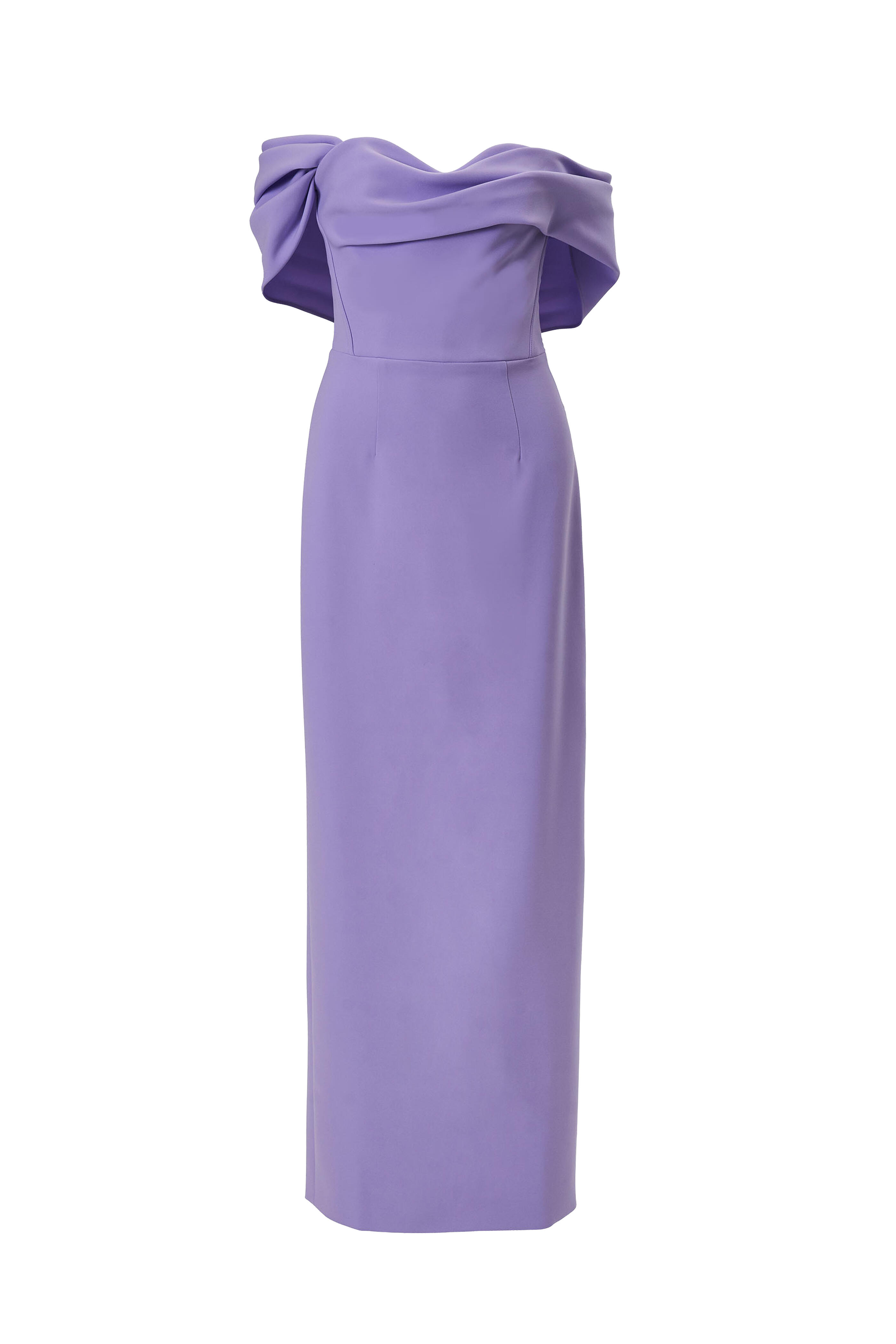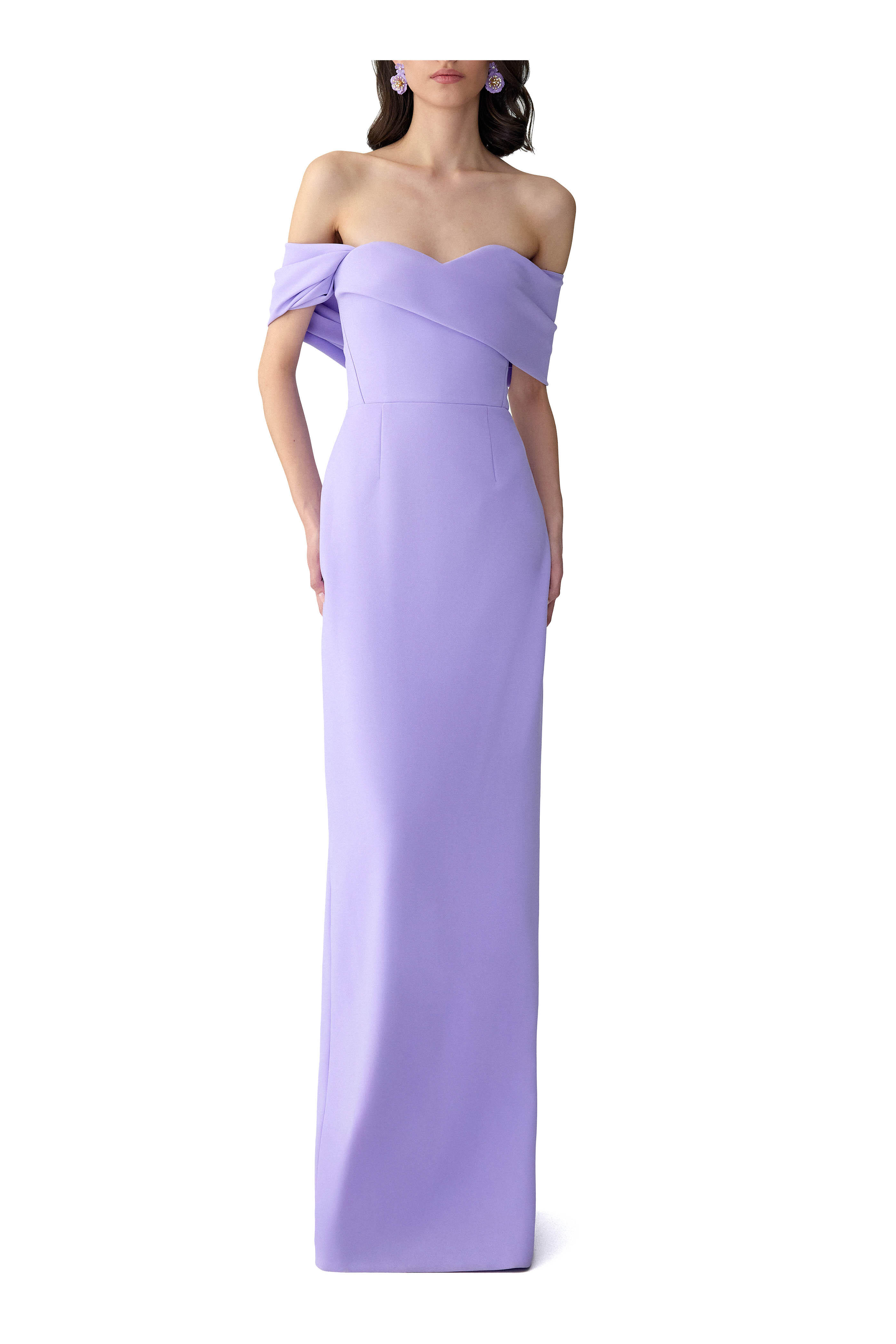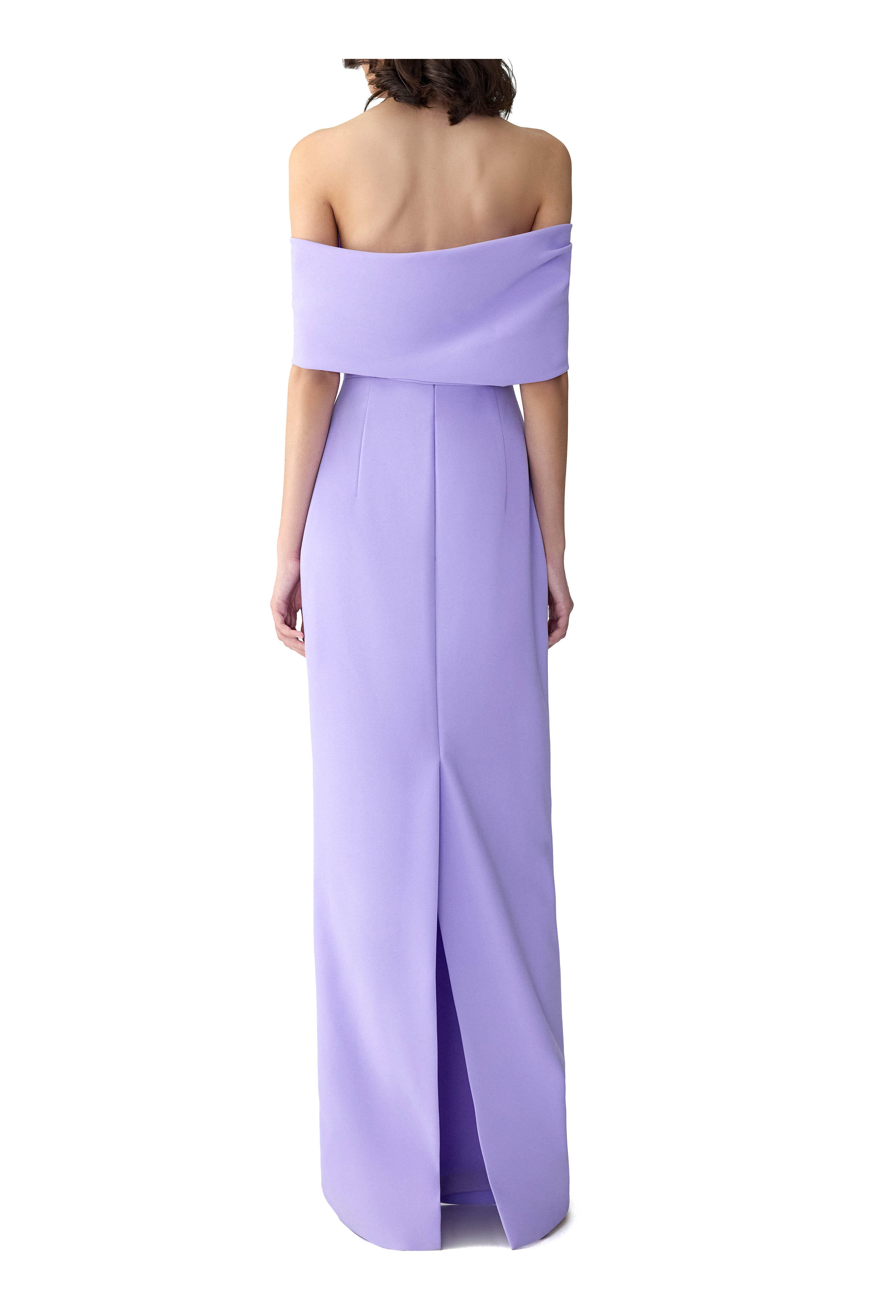 Off-the-shoulder neckline. Concealed back zip closure. Asymmetric short sleeves. Back slit. Made in Italy. 92% polyester, 8% polyurethane. Dry clean.