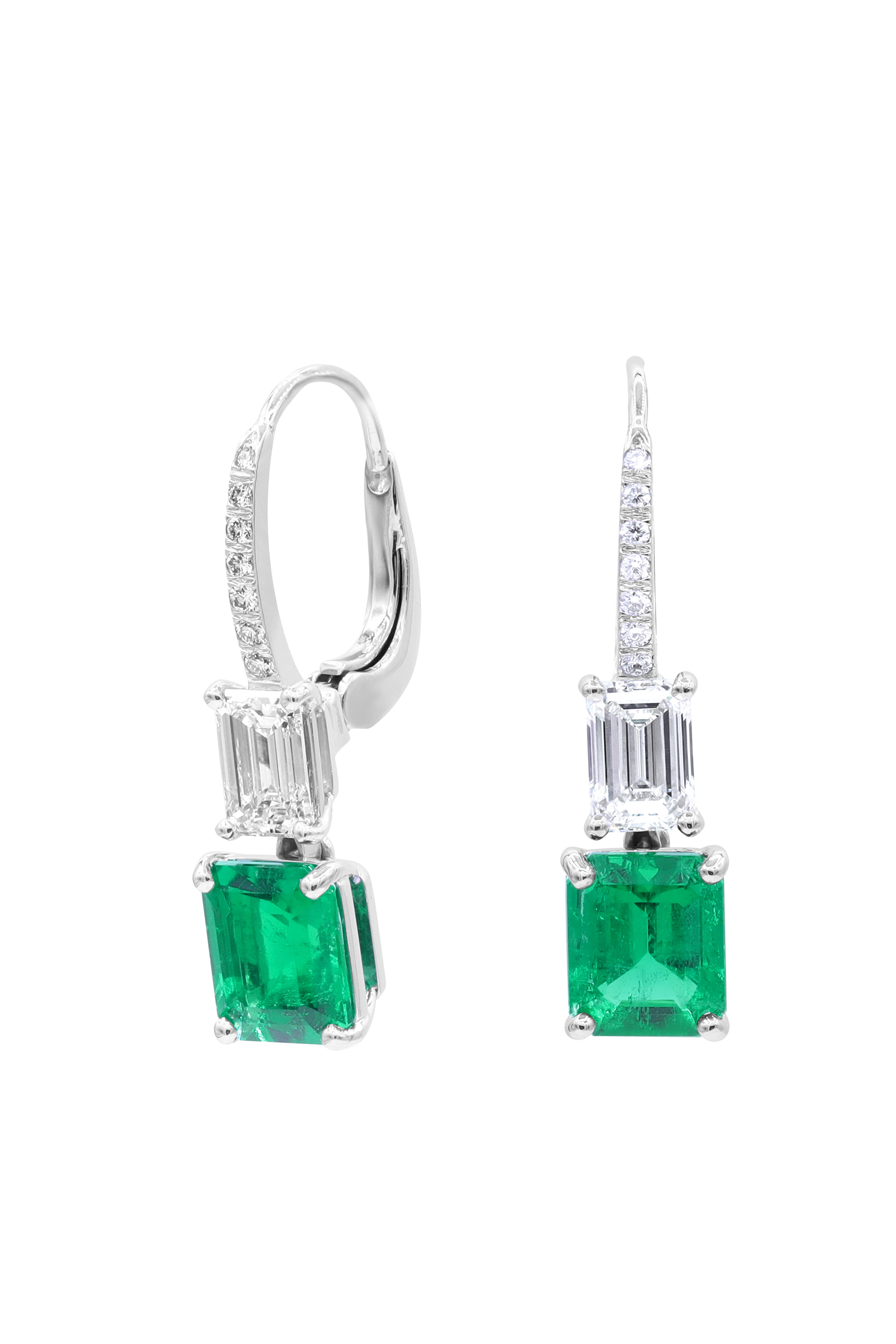 Platinum. 2 Emerald Cut Emeralds 2.56 ct. 2 Emerald Cut Diamonds 1.24 ct. 14 Round Diamonds 0.10 ct.